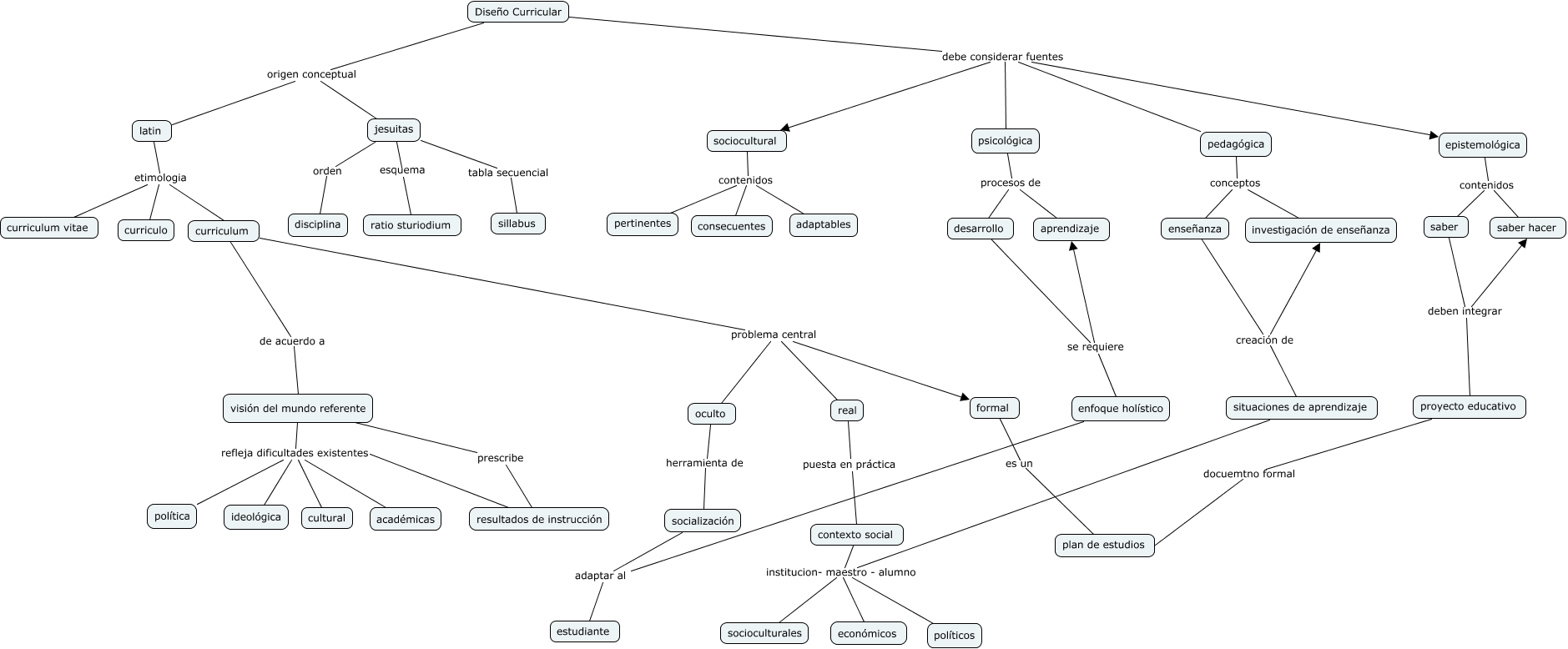 Este Cmap, tiene información relacionada con: DISEÑO CURRICULAR, Diseño Curricular debe considerar fuentes sociocultural, proyecto educativo docuemtno formal plan de estudios, jesuitas esquema ratio sturiodium, socialización adaptar al estudiante, pedagógica conceptos enseñanza, pedagógica conceptos investigación de enseñanza, sociocultural contenidos consecuentes, curriculum de acuerdo a visión del mundo referente, curriculum problema central oculto, curriculum problema central real, real puesta en práctica contexto social, psicológica procesos de desarrollo, sociocultural contenidos adaptables, psicológica procesos de aprendizaje, saber deben integrar proyecto educativo, visión del mundo referente refleja dificultades existentes académicas, desarrollo se requiere enfoque holístico, Diseño Curricular debe considerar fuentes psicológica, latin etimologia curriculum vitae, visión del mundo referente refleja dificultades existentes política