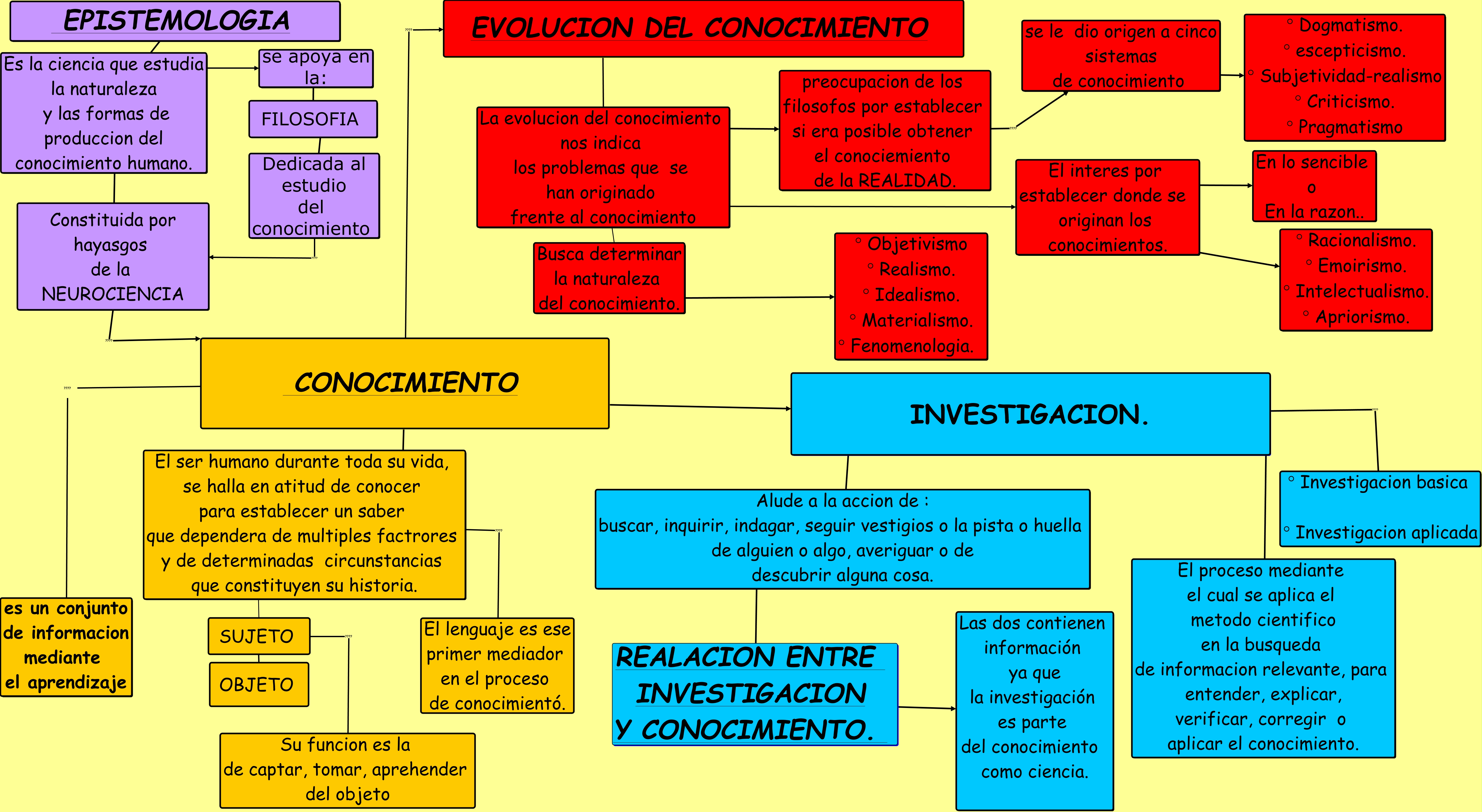 Este Cmap, tiene información relacionada con: MAPA CONCEPTUAL, preocupacion de los filosofos por establecer si era posible obtener el conociemiento de la REALIDAD. ???? se le dio origen a cinco sistemas de conocimiento, SUJETO ???? Su funcion es la de captar, tomar, aprehender del objeto, Constituida por hayasgos de la NEUROCIENCIA ???? CONOCIMIENTO, Busca determinar la naturaleza del conocimiento. ???? ° Objetivismo ° Realismo. ° Idealismo. ° Materialismo. ° Fenomenologia., REALACION ENTRE INVESTIGACION Y CONOCIMIENTO. ???? Las dos contienen información ya que la investigación es parte del conocimiento como ciencia., El ser humano durante toda su vida, se halla en atitud de conocer para establecer un saber que dependera de multiples factrores y de determinadas circunstancias que constituyen su historia. Interactuan SUJETO, Es la ciencia que estudia la naturaleza y las formas de produccion del conocimiento humano. ???? se apoya en la:, se apoya en la: ???? FILOSOFIA, CONOCIMIENTO ???? El ser humano durante toda su vida, se halla en atitud de conocer para establecer un saber que dependera de multiples factrores y de determinadas circunstancias que constituyen su historia., Dedicada al estudio del conocimiento ???? Constituida por hayasgos de la NEUROCIENCIA, INVESTIGACION. ???? Alude a la accion de : buscar, inquirir, indagar, seguir vestigios o la pista o huella de alguien o algo, averiguar o de descubrir alguna cosa., Alude a la accion de : buscar, inquirir, indagar, seguir vestigios o la pista o huella de alguien o algo, averiguar o de descubrir alguna cosa. ???? REALACION ENTRE INVESTIGACION Y CONOCIMIENTO., La evolucion del conocimiento nos indica los problemas que se han originado frente al conocimiento ???? El interes por establecer donde se originan los conocimientos., CONOCIMIENTO ???? INVESTIGACION., El interes por establecer donde se originan los conocimientos. ???? ° Racionalismo. ° Emoirismo. ° Intelectualismo. ° Apriorismo., INVESTIGACION. ???? El proceso mediante el cual se aplica el metodo cientifico en la busqueda de informacion relevante, para entender, explicar, verificar, corregir o aplicar el conocimiento., El interes por establecer donde se originan los conocimientos. ???? En lo sencible o En la razon.., La evolucion del conocimiento nos indica los problemas que se han originado frente al conocimiento ???? preocupacion de los filosofos por establecer si era posible obtener el conociemiento de la REALIDAD., SUJETO ???? OBJETO, EVOLUCION DEL CONOCIMIENTO ???? La evolucion del conocimiento nos indica los problemas que se han originado frente al conocimiento