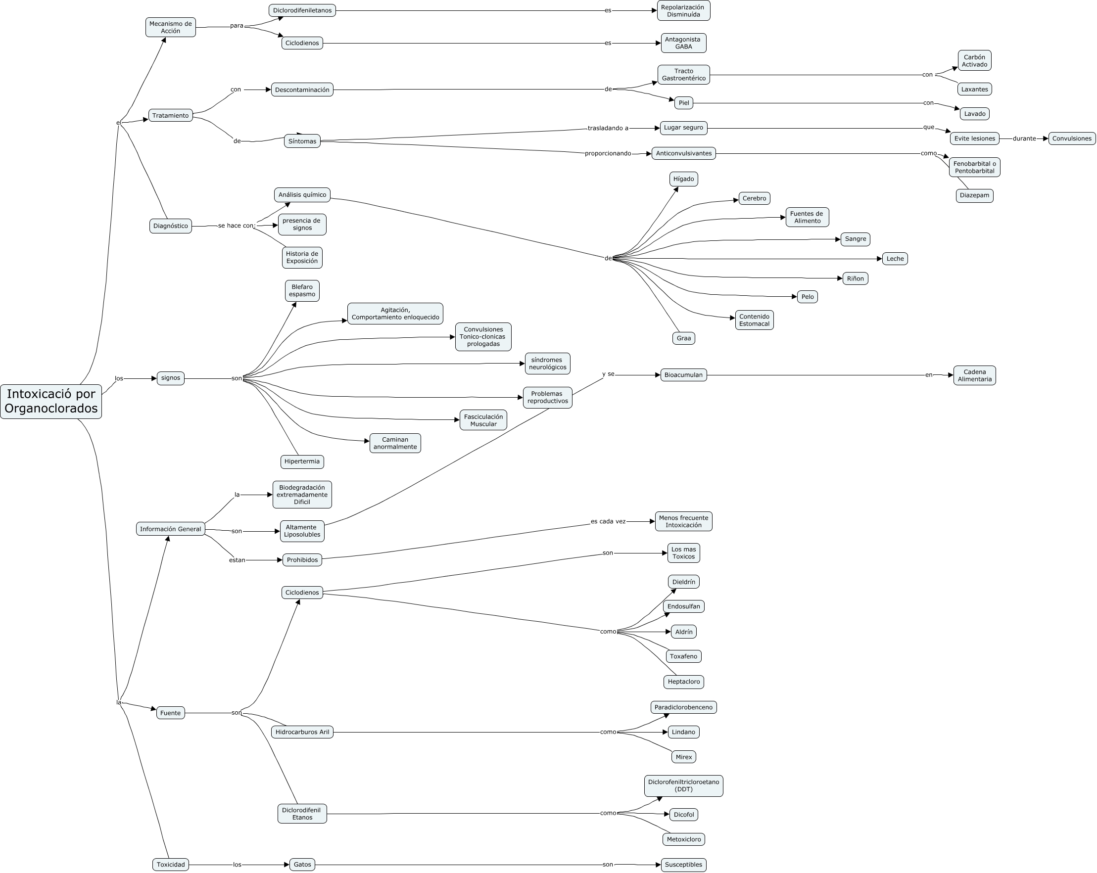 Este Cmap, tiene información relacionada con: Organoclorados, Prohibidos es cada vez Menos frecuente Intoxicación, Diclorodifeniletanos es Repolarización Disminuída, signos son Agitación, Comportamiento enloquecido, Ciclodienos como Heptacloro, Tratamiento con Descontaminación, Tracto Gastroentérico con Carbón Activado, Mecanismo de Acción para Diclorodifeniletanos, Ciclodienos como Toxafeno, Análisis químico de Contenido Estomacal, Ciclodienos son Los mas Toxicos, Intoxicació por Organoclorados los signos, Diagnóstico se hace con: presencia de signos, signos son síndromes neurológicos, Análisis químico de Graa, Altamente Liposolubles y se Bioacumulan, signos son Hipertermia, Anticonvulsivantes como Fenobarbital o Pentobarbital, Diclorodifenil Etanos como Diclorofeniltricloroetano (DDT), Mecanismo de Acción para Ciclodienos, Análisis químico de Leche