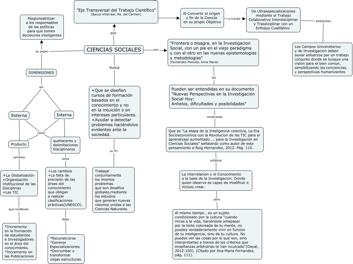 Este Cmap, tiene información relacionada con: MAPA CONCEPTUAL CIENCIAS SOCIALES, "Eje Transversal del Trabajo Científico" (Bacca-Villarreal, Ma. del Carmen) ???? ????, +Que se diseñen cursos de formación basados en el conocimiento y no en la intuición o en intereses particulares. +Ayudar a detectar problemas haciéndolos evidentes ante la sociedad. su fin Trabajar conjuntamente los mismos problemas que son desafíos globales,mediante los estudios que generan nuevas visiones unidas a las Ciencias Naturales., Interna como quehaceres y delimitaciones Disciplinares, "Frontera o bisagra, en la Investigacion Social, con un pie en el viejo paradigma y con el otro en las nuevas epistemologias y metodologias" (Fernandez-Poncela, Anna Maria) asi Pueden ser entendidas en su documento "Nuevas Perspectivas en la Investigación Social Hoy: Anhelos, dificultades y posibilidades", Externa como Producto, quehaceres y delimitaciones Disciplinares retos +Los cambios +La falta de precisión de las áreas del conocimiento que obligan a realizar clasificaciones prácticas(UNESCO)., +La Globalización +Organización Institucional de las Disciplinas +Las TIC que conllevan *Incremento en la formación de estudiantes e Investigadores en el área del conocimiento. *Incremento en las Publicaciones, Pueden ser entendidas en su documento "Nuevas Perspectivas en la Investigación Social Hoy: Anhelos, dificultades y posibilidades" mostrando Que es "La etapa de la Inteligencia colectiva, La Era Socioeconomica con la Revolucion de las TIC para el aprendizaje aumentado..., para la Investigación en Ciencias Sociales" señalando como autor de este pensamiento a Reig Hernandez, 2012. Pág. 110., CIENCIAS SOCIALES son "Eje Transversal del Trabajo Científico" (Bacca-Villarreal, Ma. del Carmen), CIENCIAS SOCIALES su papel DIMENSIONES, Interna como Producto, De Ultraespecializaciones mediante el Trabajo Colaborativo Interdisciplinar y Trasdiciplinar con un Enfoque Cualitativo ambientes Los Campos Universitarios y de Investigacion deben aunar esfuerzos par un trabajo conjunto donde se busque una vision para el bien comun, sensibilizando las conciencias, y perspectivas humanizantes, DIMENSIONES así Interna, La interrelacion y el Conocimiento a la base de la Investigacion. Donde quien observa es capaz de modificar e incluso crear. pero Al mismo tiempo , es un sujeto condicionado por la cultura "cuando miras a la vida, haciendola antepasar por la lente coloreada de tu mente, no puedes verdaderamente vivir en funcion de tu inteligencia, sino de tu cultura. No puedes ver las cosas por lo que son, sino interpretarlas a traves de los criterios que enseñanzas arbitrarias te han inculcado"(Dayal, 2012:105). (Citado por Ana Maria Fernandez, pág. 111)., Interna ???? quehaceres y delimitaciones Disciplinares, DIMENSIONES así Externa, CIENCIAS SOCIALES busca +Que se diseñen cursos de formación basados en el conocimiento y no en la intuición o en intereses particulares. +Ayudar a detectar problemas haciéndolos evidentes ante la sociedad., Al Convertir el origen y fin de la Ciencia en su propio Objetivo a través De Ultraespecializaciones mediante el Trabajo Colaborativo Interdisciplinar y Trasdiciplinar con un Enfoque Cualitativo, +Los cambios +La falta de precisión de las áreas del conocimiento que obligan a realizar clasificaciones prácticas(UNESCO). debe *Reconstruirse *Generar Especializaciones *Derrumbar o transformar viejas estructuras., CIENCIAS SOCIALES su papel Responsabilizar a los responsables de las políticas para que tomen decisiones inteligentes