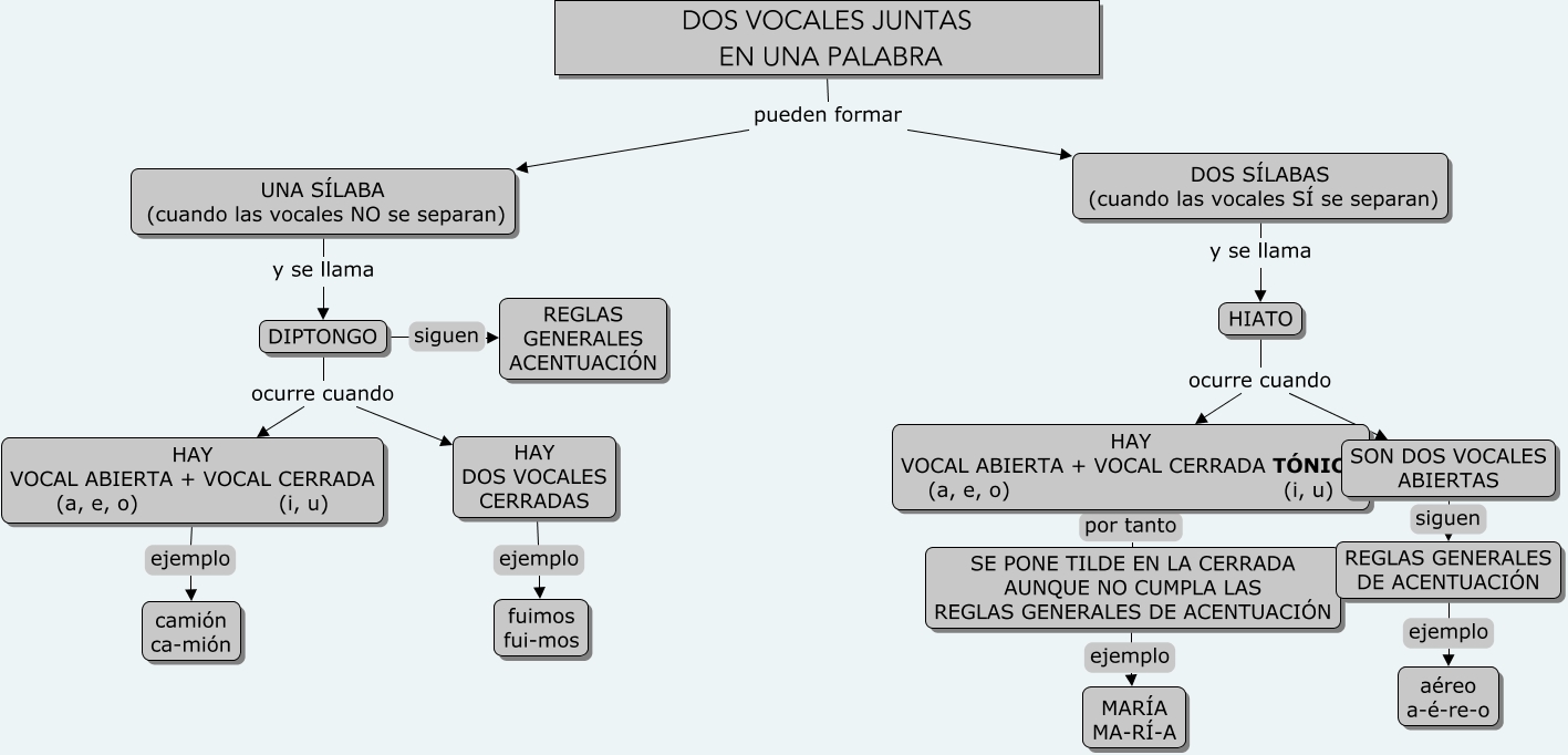 Este Cmap, tiene información relacionada con: DIPTONGO-HIATO (Esther), REGLAS GENERALES DE ACENTUACIÓN ejemplo aéreo a-é-re-o, HAY VOCAL ABIERTA + VOCAL CERRADA (a, e, o) (i, u) ejemplo camión ca-mión, HIATO ocurre cuando SON DOS VOCALES ABIERTAS, HIATO ocurre cuando HAY VOCAL ABIERTA + VOCAL CERRADA TÓNICA (a, e, o) (i, u), DIPTONGO ocurre cuando HAY DOS VOCALES CERRADAS, DOS VOCALES JUNTAS EN UNA PALABRA pueden formar DOS SÍLABAS (cuando las vocales SÍ se separan), HAY VOCAL ABIERTA + VOCAL CERRADA TÓNICA (a, e, o) (i, u) por tanto SE PONE TILDE EN LA CERRADA AUNQUE NO CUMPLA LAS REGLAS GENERALES DE ACENTUACIÓN, DIPTONGO siguen REGLAS GENERALES ACENTUACIÓN, DIPTONGO ocurre cuando HAY VOCAL ABIERTA + VOCAL CERRADA (a, e, o) (i, u), UNA SÍLABA (cuando las vocales NO se separan) y se llama DIPTONGO, SON DOS VOCALES ABIERTAS siguen REGLAS GENERALES DE ACENTUACIÓN, DOS SÍLABAS (cuando las vocales SÍ se separan) y se llama HIATO, SE PONE TILDE EN LA CERRADA AUNQUE NO CUMPLA LAS REGLAS GENERALES DE ACENTUACIÓN ejemplo MARÍA MA-RÍ-A, DOS VOCALES JUNTAS EN UNA PALABRA pueden formar UNA SÍLABA (cuando las vocales NO se separan), HAY DOS VOCALES CERRADAS ejemplo fuimos fui-mos