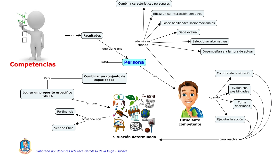 Este Cmap, tiene información relacionada con: Competencias, Lograr un propósito específico TAREA en una Situación determinada, Facultades que tiene una Persona, Competencias son Facultades, Ejecutar la acción para resolver Situación determinada, Comprende la situación para resolver Situación determinada, Situación determinada actuando con Pertinencia, Situación determinada actuando con Sentido Ético, Estudiante competente además es cuando Combina características personales, Estudiante competente además es cuando Desempeñarse a la hora de actuar, Estudiante competente además es cuando Eficaz en su interacción con otros, Estudiante competente cuando Toma decisiones, Combinar un conjunto de capacidades para Lograr un propósito específico TAREA, Toma decisiones para resolver Situación determinada, Persona es Estudiante competente, Evalúa sus posibilidades para resolver Situación determinada, Estudiante competente además es cuando Posee habilidades socioemocionales, Estudiante competente además es cuando Seleccionar alternativas, Estudiante competente cuando Comprende la situación, Estudiante competente cuando Evalúa sus posibilidades, Estudiante competente además es cuando Sabe evaluar