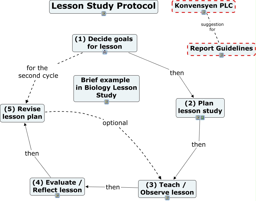 This Concept Map, created with IHMC CmapTools, has information related to: Lesson Study Cycle, (1) Decide goals for lesson for the second cycle (5) Revise lesson plan, (4) Evaluate / Reflect lesson then (5) Revise lesson plan, (5) Revise lesson plan optional (3) Teach / Observe lesson, Konvensyen PLC suggestion for Report Guidelines, (3) Teach / Observe lesson then (4) Evaluate / Reflect lesson, (2) Plan lesson study then (3) Teach / Observe lesson, (1) Decide goals for lesson then (2) Plan lesson study