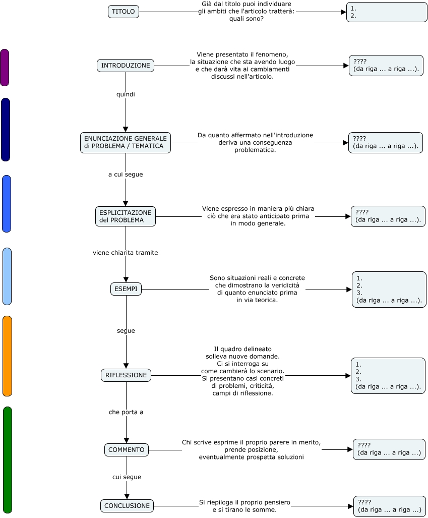 Questa Cmap, creata con IHMC CmapTools, contiene informazioni relative a: GRUPPO 1, RIFLESSIONE che porta a COMMENTO, RIFLESSIONE Il quadro delineato solleva nuove domande. Ci si interroga su come cambierà lo scenario. Si presentano casi concreti di problemi, criticità, campi di riflessione. 1. 2. 3. (da riga ... a riga ...)., CONCLUSIONE Si riepiloga il proprio pensiero e si tirano le somme. ???? (da riga ... a riga ...), ESEMPI Sono situazioni reali e concrete che dimostrano la veridicità di quanto enunciato prima in via teorica. 1. 2. 3. (da riga ... a riga ...)., ESEMPI segue RIFLESSIONE, ESPLICITAZIONE del PROBLEMA viene chiarita tramite ESEMPI, ESPLICITAZIONE del PROBLEMA Viene espresso in maniera più chiara ciò che era stato anticipato prima in modo generale. ???? (da riga ... a riga ...)., ENUNCIAZIONE GENERALE di PROBLEMA / TEMATICA Da quanto affermato nell'introduzione deriva una conseguenza problematica. ???? (da riga ... a riga ...)., INTRODUZIONE quindi ENUNCIAZIONE GENERALE di PROBLEMA / TEMATICA, ENUNCIAZIONE GENERALE di PROBLEMA / TEMATICA a cui segue ESPLICITAZIONE del PROBLEMA, COMMENTO Chi scrive esprime il proprio parere in merito, prende posizione, eventualmente prospetta soluzioni ???? (da riga ... a riga ...), COMMENTO cui segue CONCLUSIONE, INTRODUZIONE Viene presentato il fenomeno, la situazione che sta avendo luogo e che darà vita ai cambiamenti discussi nell'articolo. ???? (da riga ... a riga ...)., TITOLO Già dal titolo puoi individuare gli ambiti che l'articolo tratterà: quali sono? 1. 2.