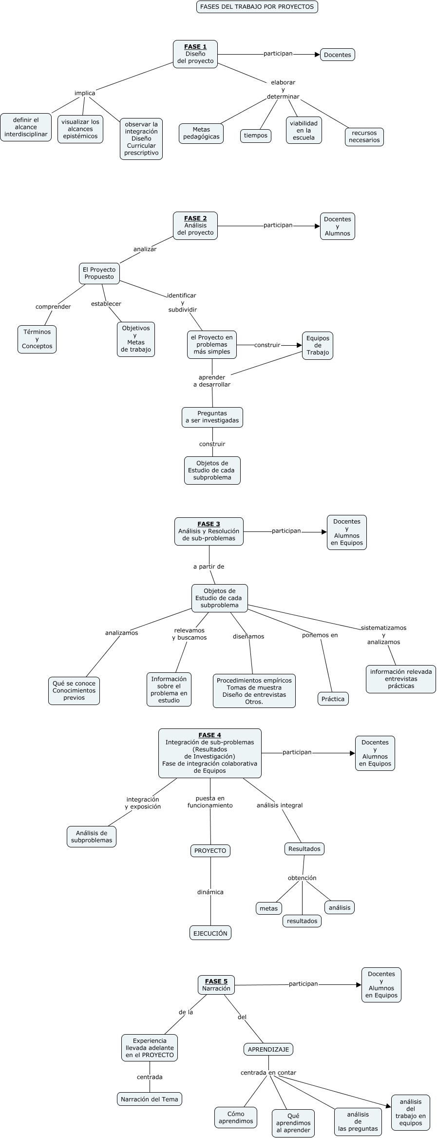 Este Cmap, tiene información relacionada con: Fases del Aprendizaje Basado en Proyectos, FASE 1 Diseño del proyecto implica definir el alcance interdisciplinar, Objetos de Estudio de cada subproblema ponemos en Práctica, Objetos de Estudio de cada subproblema sistematizamos y analizamos información relevada entrevistas prácticas, FASE 5 Narración participan Docentes y Alumnos en Equipos, El Proyecto Propuesto establecer Objetivos y Metas de trabajo, APRENDIZAJE centrada en contar análisis del trabajo en equipos, El Proyecto Propuesto comprender Términos y Conceptos, Resultados obtención resultados, FASE 3 Análisis y Resolución de sub-problemas participan Docentes y Alumnos en Equipos, Experiencia llevada adelante en el PROYECTO centrada Narración del Tema, FASE 1 Diseño del proyecto elaborar y determinar tiempos, Equipos de Trabajo aprender a desarrollar Preguntas a ser investigadas, FASE 1 Diseño del proyecto elaborar y determinar Metas pedagógicas, FASE 2 Análisis del proyecto analizar El Proyecto Propuesto, FASE 1 Diseño del proyecto implica visualizar los alcances epistémicos, FASE 4 Integración de sub-problemas (Resultados de Investigación) Fase de integración colaborativa de Equipos integración y exposición Análisis de subproblemas, PROYECTO dinámica EJECUCIÓN, Objetos de Estudio de cada subproblema relevamos y buscamos Información sobre el problema en estudio, FASE 1 Diseño del proyecto elaborar y determinar viabilidad en la escuela, APRENDIZAJE centrada en contar Qué aprendimos al aprender