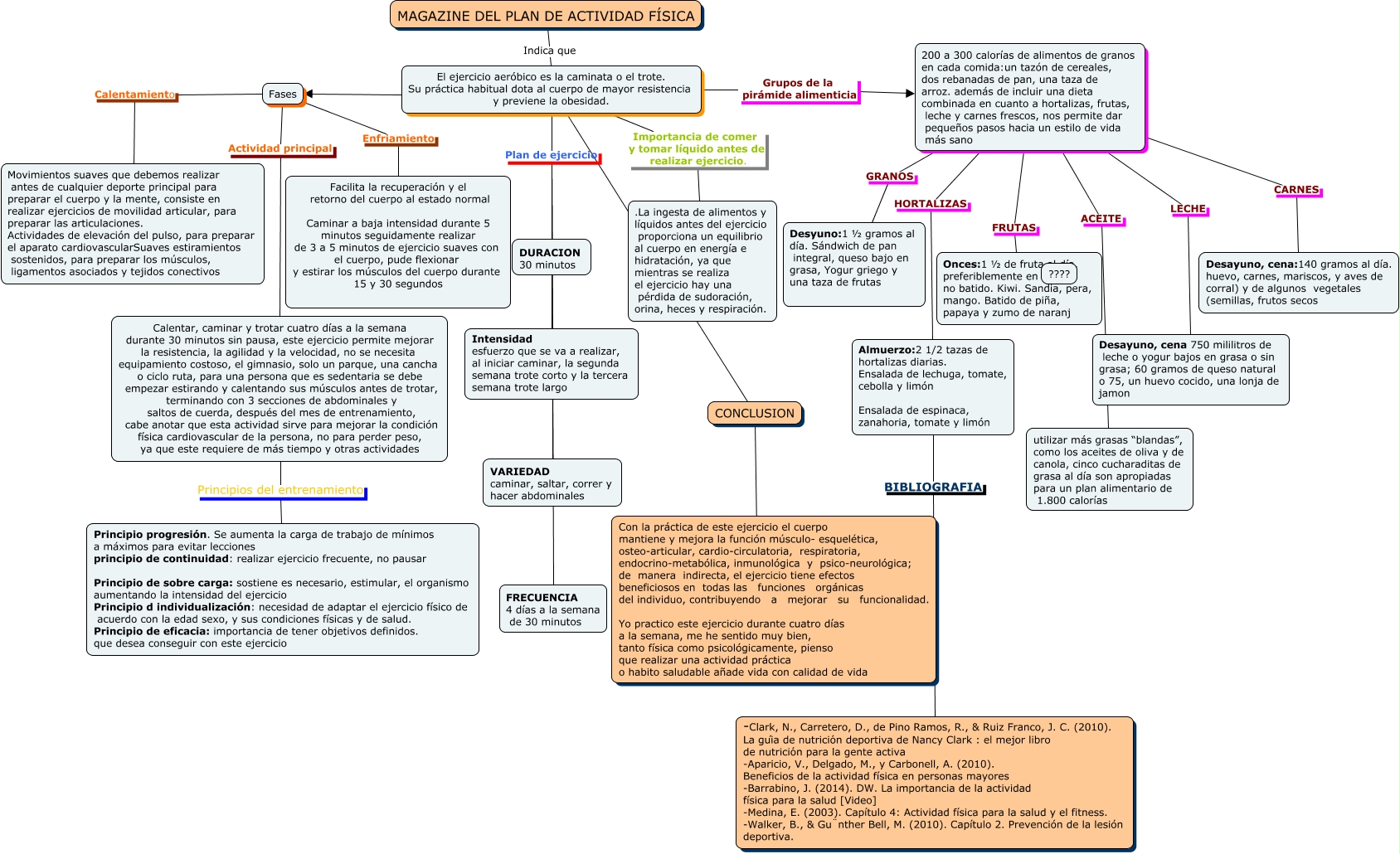 Este Cmap, tiene información relacionada con: MAGAZINE-PLAN DE ACTIVIDAD_LUZMERY, El ejercicio aeróbico es la caminata o el trote. Su práctica habitual dota al cuerpo de mayor resistencia y previene la obesidad. Importancia de comer y tomar líquido antes de realizar ejercicio. .La ingesta de alimentos y líquidos antes del ejercicio proporciona un equilibrio al cuerpo en energía e hidratación, ya que mientras se realiza el ejercicio hay una pérdida de sudoración, orina, heces y respiración., Fases Enfriamiento Facilita la recuperación y el retorno del cuerpo al estado normal Caminar a baja intensidad durante 5 minutos seguidamente realizar de 3 a 5 minutos de ejercicio suaves con el cuerpo, pude flexionar y estirar los músculos del cuerpo durante 15 y 30 segundos, 200 a 300 calorías de alimentos de granos en cada comida:un tazón de cereales, dos rebanadas de pan, una taza de arroz. además de incluir una dieta combinada en cuanto a hortalizas, frutas, leche y carnes frescos, nos permite dar pequeños pasos hacia un estilo de vida más sano ACEITE utilizar más grasas “blandas”, como los aceites de oliva y de canola, cinco cucharaditas de grasa al día son apropiadas para un plan alimentario de 1.800 calorías, El ejercicio aeróbico es la caminata o el trote. Su práctica habitual dota al cuerpo de mayor resistencia y previene la obesidad. ???? CONCLUSION, Calentar, caminar y trotar cuatro días a la semana durante 30 minutos sin pausa, este ejercicio permite mejorar la resistencia, la agilidad y la velocidad, no se necesita equipamiento costoso, el gimnasio, solo un parque, una cancha o ciclo ruta, para una persona que es sedentaria se debe empezar estirando y calentando sus músculos antes de trotar, terminando con 3 secciones de abdominales y saltos de cuerda, después del mes de entrenamiento, cabe anotar que esta actividad sirve para mejorar la condición física cardiovascular de la persona, no para perder peso, ya que este requiere de más tiempo y otras actividades Principios del entrenamiento Principio progresión. Se aumenta la carga de trabajo de mínimos a máximos para evitar lecciones principio de continuidad: realizar ejercicio frecuente, no pausar Principio de sobre carga: sostiene es necesario, estimular, el organismo aumentando la intensidad del ejercicio Principio d individualización: necesidad de adaptar el ejercicio físico de acuerdo con la edad sexo, y sus condiciones físicas y de salud. Principio de eficacia: importancia de tener objetivos definidos. que desea conseguir con este ejercicio, El ejercicio aeróbico es la caminata o el trote. Su práctica habitual dota al cuerpo de mayor resistencia y previene la obesidad. Plan de ejercicio VARIEDAD caminar, saltar, correr y hacer abdominales, Fases Calentamiento Movimientos suaves que debemos realizar antes de cualquier deporte principal para preparar el cuerpo y la mente, consiste en realizar ejercicios de movilidad articular, para preparar las articulaciones. Actividades de elevación del pulso, para preparar el aparato cardiovascularSuaves estiramientos sostenidos, para preparar los músculos, ligamentos asociados y tejidos conectivos, El ejercicio aeróbico es la caminata o el trote. Su práctica habitual dota al cuerpo de mayor resistencia y previene la obesidad. Plan de ejercicio DURACION 30 minutos, 200 a 300 calorías de alimentos de granos en cada comida:un tazón de cereales, dos rebanadas de pan, una taza de arroz. además de incluir una dieta combinada en cuanto a hortalizas, frutas, leche y carnes frescos, nos permite dar pequeños pasos hacia un estilo de vida más sano CARNES Desayuno, cena:140 gramos al día. huevo, carnes, mariscos, y aves de corral) y de algunos vegetales (semillas, frutos secos, CONCLUSION ???? Con la práctica de este ejercicio el cuerpo mantiene y mejora la función músculo- esquelética, osteo-articular, cardio-circulatoria, respiratoria, endocrino-metabólica, inmunológica y psico-neurológica; de manera indirecta, el ejercicio tiene efectos beneficiosos en todas las funciones orgánicas del individuo, contribuyendo a mejorar su funcionalidad. Yo practico este ejercicio durante cuatro días a la semana, me he sentido muy bien, tanto física como psicológicamente, pienso que realizar una actividad práctica o habito saludable añade vida con calidad de vida, Almuerzo:2 1/2 tazas de hortalizas diarias. Ensalada de lechuga, tomate, cebolla y limón Ensalada de espinaca, zanahoria, tomate y limón BIBLIOGRAFIA -Clark, N., Carretero, D., de Pino Ramos, R., & Ruiz Franco, J. C. (2010). La guía de nutrición deportiva de Nancy Clark : el mejor libro de nutrición para la gente activa -Aparicio, V., Delgado, M., y Carbonell, A. (2010). Beneficios de la actividad física en personas mayores -Barrabino, J. (2014). DW. La importancia de la actividad física para la salud [Video] -Medina, E. (2003). Capítulo 4: Actividad física para la salud y el fitness. -Walker, B., & Günther Bell, M. (2010). Capítulo 2. Prevención de la lesión deportiva., 200 a 300 calorías de alimentos de granos en cada comida:un tazón de cereales, dos rebanadas de pan, una taza de arroz. además de incluir una dieta combinada en cuanto a hortalizas, frutas, leche y carnes frescos, nos permite dar pequeños pasos hacia un estilo de vida más sano LECHE Desayuno, cena 750 mililitros de leche o yogur bajos en grasa o sin grasa; 60 gramos de queso natural o 75, un huevo cocido, una lonja de jamon, 200 a 300 calorías de alimentos de granos en cada comida:un tazón de cereales, dos rebanadas de pan, una taza de arroz. además de incluir una dieta combinada en cuanto a hortalizas, frutas, leche y carnes frescos, nos permite dar pequeños pasos hacia un estilo de vida más sano GRANOS Desyuno:1 ½ gramos al día. Sándwich de pan integral, queso bajo en grasa, Yogur griego y una taza de frutas, El ejercicio aeróbico es la caminata o el trote. Su práctica habitual dota al cuerpo de mayor resis