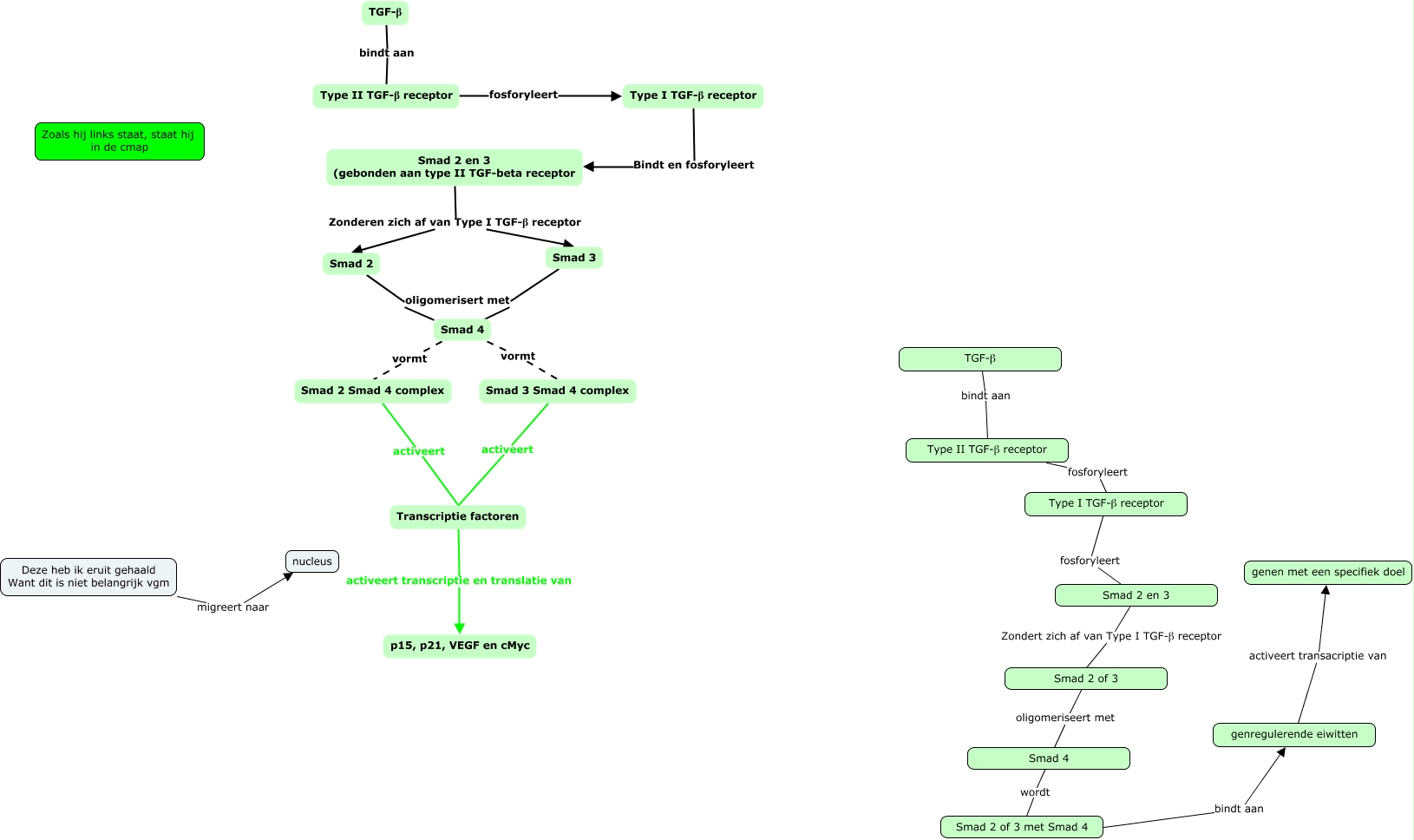 Deze Concept Map heeft informatie gerelateerd aan: TGF beta, Smad 2 en 3 (gebonden aan type II TGF-beta receptor Zonderen zich af van Type I TGF-β receptor Smad 2, Smad 2 oligomerisert met Smad 4, Transcriptie factoren activeert transcriptie en translatie van p15, p21, VEGF en cMyc, Type I TGF-β receptor Bindt en fosforyleert Smad 2 en 3 (gebonden aan type II TGF-beta receptor, Smad 3 oligomerisert met Smad 4, TGF-β bindt aan Type II TGF-β receptor, Smad 2 Smad 4 complex activeert Transcriptie factoren, TGF-β bindt aan Type II TGF-β receptor, Type I TGF-β receptor fosforyleert Smad 2 en 3, Smad 4 wordt Smad 2 of 3 met Smad 4, Smad 2 of 3 oligomeriseert met Smad 4, Type II TGF-β receptor fosforyleert Type I TGF-β receptor, Smad 2 of 3 met Smad 4 bindt aan genregulerende eiwitten, Type II TGF-β receptor fosforyleert Type I TGF-β receptor, Smad 4 vormt Smad 3 Smad 4 complex, Smad 3 Smad 4 complex activeert Transcriptie factoren, Deze heb ik eruit gehaald Want dit is niet belangrijk vgm migreert naar nucleus, Smad 2 en 3 Zondert zich af van Type I TGF-β receptor Smad 2 of 3, Smad 2 oligomerisert met Smad 4, Smad 3 oligomerisert met Smad 4