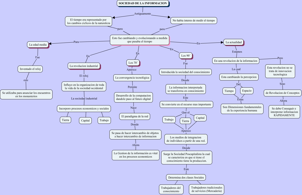 Este Cmap, tiene información relacionada con: Sociedad de la informacion, El tiempo era representado por los cambios ciclicos de la naturaleza pero Esto fue cambiando y evolucionando a medida que pasaba el tiempo, Se convierte en el recurso mas importante Que el Trabajo, Influyo en la organizacion de toda la vida de la sociedad occidental La sociedad industrial Incorporo procesos economicos y sociales, Determina dos clases Sociales ???? Trabajadores del conocimiento, Esto fue cambiando y evolucionando a medida que pasaba el tiempo En La revolucion industrial, Inventado el reloj este Se utilizaba para anunciar los encuentros en los monasterios, Introducida la sociedad del conocimiento Donde La informacion interpretada se transforma en conocimiento, La edad media Fue Inventado el reloj, Tiempo Estas Son Dimensiones fundamentales de la experiencia humana, La actualidad Estamos En una revolucion de la informacion, Incorporo procesos economicos y sociales ???? Tierra, No habia interes de medir el tiempo pero Esto fue cambiando y evolucionando a medida que pasaba el tiempo, Esta cambiando la percepcion Del Espacio, Esto fue cambiando y evolucionando a medida que pasaba el tiempo En Los 90´, Esto fue cambiando y evolucionando a medida que pasaba el tiempo En La actualidad, Incorporo procesos economicos y sociales ???? Trabajo, Se pasa de hacer intercambio de objetos a hacer intercambio de informacion Ahora La Gestion de la información es vital en los procesos economicos, Esta revolucion no se trata de innovacion tecnologica Sino de Revolucion de Conceptos, Surge la Sociedad Poscapitalista la cual se caracteriza en que si tiene el conocimiento tiene la produccion. Este Determina dos clases Sociales, Incorporo procesos economicos y sociales ???? Capital
