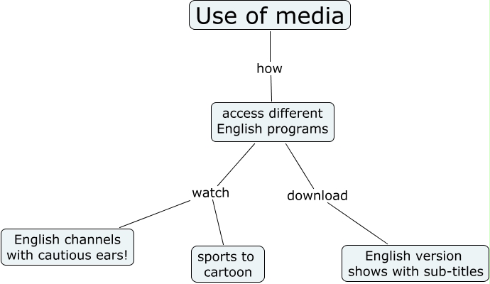 This Concept Map, created with IHMC CmapTools, has information related to: 1. Use of media, Use of media how access different English programs, access different English programs download English version shows with sub-titles, access different English programs watch English channels with cautious ears!, access different English programs watch sports to cartoon