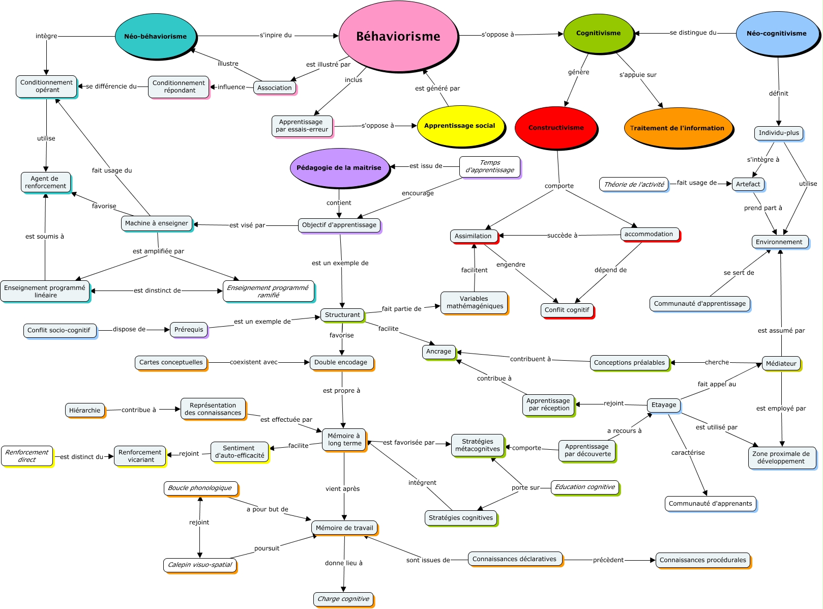 Cette carte de concepts créée avec IHMC CmapTools traite de: EDUC, Etayage caractérise Communauté d'apprenants, Néo-cognitivisme se distingue du Cognitivisme, Structurant facilite Ancrage, Apprentissage social est généré par Béhaviorisme, Apprentissage par découverte a recours à Etayage, Calepin visuo-spatial poursuit Mémoire de travail, Conceptions préalables contribuent à Ancrage, Boucle phonologique a pour but de Mémoire de travail, Conditionnement opérant utilise Agent de renforcement, Renforcement direct est distinct du Renforcement vicariant, accommodation succède à Assimilation, Double encodage est propre à Mémoire à long terme, Mémoire de travail donne lieu à Charge cognitive, Béhaviorisme s'oppose à Cognitivisme, Individu-plus s'intègre à Artefact, Béhaviorisme inclus Apprentissage par essais-erreur, Enseignement programmé linéaire est soumis à Agent de renforcement, Apprentissage par découverte comporte Stratégies métacognitves, accommodation dépend de Conflit cognitif, Cartes conceptuelles coexistent avec Double encodage