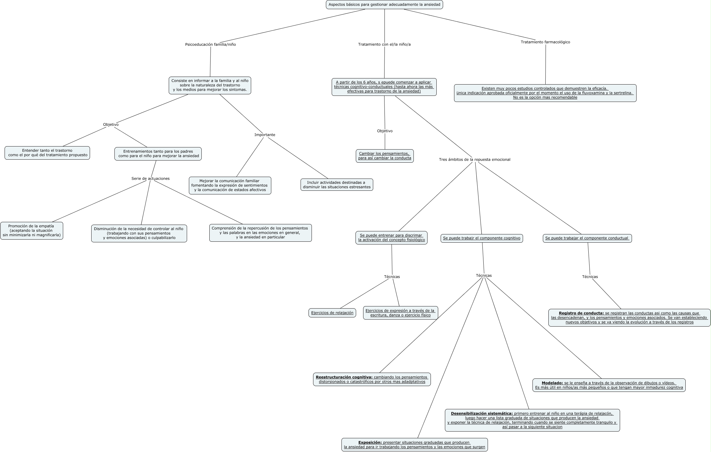 Este Cmap, tiene información relacionada con: Aspectos básicos para gestionar adecuadamente la ansiedad, A partir de los 6 años, s epuede comenzar a aplicar técnicas cognitivo-conductuales (hasta ahora las más efectivas para trastorno de la ansiedad) Tres ámbitos de la repuesta emocional Se puede trabajr el componente cognitivo, Entrenamientos tanto para los padres como para el niño para mejorar la ansiedad Serie de actuaciones Comprensión de la repercusión de los pensamientos y las palabras en las emociones en general, y la ansiedad en particular, Consiste en informar a la familia y al niño sobre la naturaleza del trastorno y los medios para mejorar los sintomas. Importante Mejorar la comunicación familiar fomentando la expresión de sentimientos y la comunicación de estados afectivos, Se puede entrenar para discrimar la activación del concepto fisiológico Técnicas Ejercicios de expresión a través de la escritura, danza o ejercicio físico, Aspectos básicos para gestionar adecuadamente la ansiedad Psicoeducación familia/niño Consiste en informar a la familia y al niño sobre la naturaleza del trastorno y los medios para mejorar los sintomas., Entrenamientos tanto para los padres como para el niño para mejorar la ansiedad Serie de actuaciones Promoción de la empatía (aceptando la situación sin minimizarla ni magnificarla), Se puede trabajr el componente cognitivo Técnicas Modelado: se le enseña a través de la observación de dibujos o vídeos. Es más útil en niños/as más pequeños o que tengan mayor inmadurez cognitiva, Se puede trabajr el componente cognitivo Técnicas Exposición: presentar situaciones graduadas que producen la ansiedad para ir trabajando los pensamientos y las emociones que surgen, Entrenamientos tanto para los padres como para el niño para mejorar la ansiedad Serie de actuaciones Disminución de la necesidad de controlar al niño (trabajando con sus pensamientos y emociones asociadas) o culpabilizarlo, Consiste en informar a la familia y al niño sobre la naturaleza del trastorno y los medios para mejorar los sintomas. Objetivo Entrenamientos tanto para los padres como para el niño para mejorar la ansiedad, Aspectos básicos para gestionar adecuadamente la ansiedad Tratamiento con el/la niño/a A partir de los 6 años, s epuede comenzar a aplicar técnicas cognitivo-conductuales (hasta ahora las más efectivas para trastorno de la ansiedad), Se puede trabajr el componente cognitivo Técnicas Desensibilización sistemática: primero entrenar al niño en una terápia de relajacón, luego hacer una lista graduada de situaciones que producen la ansiedad y exponer la técnica de relajación, terminando cuando se siente completamente tranquilo y así pasar a la siguiente situacion, A partir de los 6 años, s epuede comenzar a aplicar técnicas cognitivo-conductuales (hasta ahora las más efectivas para trastorno de la ansiedad) Objetivo Cambiar los pensamientos, para así cambiar la conducta, Se puede trabajr el componente cognitivo Técnicas Reestructuración cognitiva: cambiando los pensamientos distorsionados o catastróficos por otros mas adadptativos, Se puede trabajar el componente conductual Técnicas Registro de conducta: se registran las conductas asi como las causas que las desencadenan, y los pensamientos y emociones asociados. Se van estableciendo nuevos objetivos y se va viendo la evolución a través de los registros, Consiste en informar a la familia y al niño sobre la naturaleza del trastorno y los medios para mejorar los sintomas. Importante Incluir actividades destinadas a disminuir las situaciones estresantes, A partir de los 6 años, s epuede comenzar a aplicar técnicas cognitivo-conductuales (hasta ahora las más efectivas para trastorno de la ansiedad) Tres ámbitos de la repuesta emocional Se puede trabajar el componente conductual, A partir de los 6 años, s epuede comenzar a aplicar técnicas cognitivo-conductuales (hasta ahora las más efectivas para trastorno de la ansiedad) Tres ámbitos de la repuesta emocional Se puede entrenar para discrimar la activación del concepto fisiológico, Consiste en informar a la familia y al niño sobre la naturaleza del trastorno y los medios para mejorar los sintomas. Objetivo Entender tanto el trastorno como el por qué del tratamiento propuesto, Aspectos básicos para gestionar adecuadamente la ansiedad Tratamiento farmacológico Existen muy pocos estudios controlados que demuestren la eficacía. ünica indicación aprobada oficialmente por el momento el uso de la fluvoxamina y la sertrelina. No es la opción mas recomendable