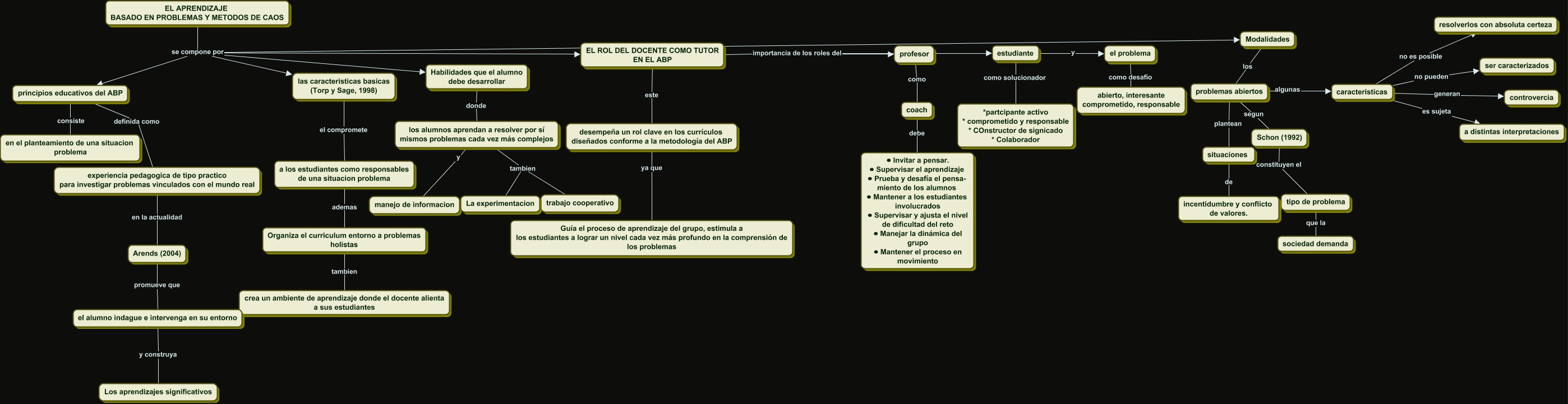 Este Cmap, tiene información relacionada con: Capitulo 3, estudiante y el problema, EL APRENDIZAJE BASADO EN PROBLEMAS Y METODOS DE CAOS se compone por EL ROL DEL DOCENTE COMO TUTOR EN EL ABP, EL APRENDIZAJE BASADO EN PROBLEMAS Y METODOS DE CAOS se compone por Modalidades, caracteristicas es sujeta a distintas interpretaciones, a los estudiantes como responsables de una situacion problema ademas Organiza el curriculum entorno a problemas holistas, el problema como desafio abierto, interesante comprometido, responsable, las caracteristicas basicas (Torp y Sage, 1998) el compromete a los estudiantes como responsables de una situacion problema, los alumnos aprendan a resolver por sí mismos problemas cada vez más complejos tambien La experimentacion, profesor como coach, EL APRENDIZAJE BASADO EN PROBLEMAS Y METODOS DE CAOS se compone por las caracteristicas basicas (Torp y Sage, 1998), EL ROL DEL DOCENTE COMO TUTOR EN EL ABP importancia de los roles del profesor, Organiza el curriculum entorno a problemas holistas tambien crea un ambiente de aprendizaje donde el docente alienta a sus estudiantes, experiencia pedagogica de tipo practico para investigar problemas vinculados con el mundo real en la actualidad Arends (2004), coach debe • Invitar a pensar. • Supervisar el aprendizaje • Prueba y desafía el pensa- miento de los alumnos • Mantener a los estudiantes involucrados • Supervisar y ajusta el nivel de dificultad del reto • Manejar la dinámica del grupo • Mantener el proceso en movimiento, caracteristicas no pueden ser caracterizados, EL ROL DEL DOCENTE COMO TUTOR EN EL ABP este desempeña un rol clave en los currículos diseñados conforme a la metodología del ABP, tipo de problema que la sociedad demanda, desempeña un rol clave en los currículos diseñados conforme a la metodología del ABP ya que Guía el proceso de aprendizaje del grupo, estimula a los estudiantes a lograr un nivel cada vez más profundo en la comprensión de los problemas, los alumnos aprendan a resolver por sí mismos problemas cada vez más complejos y manejo de informacion, el alumno indague e intervenga en su entorno y construya Los aprendizajes significativos