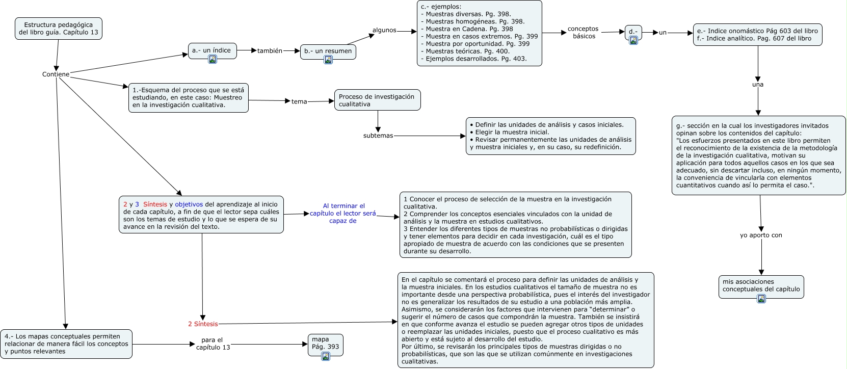 Este Cmap, tiene información relacionada con: Recursos para estructura pedagógica del capítulo 13, Estructura pedagógica del libro guía. Capítulo 13 Contiene 2 y 3 Síntesis y objetivos del aprendizaje al inicio de cada capítulo, a fin de que el lector sepa cuáles son los temas de estudio y lo que se espera de su avance en la revisión del texto., 4.- Los mapas conceptuales permiten relacionar de manera fácil los conceptos y puntos relevantes para el capítulo 13 mapa Pág. 393, Estructura pedagógica del libro guía. Capítulo 13 Contiene 1.-Esquema del proceso que se está estudiando, en este caso: Muestreo en la investigación cualitativa., a.- un índice también b.- un resumen, Proceso de investigación cualitativa subtemas • Definir las unidades de análisis y casos iniciales. • Elegir la muestra inicial. • Revisar permanentemente las unidades de análisis y muestra iniciales y, en su caso, su redefinición., 1.-Esquema del proceso que se está estudiando, en este caso: Muestreo en la investigación cualitativa. tema Proceso de investigación cualitativa, Estructura pedagógica del libro guía. Capítulo 13 Contiene a.- un índice, c.- ejemplos: - Muestras diversas. Pg. 398. - Muestras homogéneas. Pg. 398. - Muestra en Cadena. Pg. 398 - Muestra en casos extremos. Pg. 399 - Muestra por oportunidad. Pg. 399 - Muestras teóricas. Pg. 400. - Ejemplos desarrollados. Pg. 403. conceptos básicos d.-, e.- Indice onomástico Pág 603 del libro f.- Indice analítico. Pag. 607 del libro una g.- sección en la cual los investigadores invitados opinan sobre los contenidos del capítulo: "Los esfuerzos presentados en este libro permiten el reconocimiento de la existencia de la metodología de la investigación cualitativa, motivan su aplicación para todos aquellos casos en los que sea adecuado, sin descartar incluso, en ningún momento, la conveniencia de vincularla con elementos cuantitativos cuando así lo permita el caso."., b.- un resumen algunos c.- ejemplos: - Muestras diversas. Pg. 398. - Muestras homogéneas. Pg. 398. - Muestra en Cadena. Pg. 398 - Muestra en casos extremos. Pg. 399 - Muestra por oportunidad. Pg. 399 - Muestras teóricas. Pg. 400. - Ejemplos desarrollados. Pg. 403., Estructura pedagógica del libro guía. Capítulo 13 Contiene 4.- Los mapas conceptuales permiten relacionar de manera fácil los conceptos y puntos relevantes, d.- un e.- Indice onomástico Pág 603 del libro f.- Indice analítico. Pag. 607 del libro, 2 y 3 Síntesis y objetivos del aprendizaje al inicio de cada capítulo, a fin de que el lector sepa cuáles son los temas de estudio y lo que se espera de su avance en la revisión del texto. Al terminar el capítulo el lector será capaz de 1 Conocer el proceso de selección de la muestra en la investigación cualitativa. 2 Comprender los conceptos esenciales vinculados con la unidad de análisis y la muestra en estudios cualitativos. 3 Entender los diferentes tipos de muestras no probabilísticas o dirigidas y tener elementos para decidir en cada investigación, cuál es el tipo apropiado de muestra de acuerdo con las condiciones que se presenten durante su desarrollo., g.- sección en la cual los investigadores invitados opinan sobre los contenidos del capítulo: "Los esfuerzos presentados en este libro permiten el reconocimiento de la existencia de la metodología de la investigación cualitativa, motivan su aplicación para todos aquellos casos en los que sea adecuado, sin descartar incluso, en ningún momento, la conveniencia de vincularla con elementos cuantitativos cuando así lo permita el caso.". yo aporto con mis asociaciones conceptuales del capítulo, 2 y 3 Síntesis y objetivos del aprendizaje al inicio de cada capítulo, a fin de que el lector sepa cuáles son los temas de estudio y lo que se espera de su avance en la revisión del texto. 2 Síntesis En el capítulo se comentará el proceso para definir las unidades de análisis y la muestra iniciales. En los estudios cualitativos el tamaño de muestra no es importante desde una perspectiva probabilística, pues el interés del investigador no es generalizar los resultados de su estudio a una población más amplia. Asimismo, se considerarán los factores que intervienen para “determinar” o sugerir el número de casos que compondrán la muestra. También se insistirá en que conforme avanza el estudio se pueden agregar otros tipos de unidades o reemplazar las unidades iniciales, puesto que el proceso cualitativo es más abierto y está sujeto al desarrollo del estudio. Por último, se revisarán los principales tipos de muestras dirigidas o no probabilísticas, que son las que se utilizan comúnmente en investigaciones cualitativas.