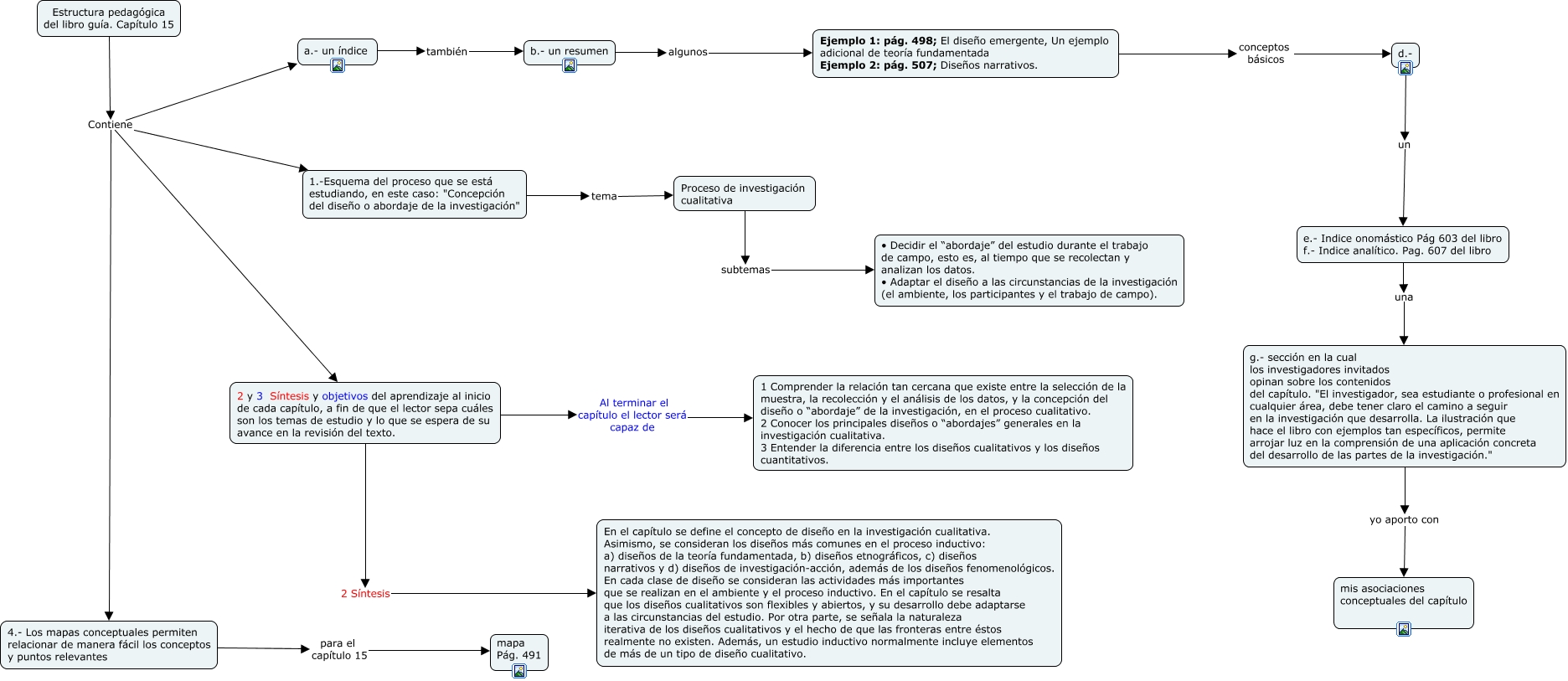 Este Cmap, tiene información relacionada con: Recursos para estructura pedagógica del capítulo 15, 2 y 3 Síntesis y objetivos del aprendizaje al inicio de cada capítulo, a fin de que el lector sepa cuáles son los temas de estudio y lo que se espera de su avance en la revisión del texto. Al terminar el capítulo el lector será capaz de 1 Comprender la relación tan cercana que existe entre la selección de la muestra, la recolección y el análisis de los datos, y la concepción del diseño o “abordaje” de la investigación, en el proceso cualitativo. 2 Conocer los principales diseños o “abordajes” generales en la investigación cualitativa. 3 Entender la diferencia entre los diseños cualitativos y los diseños cuantitativos., 2 y 3 Síntesis y objetivos del aprendizaje al inicio de cada capítulo, a fin de que el lector sepa cuáles son los temas de estudio y lo que se espera de su avance en la revisión del texto. 2 Síntesis En el capítulo se define el concepto de diseño en la investigación cualitativa. Asimismo, se consideran los diseños más comunes en el proceso inductivo: a) diseños de la teoría fundamentada, b) diseños etnográficos, c) diseños narrativos y d) diseños de investigación-acción, además de los diseños fenomenológicos. En cada clase de diseño se consideran las actividades más importantes que se realizan en el ambiente y el proceso inductivo. En el capítulo se resalta que los diseños cualitativos son flexibles y abiertos, y su desarrollo debe adaptarse a las circunstancias del estudio. Por otra parte, se señala la naturaleza iterativa de los diseños cualitativos y el hecho de que las fronteras entre éstos realmente no existen. Además, un estudio inductivo normalmente incluye elementos de más de un tipo de diseño cualitativo., Estructura pedagógica del libro guía. Capítulo 15 Contiene 1.-Esquema del proceso que se está estudiando, en este caso: "Concepción del diseño o abordaje de la investigación", 1.-Esquema del proceso que se está estudiando, en este caso: "Concepción del diseño o abordaje de la investigación" tema Proceso de investigación cualitativa, Estructura pedagógica del libro guía. Capítulo 15 Contiene 2 y 3 Síntesis y objetivos del aprendizaje al inicio de cada capítulo, a fin de que el lector sepa cuáles son los temas de estudio y lo que se espera de su avance en la revisión del texto., Estructura pedagógica del libro guía. Capítulo 15 Contiene a.- un índice, b.- un resumen algunos Ejemplo 1: pág. 498; El diseño emergente, Un ejemplo adicional de teoría fundamentada Ejemplo 2: pág. 507; Diseños narrativos., g.- sección en la cual los investigadores invitados opinan sobre los contenidos del capítulo. "El investigador, sea estudiante o profesional en cualquier área, debe tener claro el camino a seguir en la investigación que desarrolla. La ilustración que hace el libro con ejemplos tan específicos, permite arrojar luz en la comprensión de una aplicación concreta del desarrollo de las partes de la investigación." yo aporto con mis asociaciones conceptuales del capítulo, Ejemplo 1: pág. 498; El diseño emergente, Un ejemplo adicional de teoría fundamentada Ejemplo 2: pág. 507; Diseños narrativos. conceptos básicos d.-, 4.- Los mapas conceptuales permiten relacionar de manera fácil los conceptos y puntos relevantes para el capítulo 15 mapa Pág. 491, Proceso de investigación cualitativa subtemas • Decidir el “abordaje” del estudio durante el trabajo de campo, esto es, al tiempo que se recolectan y analizan los datos. • Adaptar el diseño a las circunstancias de la investigación (el ambiente, los participantes y el trabajo de campo)., d.- un e.- Indice onomástico Pág 603 del libro f.- Indice analítico. Pag. 607 del libro, a.- un índice también b.- un resumen, Estructura pedagógica del libro guía. Capítulo 15 Contiene 4.- Los mapas conceptuales permiten relacionar de manera fácil los conceptos y puntos relevantes, e.- Indice onomástico Pág 603 del libro f.- Indice analítico. Pag. 607 del libro una g.- sección en la cual los investigadores invitados opinan sobre los contenidos del capítulo. "El investigador, sea estudiante o profesional en cualquier área, debe tener claro el camino a seguir en la investigación que desarrolla. La ilustración que hace el libro con ejemplos tan específicos, permite arrojar luz en la comprensión de una aplicación concreta del desarrollo de las partes de la investigación."