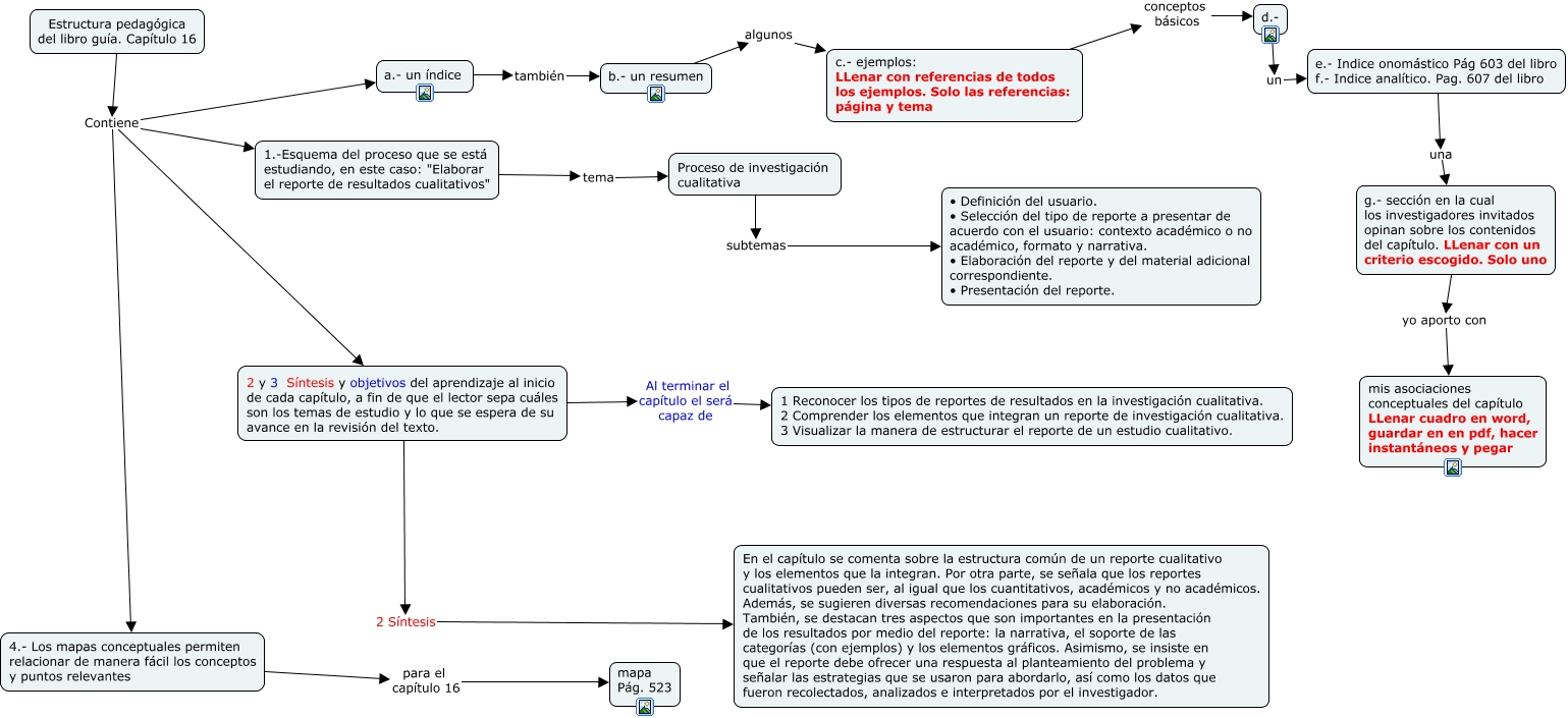 This Concept Map, created with IHMC CmapTools, has information related to: Estructura pedagógica del capítulo 16, Proceso de investigación cualitativa subtemas • Definición del usuario. • Selección del tipo de reporte a presentar de acuerdo con el usuario: contexto académico o no académico, formato y narrativa. • Elaboración del reporte y del material adicional correspondiente. • Presentación del reporte., c.- ejemplos: LLenar con referencias de todos los ejemplos. Solo las referencias: página y tema conceptos básicos d.-, 2 y 3 Síntesis y objetivos del aprendizaje al inicio de cada capítulo, a fin de que el lector sepa cuáles son los temas de estudio y lo que se espera de su avance en la revisión del texto. Al terminar el capítulo el será capaz de 1 Reconocer los tipos de reportes de resultados en la investigación cualitativa. 2 Comprender los elementos que integran un reporte de investigación cualitativa. 3 Visualizar la manera de estructurar el reporte de un estudio cualitativo., b.- un resumen algunos c.- ejemplos: LLenar con referencias de todos los ejemplos. Solo las referencias: página y tema, Estructura pedagógica del libro guía. Capítulo 16 Contiene 4.- Los mapas conceptuales permiten relacionar de manera fácil los conceptos y puntos relevantes, Estructura pedagógica del libro guía. Capítulo 16 Contiene 1.-Esquema del proceso que se está estudiando, en este caso: "Elaborar el reporte de resultados cualitativos", a.- un índice también b.- un resumen, Estructura pedagógica del libro guía. Capítulo 16 Contiene 2 y 3 Síntesis y objetivos del aprendizaje al inicio de cada capítulo, a fin de que el lector sepa cuáles son los temas de estudio y lo que se espera de su avance en la revisión del texto., 1.-Esquema del proceso que se está estudiando, en este caso: "Elaborar el reporte de resultados cualitativos" tema Proceso de investigación cualitativa, g.- sección en la cual los investigadores invitados opinan sobre los contenidos del capítulo. LLenar con un criterio escogido. Solo uno yo aporto con mis asociaciones conceptuales del capítulo LLenar cuadro en word, guardar en en pdf, hacer instantáneos y pegar, d.- un e.- Indice onomástico Pág 603 del libro f.- Indice analítico. Pag. 607 del libro, 4.- Los mapas conceptuales permiten relacionar de manera fácil los conceptos y puntos relevantes para el capítulo 16 mapa Pág. 523, Estructura pedagógica del libro guía. Capítulo 16 Contiene a.- un índice, 2 y 3 Síntesis y objetivos del aprendizaje al inicio de cada capítulo, a fin de que el lector sepa cuáles son los temas de estudio y lo que se espera de su avance en la revisión del texto. 2 Síntesis En el capítulo se comenta sobre la estructura común de un reporte cualitativo y los elementos que la integran. Por otra parte, se señala que los reportes cualitativos pueden ser, al igual que los cuantitativos, académicos y no académicos. Además, se sugieren diversas recomendaciones para su elaboración. También, se destacan tres aspectos que son importantes en la presentación de los resultados por medio del reporte: la narrativa, el soporte de las categorías (con ejemplos) y los elementos gráficos. Asimismo, se insiste en que el reporte debe ofrecer una respuesta al planteamiento del problema y señalar las estrategias que se usaron para abordarlo, así como los datos que fueron recolectados, analizados e interpretados por el investigador., e.- Indice onomástico Pág 603 del libro f.- Indice analítico. Pag. 607 del libro una g.- sección en la cual los investigadores invitados opinan sobre los contenidos del capítulo. LLenar con un criterio escogido. Solo uno