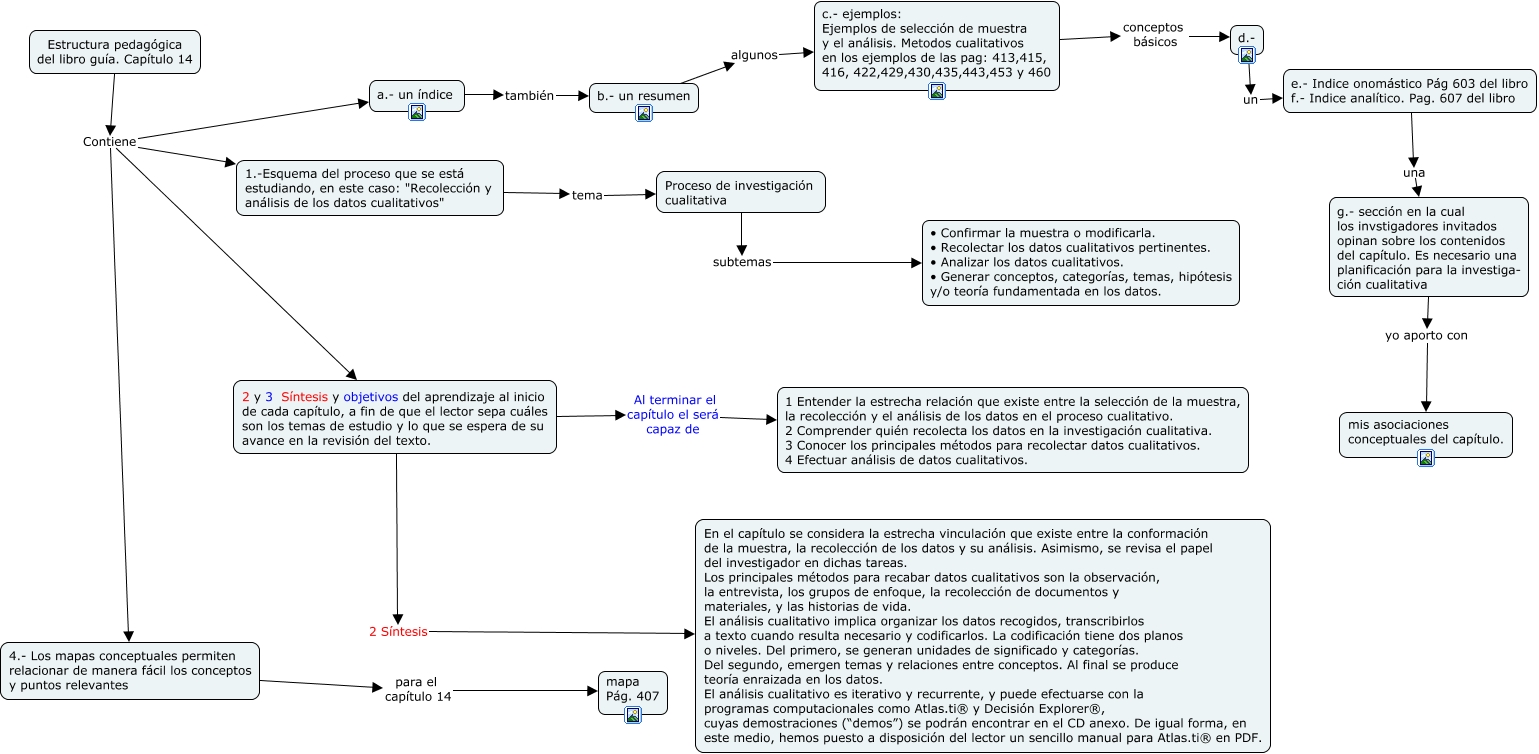 Este Cmap, tiene información relacionada con: Estructura pedagógica del capítulo 14, Proceso de investigación cualitativa subtemas • Confirmar la muestra o modificarla. • Recolectar los datos cualitativos pertinentes. • Analizar los datos cualitativos. • Generar conceptos, categorías, temas, hipótesis y/o teoría fundamentada en los datos., c.- ejemplos: Ejemplos de selección de muestra y el análisis. Metodos cualitativos en los ejemplos de las pag: 413,415, 416, 422,429,430,435,443,453 y 460 conceptos básicos d.-, 2 y 3 Síntesis y objetivos del aprendizaje al inicio de cada capítulo, a fin de que el lector sepa cuáles son los temas de estudio y lo que se espera de su avance en la revisión del texto. Al terminar el capítulo el será capaz de 1 Entender la estrecha relación que existe entre la selección de la muestra, la recolección y el análisis de los datos en el proceso cualitativo. 2 Comprender quién recolecta los datos en la investigación cualitativa. 3 Conocer los principales métodos para recolectar datos cualitativos. 4 Efectuar análisis de datos cualitativos., b.- un resumen algunos c.- ejemplos: Ejemplos de selección de muestra y el análisis. Metodos cualitativos en los ejemplos de las pag: 413,415, 416, 422,429,430,435,443,453 y 460, Estructura pedagógica del libro guía. Capítulo 14 Contiene 4.- Los mapas conceptuales permiten relacionar de manera fácil los conceptos y puntos relevantes, Estructura pedagógica del libro guía. Capítulo 14 Contiene 1.-Esquema del proceso que se está estudiando, en este caso: "Recolección y análisis de los datos cualitativos", a.- un índice también b.- un resumen, Estructura pedagógica del libro guía. Capítulo 14 Contiene 2 y 3 Síntesis y objetivos del aprendizaje al inicio de cada capítulo, a fin de que el lector sepa cuáles son los temas de estudio y lo que se espera de su avance en la revisión del texto., 1.-Esquema del proceso que se está estudiando, en este caso: "Recolección y análisis de los datos cualitativos" tema Proceso de investigación cualitativa, g.- sección en la cual los invstigadores invitados opinan sobre los contenidos del capítulo. Es necesario una planificación para la investiga- ción cualitativa yo aporto con mis asociaciones conceptuales del capítulo., d.- un e.- Indice onomástico Pág 603 del libro f.- Indice analítico. Pag. 607 del libro, 4.- Los mapas conceptuales permiten relacionar de manera fácil los conceptos y puntos relevantes para el capítulo 14 mapa Pág. 407, Estructura pedagógica del libro guía. Capítulo 14 Contiene a.- un índice, 2 y 3 Síntesis y objetivos del aprendizaje al inicio de cada capítulo, a fin de que el lector sepa cuáles son los temas de estudio y lo que se espera de su avance en la revisión del texto. 2 Síntesis En el capítulo se considera la estrecha vinculación que existe entre la conformación de la muestra, la recolección de los datos y su análisis. Asimismo, se revisa el papel del investigador en dichas tareas. Los principales métodos para recabar datos cualitativos son la observación, la entrevista, los grupos de enfoque, la recolección de documentos y materiales, y las historias de vida. El análisis cualitativo implica organizar los datos recogidos, transcribirlos a texto cuando resulta necesario y codificarlos. La codificación tiene dos planos o niveles. Del primero, se generan unidades de significado y categorías. Del segundo, emergen temas y relaciones entre conceptos. Al final se produce teoría enraizada en los datos. El análisis cualitativo es iterativo y recurrente, y puede efectuarse con la programas computacionales como Atlas.ti® y Decisión Explorer®, cuyas demostraciones (“demos”) se podrán encontrar en el CD anexo. De igual forma, en este medio, hemos puesto a disposición del lector un sencillo manual para Atlas.ti® en PDF., e.- Indice onomástico Pág 603 del libro f.- Indice analítico. Pag. 607 del libro una g.- sección en la cual los invstigadores invitados opinan sobre los contenidos del capítulo. Es necesario una planificación para la investiga- ción cualitativa