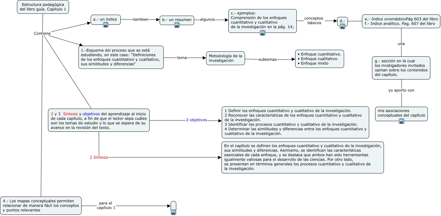 Este Cmap, tiene información relacionada con: Capítulo 1, Estructura pedagógica del libro guía. Capítulo 1 Contiene a.- un índice, d.- un e.- Indice onomásticoPág 603 del libro f.- Indice analítico. Pag. 607 del libro, e.- Indice onomásticoPág 603 del libro f.- Indice analítico. Pag. 607 del libro una g.- sección en la cual los invstigadores invitados opinan sobre los contenidos del capítulo., b.- un resumen algunos c.- ejemplos: Comprensión de los enfoques cuantitativo y cualitativo de la investigación en la pág. 14;, Estructura pedagógica del libro guía. Capítulo 1 Contiene 4.- Los mapas conceptuales permiten relacionar de manera fácil los conceptos y puntos relevantes, c.- ejemplos: Comprensión de los enfoques cuantitativo y cualitativo de la investigación en la pág. 14; conceptos básicos d.-, 2 y 3 Síntesis y objetivos del aprendizaje al inicio de cada capítulo, a fin de que el lector sepa cuáles son los temas de estudio y lo que se espera de su avance en la revisión del texto. 3 objetivos 1 Definir los enfoques cuantitativo y cualitativo de la investigación. 2 Reconocer las características de los enfoques cuantitativo y cualitativo de la investigación. 3 Identificar los procesos cuantitativo y cualitativo de la investigación. 4 Determinar las similitudes y diferencias entre los enfoques cuantitativo y cualitativo de la investigación., Metodología de la investigación subtemas • Enfoque cuantitativo. • Enfoque cualitativo. • Enfoque mixto, 1.-Esquema del proceso que se está estudiando, en este caso: "Definiciones de los enfoques cuantitativo y cualitativo, sus similitudes y diferencias" tema Metodología de la investigación, Estructura pedagógica del libro guía. Capítulo 1 Contiene 2 y 3 Síntesis y objetivos del aprendizaje al inicio de cada capítulo, a fin de que el lector sepa cuáles son los temas de estudio y lo que se espera de su avance en la revisión del texto., 4.- Los mapas conceptuales permiten relacionar de manera fácil los conceptos y puntos relevantes para el capítulo 1, a.- un índice tambien b.- un resumen, Estructura pedagógica del libro guía. Capítulo 1 Contiene 1.-Esquema del proceso que se está estudiando, en este caso: "Definiciones de los enfoques cuantitativo y cualitativo, sus similitudes y diferencias", 2 y 3 Síntesis y objetivos del aprendizaje al inicio de cada capítulo, a fin de que el lector sepa cuáles son los temas de estudio y lo que se espera de su avance en la revisión del texto. 2 Síntesis En el capítulo se definen los enfoques cuantitativo y cualitativo de la investigación, sus similitudes y diferencias. Asimismo, se identifican las características esenciales de cada enfoque, y se destaca que ambos han sido herramientas igualmente valiosas para el desarrollo de las ciencias. Por otro lado, se presentan en términos generales los procesos cuantitativo y cualitativo de la investigación., g.- sección en la cual los invstigadores invitados opinan sobre los contenidos del capítulo. yo aporto con mis asociaciones conceptuales del capítulo