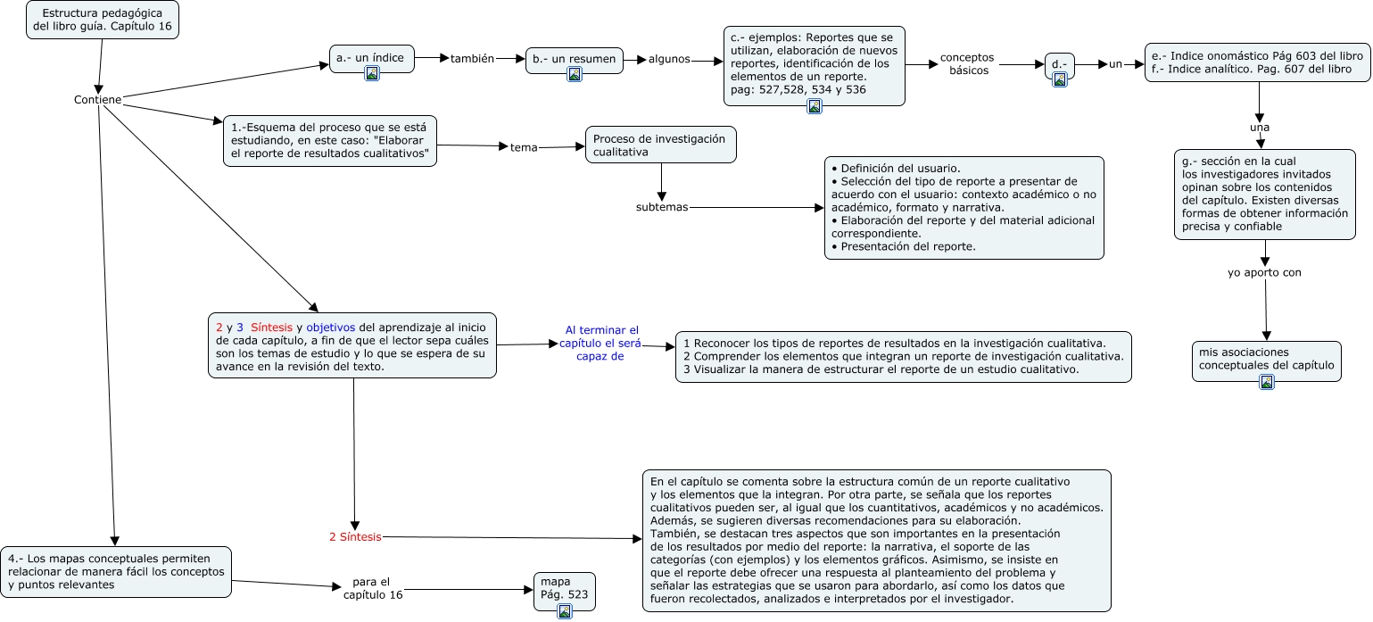 Este Cmap, tiene información relacionada con: Estructura pedagógica del capítulo 16, Proceso de investigación cualitativa subtemas • Definición del usuario. • Selección del tipo de reporte a presentar de acuerdo con el usuario: contexto académico o no académico, formato y narrativa. • Elaboración del reporte y del material adicional correspondiente. • Presentación del reporte., c.- ejemplos: Reportes que se utilizan, elaboración de nuevos reportes, identificación de los elementos de un reporte. pag: 527,528, 534 y 536 conceptos básicos d.-, 2 y 3 Síntesis y objetivos del aprendizaje al inicio de cada capítulo, a fin de que el lector sepa cuáles son los temas de estudio y lo que se espera de su avance en la revisión del texto. Al terminar el capítulo el será capaz de 1 Reconocer los tipos de reportes de resultados en la investigación cualitativa. 2 Comprender los elementos que integran un reporte de investigación cualitativa. 3 Visualizar la manera de estructurar el reporte de un estudio cualitativo., b.- un resumen algunos c.- ejemplos: Reportes que se utilizan, elaboración de nuevos reportes, identificación de los elementos de un reporte. pag: 527,528, 534 y 536, Estructura pedagógica del libro guía. Capítulo 16 Contiene 4.- Los mapas conceptuales permiten relacionar de manera fácil los conceptos y puntos relevantes, Estructura pedagógica del libro guía. Capítulo 16 Contiene 1.-Esquema del proceso que se está estudiando, en este caso: "Elaborar el reporte de resultados cualitativos", a.- un índice también b.- un resumen, Estructura pedagógica del libro guía. Capítulo 16 Contiene 2 y 3 Síntesis y objetivos del aprendizaje al inicio de cada capítulo, a fin de que el lector sepa cuáles son los temas de estudio y lo que se espera de su avance en la revisión del texto., 1.-Esquema del proceso que se está estudiando, en este caso: "Elaborar el reporte de resultados cualitativos" tema Proceso de investigación cualitativa, g.- sección en la cual los investigadores invitados opinan sobre los contenidos del capítulo. Existen diversas formas de obtener información precisa y confiable yo aporto con mis asociaciones conceptuales del capítulo, d.- un e.- Indice onomástico Pág 603 del libro f.- Indice analítico. Pag. 607 del libro, 4.- Los mapas conceptuales permiten relacionar de manera fácil los conceptos y puntos relevantes para el capítulo 16 mapa Pág. 523, Estructura pedagógica del libro guía. Capítulo 16 Contiene a.- un índice, 2 y 3 Síntesis y objetivos del aprendizaje al inicio de cada capítulo, a fin de que el lector sepa cuáles son los temas de estudio y lo que se espera de su avance en la revisión del texto. 2 Síntesis En el capítulo se comenta sobre la estructura común de un reporte cualitativo y los elementos que la integran. Por otra parte, se señala que los reportes cualitativos pueden ser, al igual que los cuantitativos, académicos y no académicos. Además, se sugieren diversas recomendaciones para su elaboración. También, se destacan tres aspectos que son importantes en la presentación de los resultados por medio del reporte: la narrativa, el soporte de las categorías (con ejemplos) y los elementos gráficos. Asimismo, se insiste en que el reporte debe ofrecer una respuesta al planteamiento del problema y señalar las estrategias que se usaron para abordarlo, así como los datos que fueron recolectados, analizados e interpretados por el investigador., e.- Indice onomástico Pág 603 del libro f.- Indice analítico. Pag. 607 del libro una g.- sección en la cual los investigadores invitados opinan sobre los contenidos del capítulo. Existen diversas formas de obtener información precisa y confiable