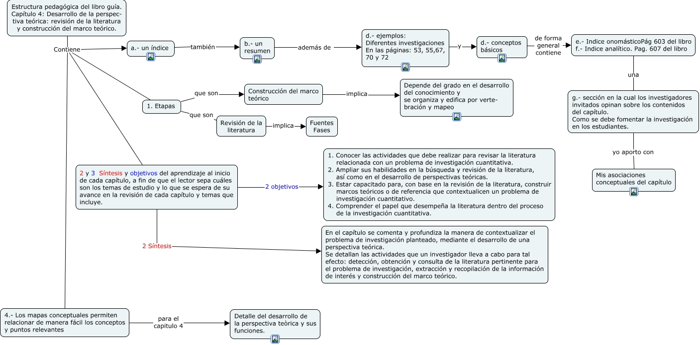 Este Cmap, tiene información relacionada con: Capitulo 4, e.- Indice onomásticoPág 603 del libro f.- Indice analítico. Pag. 607 del libro una g.- sección en la cual los investigadores invitados opinan sobre los contenidos del capítulo. Como se debe fomentar la investigación en los estudiantes., Estructura pedagógica del libro guía. Capítulo 4: Desarrollo de la perspec- tiva teórica: revisión de la literatura y construcción del marco teórico. Contiene 1. Etapas, Revisión de la literatura implica Fuentes Fases, b.- un resumen además de d.- ejemplos: Diferentes investigaciones En las páginas: 53, 55,67, 70 y 72, 2 y 3 Síntesis y objetivos del aprendizaje al inicio de cada capítulo, a fin de que el lector sepa cuáles son los temas de estudio y lo que se espera de su avance en la revisión de cada capítulo y temas que incluye. 2 objetivos 1. Conocer las actividades que debe realizar para revisar la literatura relacionada con un problema de investigación cuantitativa. 2. Ampliar sus habilidades en la búsqueda y revisión de la literatura, así como en el desarrollo de perspectivas teóricas. 3. Estar capacitado para, con base en la revisión de la literatura, construir marcos teóricos o de referencia que contextualicen un problema de investigación cuantitativo. 4. Comprender el papel que desempeña la literatura dentro del proceso de la investigación cuantitativa., 1. Etapas que son Revisión de la literatura, d.- ejemplos: Diferentes investigaciones En las páginas: 53, 55,67, 70 y 72 y d.- conceptos básicos, 4.- Los mapas conceptuales permiten relacionar de manera fácil los conceptos y puntos relevantes para el capitulo 4 Detalle del desarrollo de la perspectiva teòrica y sus funciones., Estructura pedagógica del libro guía. Capítulo 4: Desarrollo de la perspec- tiva teórica: revisión de la literatura y construcción del marco teórico. Contiene 4.- Los mapas conceptuales permiten relacionar de manera fácil los conceptos y puntos relevantes, Estructura pedagógica del libro guía. Capítulo 4: Desarrollo de la perspec- tiva teórica: revisión de la literatura y construcción del marco teórico. Contiene 2 y 3 Síntesis y objetivos del aprendizaje al inicio de cada capítulo, a fin de que el lector sepa cuáles son los temas de estudio y lo que se espera de su avance en la revisión de cada capítulo y temas que incluye., Construcción del marco teórico implica Depende del grado en el desarrollo del conocimiento y se organiza y edifica por verte- bración y mapeo, g.- sección en la cual los investigadores invitados opinan sobre los contenidos del capítulo. Como se debe fomentar la investigación en los estudiantes. yo aporto con Mis asociaciones conceptuales del capítulo, 1. Etapas que son Construcción del marco teórico, 2 y 3 Síntesis y objetivos del aprendizaje al inicio de cada capítulo, a fin de que el lector sepa cuáles son los temas de estudio y lo que se espera de su avance en la revisión de cada capítulo y temas que incluye. 2 Síntesis En el capítulo se comenta y profundiza la manera de contextualizar el problema de investigación planteado, mediante el desarrollo de una perspectiva teórica. Se detallan las actividades que un investigador lleva a cabo para tal efecto: detección, obtención y consulta de la literatura pertinente para el problema de investigación, extracción y recopilación de la información de interés y construcción del marco teórico., d.- conceptos básicos de forma general contiene e.- Indice onomásticoPág 603 del libro f.- Indice analítico. Pag. 607 del libro, Estructura pedagógica del libro guía. Capítulo 4: Desarrollo de la perspec- tiva teórica: revisión de la literatura y construcción del marco teórico. Contiene a.- un índice, a.- un índice también b.- un resumen