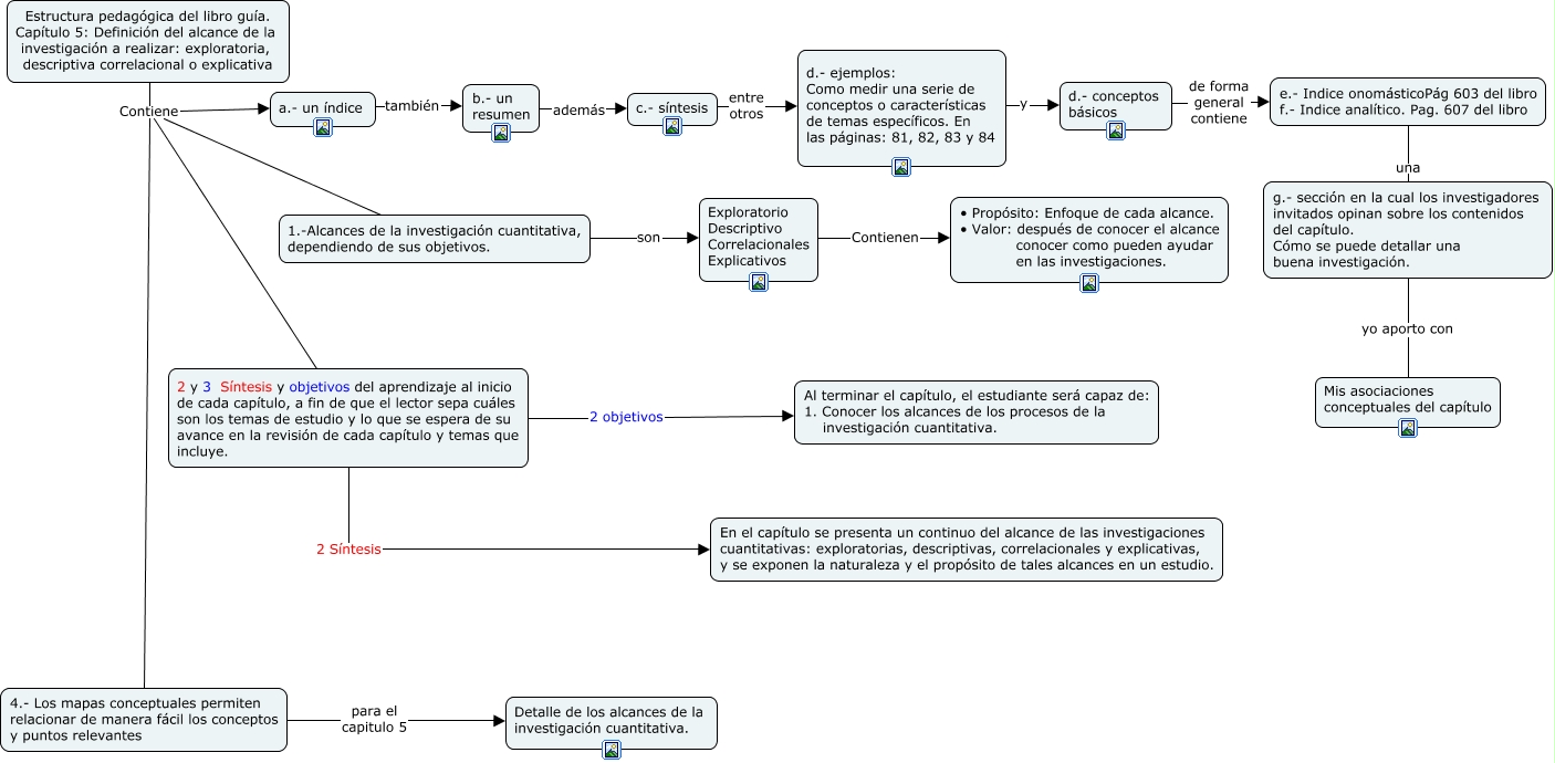 Este Cmap, tiene información relacionada con: Capítulo 5.cmap, 1.-Alcances de la investigación cuantitativa, dependiendo de sus objetivos. son Exploratorio Descriptivo Correlacionales Explicativos, 2 y 3 Síntesis y objetivos del aprendizaje al inicio de cada capítulo, a fin de que el lector sepa cuáles son los temas de estudio y lo que se espera de su avance en la revisión de cada capítulo y temas que incluye. 2 Síntesis En el capítulo se presenta un continuo del alcance de las investigaciones cuantitativas: exploratorias, descriptivas, correlacionales y explicativas, y se exponen la naturaleza y el propósito de tales alcances en un estudio., e.- Indice onomásticoPág 603 del libro f.- Indice analítico. Pag. 607 del libro una g.- sección en la cual los investigadores invitados opinan sobre los contenidos del capítulo. Cómo se puede detallar una buena investigación., d.- conceptos básicos de forma general contiene e.- Indice onomásticoPág 603 del libro f.- Indice analítico. Pag. 607 del libro, Estructura pedagógica del libro guía. Capítulo 5: Definición del alcance de la investigación a realizar: exploratoria, descriptiva correlacional o explicativa Contiene 2 y 3 Síntesis y objetivos del aprendizaje al inicio de cada capítulo, a fin de que el lector sepa cuáles son los temas de estudio y lo que se espera de su avance en la revisión de cada capítulo y temas que incluye., a.- un índice también b.- un resumen, c.- síntesis entre otros d.- ejemplos: Como medir una serie de conceptos o características de temas específicos. En las páginas: 81, 82, 83 y 84, 2 y 3 Síntesis y objetivos del aprendizaje al inicio de cada capítulo, a fin de que el lector sepa cuáles son los temas de estudio y lo que se espera de su avance en la revisión de cada capítulo y temas que incluye. 2 objetivos Al terminar el capítulo, el estudiante será capaz de: 1. Conocer los alcances de los procesos de la investigación cuantitativa., 4.- Los mapas conceptuales permiten relacionar de manera fácil los conceptos y puntos relevantes para el capitulo 5 Detalle de los alcances de la investigación cuantitativa., Exploratorio Descriptivo Correlacionales Explicativos Contienen • Propósito: Enfoque de cada alcance. • Valor: después de conocer el alcance conocer como pueden ayudar en las investigaciones., b.- un resumen además c.- síntesis, Estructura pedagógica del libro guía. Capítulo 5: Definición del alcance de la investigación a realizar: exploratoria, descriptiva correlacional o explicativa Contiene 4.- Los mapas conceptuales permiten relacionar de manera fácil los conceptos y puntos relevantes, Estructura pedagógica del libro guía. Capítulo 5: Definición del alcance de la investigación a realizar: exploratoria, descriptiva correlacional o explicativa Contiene a.- un índice, g.- sección en la cual los investigadores invitados opinan sobre los contenidos del capítulo. Cómo se puede detallar una buena investigación. yo aporto con Mis asociaciones conceptuales del capítulo, d.- ejemplos: Como medir una serie de conceptos o características de temas específicos. En las páginas: 81, 82, 83 y 84 y d.- conceptos básicos, Estructura pedagógica del libro guía. Capítulo 5: Definición del alcance de la investigación a realizar: exploratoria, descriptiva correlacional o explicativa Contiene 1.-Alcances de la investigación cuantitativa, dependiendo de sus objetivos.