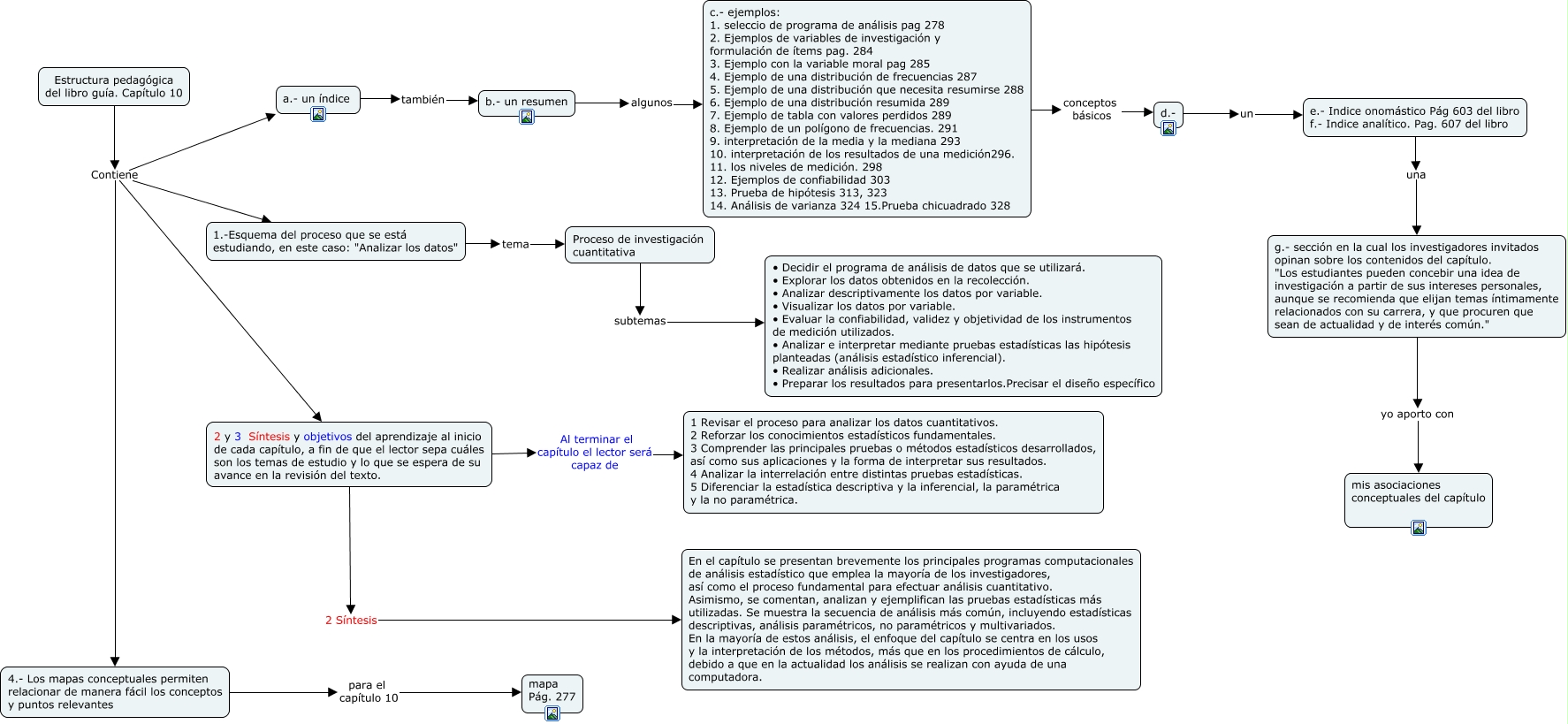 Este Cmap, tiene información relacionada con: Estructura pedagógica del capítulo 10, e.- Indice onomástico Pág 603 del libro f.- Indice analítico. Pag. 607 del libro una g.- sección en la cual los investigadores invitados opinan sobre los contenidos del capítulo. "Los estudiantes pueden concebir una idea de investigación a partir de sus intereses personales, aunque se recomienda que elijan temas íntimamente relacionados con su carrera, y que procuren que sean de actualidad y de interés común.", Estructura pedagógica del libro guía. Capítulo 10 Contiene 2 y 3 Síntesis y objetivos del aprendizaje al inicio de cada capítulo, a fin de que el lector sepa cuáles son los temas de estudio y lo que se espera de su avance en la revisión del texto., 2 y 3 Síntesis y objetivos del aprendizaje al inicio de cada capítulo, a fin de que el lector sepa cuáles son los temas de estudio y lo que se espera de su avance en la revisión del texto. Al terminar el capítulo el lector será capaz de 1 Revisar el proceso para analizar los datos cuantitativos. 2 Reforzar los conocimientos estadísticos fundamentales. 3 Comprender las principales pruebas o métodos estadísticos desarrollados, así como sus aplicaciones y la forma de interpretar sus resultados. 4 Analizar la interrelación entre distintas pruebas estadísticas. 5 Diferenciar la estadística descriptiva y la inferencial, la paramétrica y la no paramétrica., a.- un índice también b.- un resumen, d.- un e.- Indice onomástico Pág 603 del libro f.- Indice analítico. Pag. 607 del libro, Estructura pedagógica del libro guía. Capítulo 10 Contiene a.- un índice, c.- ejemplos: 1. seleccio de programa de análisis pag 278 2. Ejemplos de variables de investigación y formulación de ítems pag. 284 3. Ejemplo con la variable moral pag 285 4. Ejemplo de una distribución de frecuencias 287 5. Ejemplo de una distribución que necesita resumirse 288 6. Ejemplo de una distribución resumida 289 7. Ejemplo de tabla con valores perdidos 289 8. Ejemplo de un polígono de frecuencias. 291 9. interpretación de la media y la mediana 293 10. interpretación de los resultados de una medición296. 11. los niveles de medición. 298 12. Ejemplos de confiabilidad 303 13. Prueba de hipótesis 313, 323 14. Análisis de varianza 324 15.Prueba chicuadrado 328 conceptos básicos d.-, Proceso de investigación cuantitativa subtemas • Decidir el programa de análisis de datos que se utilizará. • Explorar los datos obtenidos en la recolección. • Analizar descriptivamente los datos por variable. • Visualizar los datos por variable. • Evaluar la confiabilidad, validez y objetividad de los instrumentos de medición utilizados. • Analizar e interpretar mediante pruebas estadísticas las hipótesis planteadas (análisis estadístico inferencial). • Realizar análisis adicionales. • Preparar los resultados para presentarlos.Precisar el diseño específico, g.- sección en la cual los investigadores invitados opinan sobre los contenidos del capítulo. "Los estudiantes pueden concebir una idea de investigación a partir de sus intereses personales, aunque se recomienda que elijan temas íntimamente relacionados con su carrera, y que procuren que sean de actualidad y de interés común." yo aporto con mis asociaciones conceptuales del capítulo, b.- un resumen algunos c.- ejemplos: 1. seleccio de programa de análisis pag 278 2. Ejemplos de variables de investigación y formulación de ítems pag. 284 3. Ejemplo con la variable moral pag 285 4. Ejemplo de una distribución de frecuencias 287 5. Ejemplo de una distribución que necesita resumirse 288 6. Ejemplo de una distribución resumida 289 7. Ejemplo de tabla con valores perdidos 289 8. Ejemplo de un polígono de frecuencias. 291 9. interpretación de la media y la mediana 293 10. interpretación de los resultados de una medición296. 11. los niveles de medición. 298 12. Ejemplos de confiabilidad 303 13. Prueba de hipótesis 313, 323 14. Análisis de varianza 324 15.Prueba chicuadrado 328, 2 y 3 Síntesis y objetivos del aprendizaje al inicio de cada capítulo, a fin de que el lector sepa cuáles son los temas de estudio y lo que se espera de su avance en la revisión del texto. 2 Síntesis En el capítulo se presentan brevemente los principales programas computacionales de análisis estadístico que emplea la mayoría de los investigadores, así como el proceso fundamental para efectuar análisis cuantitativo. Asimismo, se comentan, analizan y ejemplifican las pruebas estadísticas más utilizadas. Se muestra la secuencia de análisis más común, incluyendo estadísticas descriptivas, análisis paramétricos, no paramétricos y multivariados. En la mayoría de estos análisis, el enfoque del capítulo se centra en los usos y la interpretación de los métodos, más que en los procedimientos de cálculo, debido a que en la actualidad los análisis se realizan con ayuda de una computadora., 4.- Los mapas conceptuales permiten relacionar de manera fácil los conceptos y puntos relevantes para el capítulo 10 mapa Pág. 277, Estructura pedagógica del libro guía. Capítulo 10 Contiene 4.- Los mapas conceptuales permiten relacionar de manera fácil los conceptos y puntos relevantes, 1.-Esquema del proceso que se está estudiando, en este caso: "Analizar los datos" tema Proceso de investigación cuantitativa, Estructura pedagógica del libro guía. Capítulo 10 Contiene 1.-Esquema del proceso que se está estudiando, en este caso: "Analizar los datos"