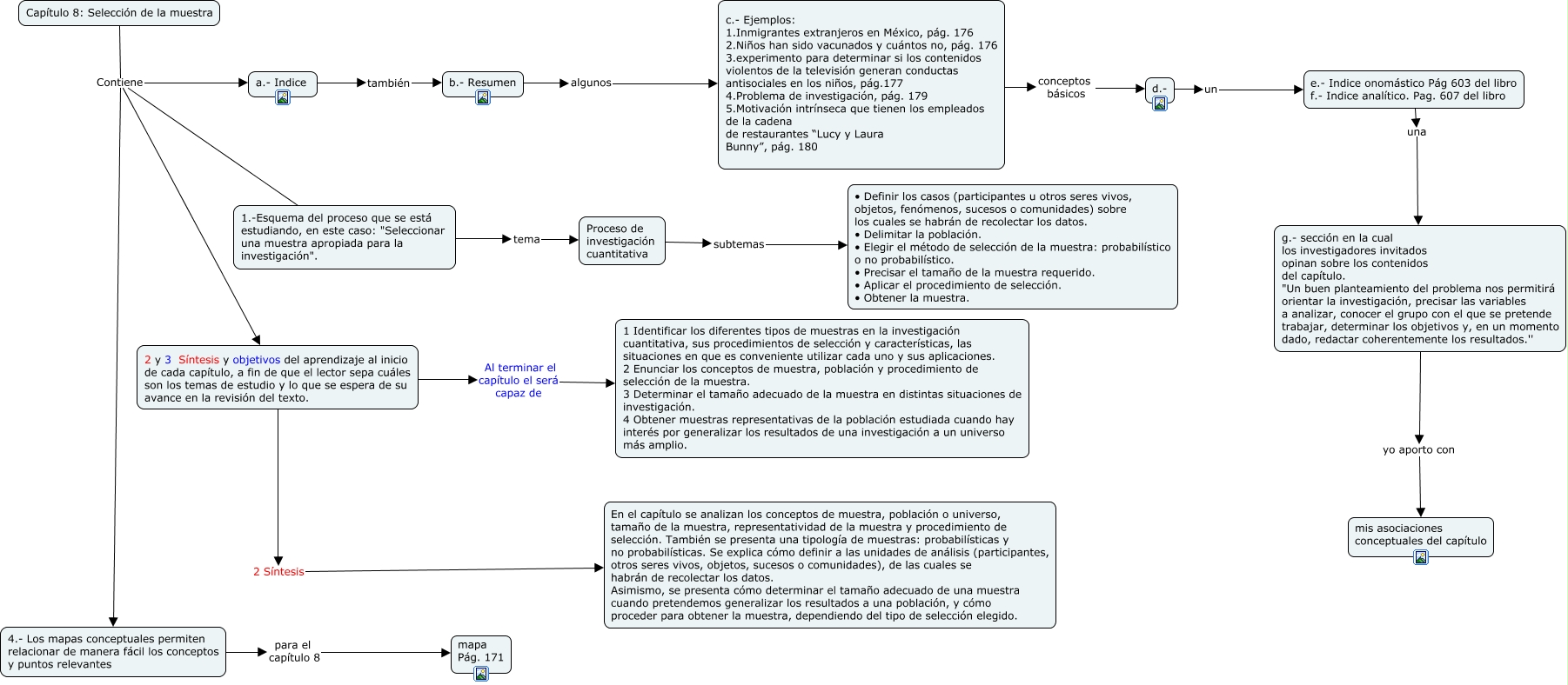 Este Cmap, tiene información relacionada con: Recursos para Estructura pedagógica del capítulo 8, g.- sección en la cual los investigadores invitados opinan sobre los contenidos del capítulo. "Un buen planteamiento del problema nos permitirá orientar la investigación, precisar las variables a analizar, conocer el grupo con el que se pretende trabajar, determinar los objetivos y, en un momento dado, redactar coherentemente los resultados.'' yo aporto con mis asociaciones conceptuales del capítulo, 4.- Los mapas conceptuales permiten relacionar de manera fácil los conceptos y puntos relevantes para el capítulo 8 mapa Pág. 171, Capítulo 8: Selección de la muestra Contiene 2 y 3 Síntesis y objetivos del aprendizaje al inicio de cada capítulo, a fin de que el lector sepa cuáles son los temas de estudio y lo que se espera de su avance en la revisión del texto., b.- Resumen algunos c.- Ejemplos: 1.Inmigrantes extranjeros en México, pág. 176 2.Niños han sido vacunados y cuántos no, pág. 176 3.experimento para determinar si los contenidos violentos de la televisión generan conductas antisociales en los niños, pág.177 4.Problema de investigación, pág. 179 5.Motivación intrínseca que tienen los empleados de la cadena de restaurantes “Lucy y Laura Bunny”, pág. 180, d.- un e.- Indice onomástico Pág 603 del libro f.- Indice analítico. Pag. 607 del libro, Capítulo 8: Selección de la muestra Contiene 1.-Esquema del proceso que se está estudiando, en este caso: "Seleccionar una muestra apropiada para la investigación"., 1.-Esquema del proceso que se está estudiando, en este caso: "Seleccionar una muestra apropiada para la investigación". tema Proceso de investigación cuantitativa, 2 y 3 Síntesis y objetivos del aprendizaje al inicio de cada capítulo, a fin de que el lector sepa cuáles son los temas de estudio y lo que se espera de su avance en la revisión del texto. Al terminar el capítulo el será capaz de 1 Identificar los diferentes tipos de muestras en la investigación cuantitativa, sus procedimientos de selección y características, las situaciones en que es conveniente utilizar cada uno y sus aplicaciones. 2 Enunciar los conceptos de muestra, población y procedimiento de selección de la muestra. 3 Determinar el tamaño adecuado de la muestra en distintas situaciones de investigación. 4 Obtener muestras representativas de la población estudiada cuando hay interés por generalizar los resultados de una investigación a un universo más amplio., Proceso de investigación cuantitativa subtemas • Definir los casos (participantes u otros seres vivos, objetos, fenómenos, sucesos o comunidades) sobre los cuales se habrán de recolectar los datos. • Delimitar la población. • Elegir el método de selección de la muestra: probabilístico o no probabilístico. • Precisar el tamaño de la muestra requerido. • Aplicar el procedimiento de selección. • Obtener la muestra., 2 y 3 Síntesis y objetivos del aprendizaje al inicio de cada capítulo, a fin de que el lector sepa cuáles son los temas de estudio y lo que se espera de su avance en la revisión del texto. 2 Síntesis En el capítulo se analizan los conceptos de muestra, población o universo, tamaño de la muestra, representatividad de la muestra y procedimiento de selección. También se presenta una tipología de muestras: probabilísticas y no probabilísticas. Se explica cómo definir a las unidades de análisis (participantes, otros seres vivos, objetos, sucesos o comunidades), de las cuales se habrán de recolectar los datos. Asimismo, se presenta cómo determinar el tamaño adecuado de una muestra cuando pretendemos generalizar los resultados a una población, y cómo proceder para obtener la muestra, dependiendo del tipo de selección elegido., e.- Indice onomástico Pág 603 del libro f.- Indice analítico. Pag. 607 del libro una g.- sección en la cual los investigadores invitados opinan sobre los contenidos del capítulo. "Un buen planteamiento del problema nos permitirá orientar la investigación, precisar las variables a analizar, conocer el grupo con el que se pretende trabajar, determinar los objetivos y, en un momento dado, redactar coherentemente los resultados.'', a.- Indice también b.- Resumen, Capítulo 8: Selección de la muestra Contiene a.- Indice, c.- Ejemplos: 1.Inmigrantes extranjeros en México, pág. 176 2.Niños han sido vacunados y cuántos no, pág. 176 3.experimento para determinar si los contenidos violentos de la televisión generan conductas antisociales en los niños, pág.177 4.Problema de investigación, pág. 179 5.Motivación intrínseca que tienen los empleados de la cadena de restaurantes “Lucy y Laura Bunny”, pág. 180 conceptos básicos d.-, Capítulo 8: Selección de la muestra Contiene 4.- Los mapas conceptuales permiten relacionar de manera fácil los conceptos y puntos relevantes