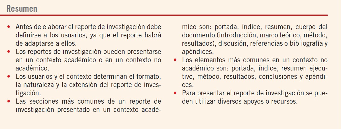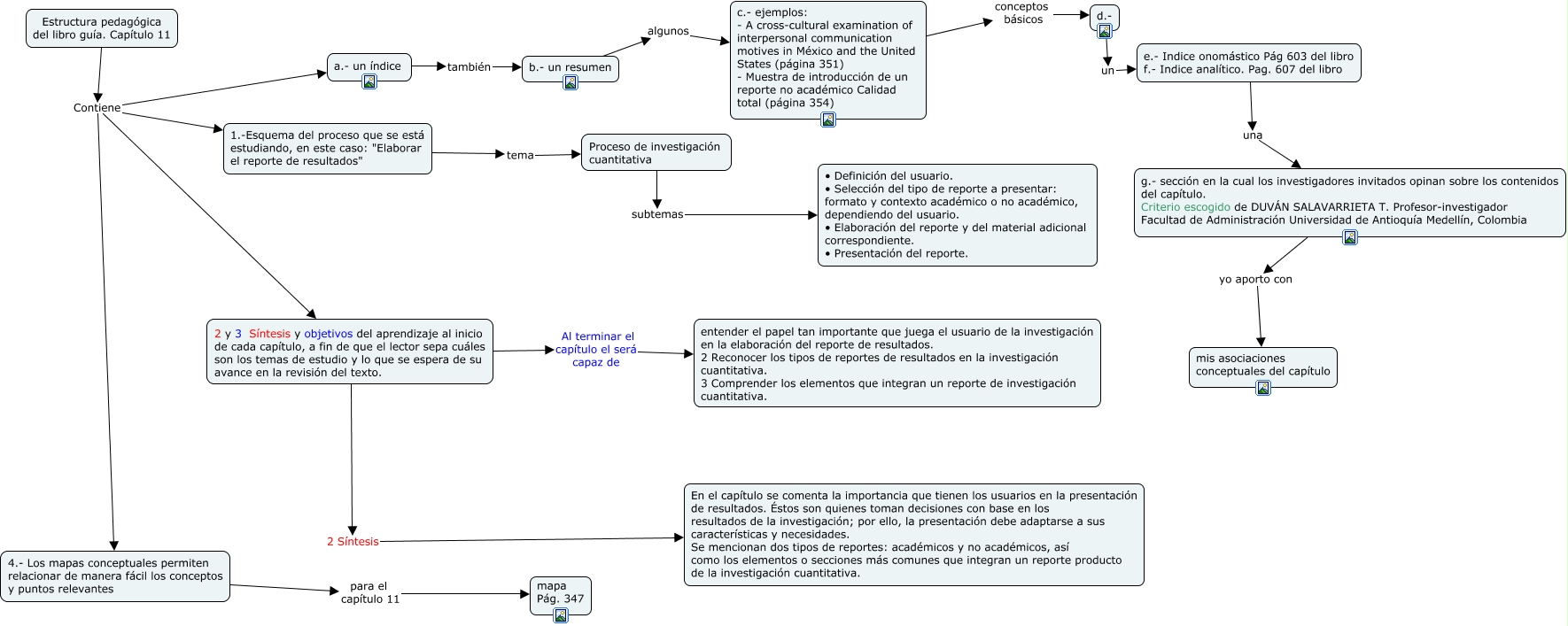 Este Cmap, tiene información relacionada con: Estructura pedagógica del capítulo 11, Proceso de investigación cuantitativa subtemas • Definición del usuario. • Selección del tipo de reporte a presentar: formato y contexto académico o no académico, dependiendo del usuario. • Elaboración del reporte y del material adicional correspondiente. • Presentación del reporte., c.- ejemplos: - A cross-cultural examination of interpersonal communication motives in México and the United States (página 351) - Muestra de introducción de un reporte no académico Calidad total (página 354) conceptos básicos d.-, 2 y 3 Síntesis y objetivos del aprendizaje al inicio de cada capítulo, a fin de que el lector sepa cuáles son los temas de estudio y lo que se espera de su avance en la revisión del texto. Al terminar el capítulo el será capaz de entender el papel tan importante que juega el usuario de la investigación en la elaboración del reporte de resultados. 2 Reconocer los tipos de reportes de resultados en la investigación cuantitativa. 3 Comprender los elementos que integran un reporte de investigación cuantitativa., b.- un resumen algunos c.- ejemplos: - A cross-cultural examination of interpersonal communication motives in México and the United States (página 351) - Muestra de introducción de un reporte no académico Calidad total (página 354), Estructura pedagógica del libro guía. Capítulo 11 Contiene 4.- Los mapas conceptuales permiten relacionar de manera fácil los conceptos y puntos relevantes, Estructura pedagógica del libro guía. Capítulo 11 Contiene 1.-Esquema del proceso que se está estudiando, en este caso: "Elaborar el reporte de resultados", a.- un índice también b.- un resumen, Estructura pedagógica del libro guía. Capítulo 11 Contiene 2 y 3 Síntesis y objetivos del aprendizaje al inicio de cada capítulo, a fin de que el lector sepa cuáles son los temas de estudio y lo que se espera de su avance en la revisión del texto., 1.-Esquema del proceso que se está estudiando, en este caso: "Elaborar el reporte de resultados" tema Proceso de investigación cuantitativa, g.- sección en la cual los investigadores invitados opinan sobre los contenidos del capítulo. Criterio escogido de DUVÁN SALAVARRIETA T. Profesor-investigador Facultad de Administración Universidad de Antioquía Medellín, Colombia yo aporto con mis asociaciones conceptuales del capítulo, d.- un e.- Indice onomástico Pág 603 del libro f.- Indice analítico. Pag. 607 del libro, 4.- Los mapas conceptuales permiten relacionar de manera fácil los conceptos y puntos relevantes para el capítulo 11 mapa Pág. 347, Estructura pedagógica del libro guía. Capítulo 11 Contiene a.- un índice, 2 y 3 Síntesis y objetivos del aprendizaje al inicio de cada capítulo, a fin de que el lector sepa cuáles son los temas de estudio y lo que se espera de su avance en la revisión del texto. 2 Síntesis En el capítulo se comenta la importancia que tienen los usuarios en la presentación de resultados. Éstos son quienes toman decisiones con base en los resultados de la investigación; por ello, la presentación debe adaptarse a sus características y necesidades. Se mencionan dos tipos de reportes: académicos y no académicos, así como los elementos o secciones más comunes que integran un reporte producto de la investigación cuantitativa., e.- Indice onomástico Pág 603 del libro f.- Indice analítico. Pag. 607 del libro una g.- sección en la cual los investigadores invitados opinan sobre los contenidos del capítulo. Criterio escogido de DUVÁN SALAVARRIETA T. Profesor-investigador Facultad de Administración Universidad de Antioquía Medellín, Colombia