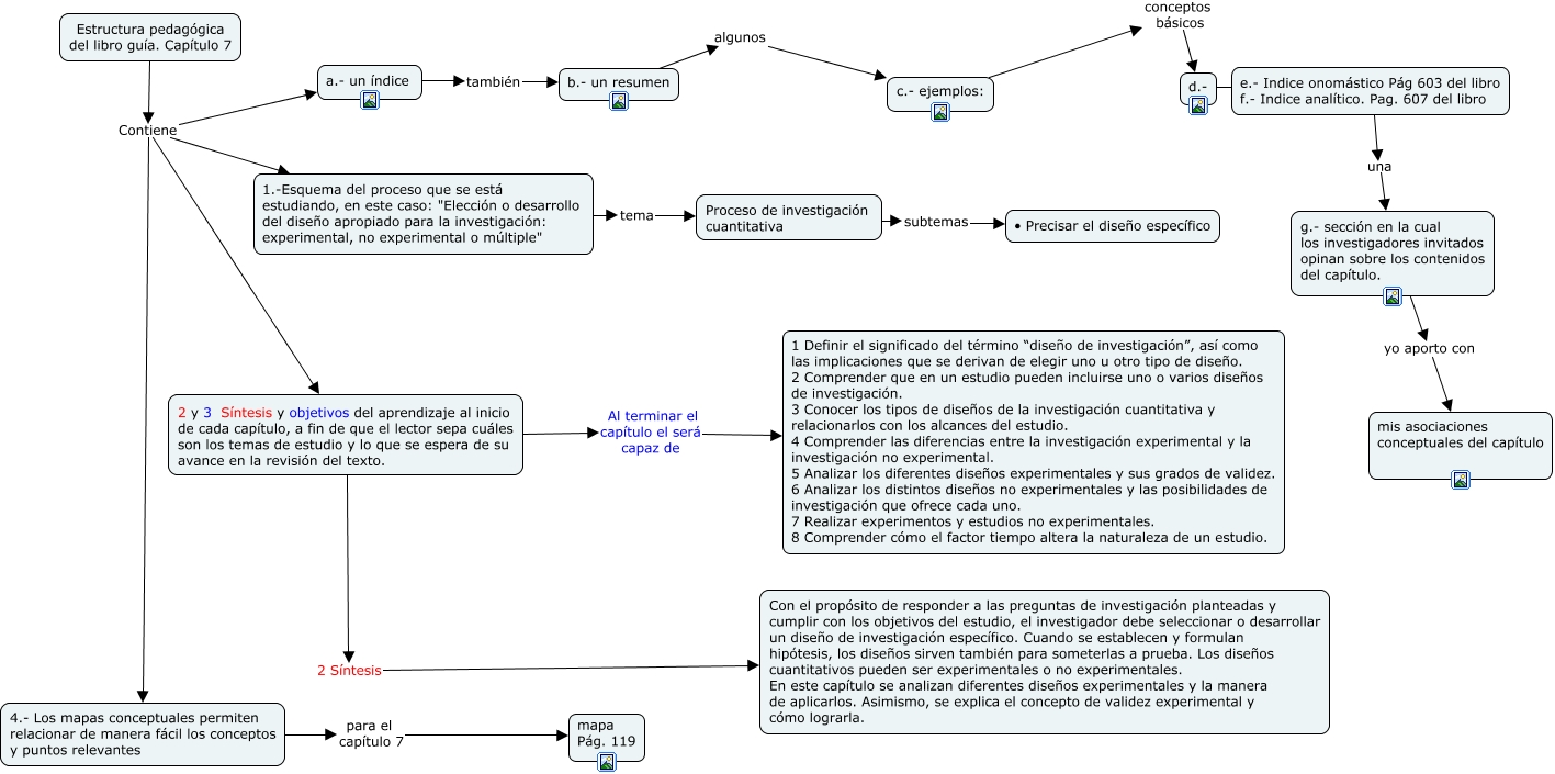 Este Cmap, tiene información relacionada con: Estructura pedagógica del capítulo 7, Proceso de investigación cuantitativa subtemas • Precisar el diseño específico, c.- ejemplos: conceptos básicos d.-, 2 y 3 Síntesis y objetivos del aprendizaje al inicio de cada capítulo, a fin de que el lector sepa cuáles son los temas de estudio y lo que se espera de su avance en la revisión del texto. Al terminar el capítulo el será capaz de 1 Definir el significado del término “diseño de investigación”, así como las implicaciones que se derivan de elegir uno u otro tipo de diseño. 2 Comprender que en un estudio pueden incluirse uno o varios diseños de investigación. 3 Conocer los tipos de diseños de la investigación cuantitativa y relacionarlos con los alcances del estudio. 4 Comprender las diferencias entre la investigación experimental y la investigación no experimental. 5 Analizar los diferentes diseños experimentales y sus grados de validez. 6 Analizar los distintos diseños no experimentales y las posibilidades de investigación que ofrece cada uno. 7 Realizar experimentos y estudios no experimentales. 8 Comprender cómo el factor tiempo altera la naturaleza de un estudio., b.- un resumen algunos c.- ejemplos:, Estructura pedagógica del libro guía. Capítulo 7 Contiene 4.- Los mapas conceptuales permiten relacionar de manera fácil los conceptos y puntos relevantes, Estructura pedagógica del libro guía. Capítulo 7 Contiene 1.-Esquema del proceso que se está estudiando, en este caso: "Elección o desarrollo del diseño apropiado para la investigación: experimental, no experimental o múltiple", a.- un índice también b.- un resumen, Estructura pedagógica del libro guía. Capítulo 7 Contiene 2 y 3 Síntesis y objetivos del aprendizaje al inicio de cada capítulo, a fin de que el lector sepa cuáles son los temas de estudio y lo que se espera de su avance en la revisión del texto., 1.-Esquema del proceso que se está estudiando, en este caso: "Elección o desarrollo del diseño apropiado para la investigación: experimental, no experimental o múltiple" tema Proceso de investigación cuantitativa, g.- sección en la cual los investigadores invitados opinan sobre los contenidos del capítulo. yo aporto con mis asociaciones conceptuales del capítulo, d.- un e.- Indice onomástico Pág 603 del libro f.- Indice analítico. Pag. 607 del libro, 4.- Los mapas conceptuales permiten relacionar de manera fácil los conceptos y puntos relevantes para el capítulo 7 mapa Pág. 119, Estructura pedagógica del libro guía. Capítulo 7 Contiene a.- un índice, 2 y 3 Síntesis y objetivos del aprendizaje al inicio de cada capítulo, a fin de que el lector sepa cuáles son los temas de estudio y lo que se espera de su avance en la revisión del texto. 2 Síntesis Con el propósito de responder a las preguntas de investigación planteadas y cumplir con los objetivos del estudio, el investigador debe seleccionar o desarrollar un diseño de investigación específico. Cuando se establecen y formulan hipótesis, los diseños sirven también para someterlas a prueba. Los diseños cuantitativos pueden ser experimentales o no experimentales. En este capítulo se analizan diferentes diseños experimentales y la manera de aplicarlos. Asimismo, se explica el concepto de validez experimental y cómo lograrla., e.- Indice onomástico Pág 603 del libro f.- Indice analítico. Pag. 607 del libro una g.- sección en la cual los investigadores invitados opinan sobre los contenidos del capítulo.