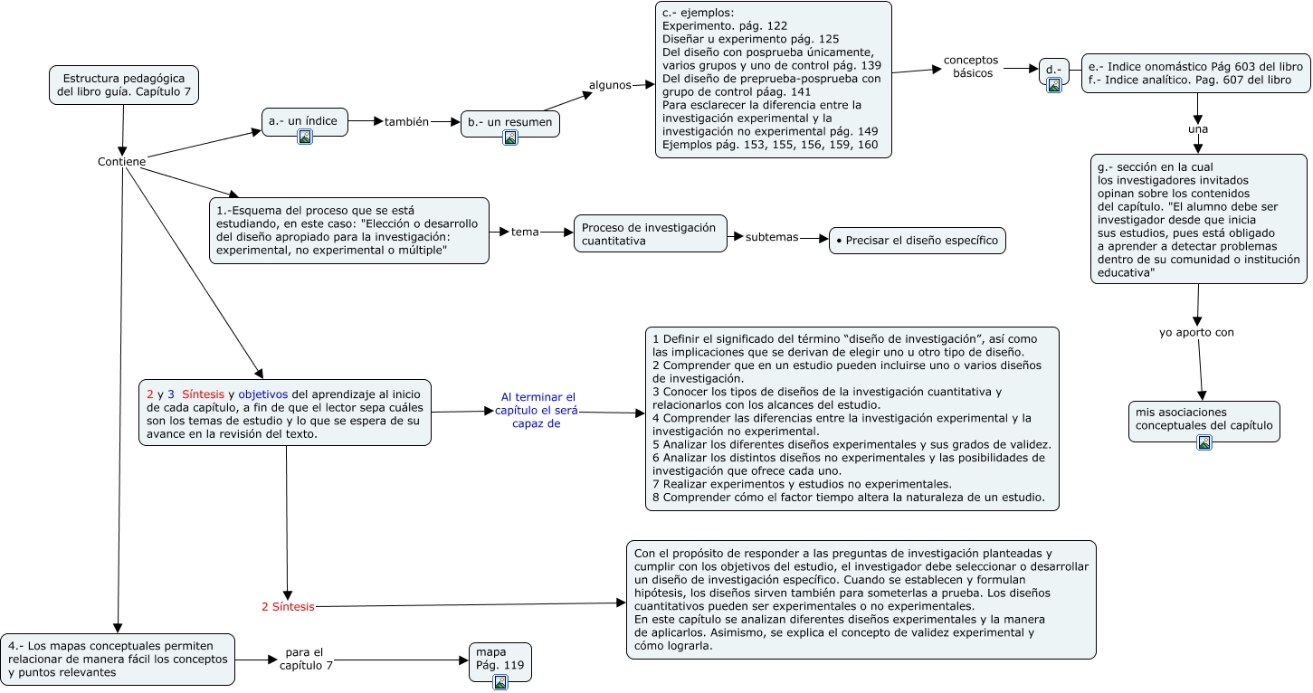 Este Cmap, tiene información relacionada con: Estructura pedagógica del capítulo 7, Proceso de investigación cuantitativa subtemas • Precisar el diseño específico, c.- ejemplos: Experimento. pág. 122 Diseñar u experimento pág. 125 Del diseño con posprueba únicamente, varios grupos y uno de control pág. 139 Del diseño de preprueba-posprueba con grupo de control páag. 141 Para esclarecer la diferencia entre la investigación experimental y la investigación no experimental pág. 149 Ejemplos pág. 153, 155, 156, 159, 160 conceptos básicos d.-, 2 y 3 Síntesis y objetivos del aprendizaje al inicio de cada capítulo, a fin de que el lector sepa cuáles son los temas de estudio y lo que se espera de su avance en la revisión del texto. Al terminar el capítulo el será capaz de 1 Definir el significado del término “diseño de investigación”, así como las implicaciones que se derivan de elegir uno u otro tipo de diseño. 2 Comprender que en un estudio pueden incluirse uno o varios diseños de investigación. 3 Conocer los tipos de diseños de la investigación cuantitativa y relacionarlos con los alcances del estudio. 4 Comprender las diferencias entre la investigación experimental y la investigación no experimental. 5 Analizar los diferentes diseños experimentales y sus grados de validez. 6 Analizar los distintos diseños no experimentales y las posibilidades de investigación que ofrece cada uno. 7 Realizar experimentos y estudios no experimentales. 8 Comprender cómo el factor tiempo altera la naturaleza de un estudio., b.- un resumen algunos c.- ejemplos: Experimento. pág. 122 Diseñar u experimento pág. 125 Del diseño con posprueba únicamente, varios grupos y uno de control pág. 139 Del diseño de preprueba-posprueba con grupo de control páag. 141 Para esclarecer la diferencia entre la investigación experimental y la investigación no experimental pág. 149 Ejemplos pág. 153, 155, 156, 159, 160, e.- Indice onomástico Pág 603 del libro f.- Indice analítico. Pag. 607 del libro una g.- sección en la cual los investigadores invitados opinan sobre los contenidos del capítulo. "El alumno debe ser investigador desde que inicia sus estudios, pues está obligado a aprender a detectar problemas dentro de su comunidad o institución educativa", Estructura pedagógica del libro guía. Capítulo 7 Contiene 4.- Los mapas conceptuales permiten relacionar de manera fácil los conceptos y puntos relevantes, Estructura pedagógica del libro guía. Capítulo 7 Contiene 2 y 3 Síntesis y objetivos del aprendizaje al inicio de cada capítulo, a fin de que el lector sepa cuáles son los temas de estudio y lo que se espera de su avance en la revisión del texto., Estructura pedagógica del libro guía. Capítulo 7 Contiene 1.-Esquema del proceso que se está estudiando, en este caso: "Elección o desarrollo del diseño apropiado para la investigación: experimental, no experimental o múltiple", a.- un índice también b.- un resumen, 1.-Esquema del proceso que se está estudiando, en este caso: "Elección o desarrollo del diseño apropiado para la investigación: experimental, no experimental o múltiple" tema Proceso de investigación cuantitativa, g.- sección en la cual los investigadores invitados opinan sobre los contenidos del capítulo. "El alumno debe ser investigador desde que inicia sus estudios, pues está obligado a aprender a detectar problemas dentro de su comunidad o institución educativa" yo aporto con mis asociaciones conceptuales del capítulo, d.- un e.- Indice onomástico Pág 603 del libro f.- Indice analítico. Pag. 607 del libro, Estructura pedagógica del libro guía. Capítulo 7 Contiene a.- un índice, 2 y 3 Síntesis y objetivos del aprendizaje al inicio de cada capítulo, a fin de que el lector sepa cuáles son los temas de estudio y lo que se espera de su avance en la revisión del texto. 2 Síntesis Con el propósito de responder a las preguntas de investigación planteadas y cumplir con los objetivos del estudio, el investigador debe seleccionar o desarrollar un diseño de investigación específico. Cuando se establecen y formulan hipótesis, los diseños sirven también para someterlas a prueba. Los diseños cuantitativos pueden ser experimentales o no experimentales. En este capítulo se analizan diferentes diseños experimentales y la manera de aplicarlos. Asimismo, se explica el concepto de validez experimental y cómo lograrla., 4.- Los mapas conceptuales permiten relacionar de manera fácil los conceptos y puntos relevantes para el capítulo 7 mapa Pág. 119