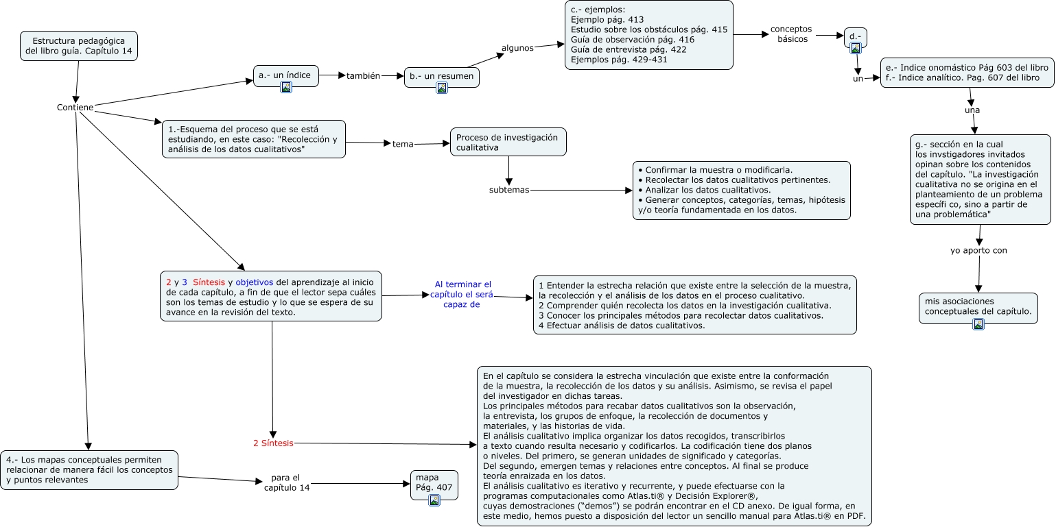 Este Cmap, tiene información relacionada con: Estructura pedagógica del capítulo 14, Proceso de investigación cualitativa subtemas • Confirmar la muestra o modificarla. • Recolectar los datos cualitativos pertinentes. • Analizar los datos cualitativos. • Generar conceptos, categorías, temas, hipótesis y/o teoría fundamentada en los datos., c.- ejemplos: Ejemplo pág. 413 Estudio sobre los obstáculos pág. 415 Guía de observación pág. 416 Guía de entrevista pág. 422 Ejemplos pág. 429-431 conceptos básicos d.-, 2 y 3 Síntesis y objetivos del aprendizaje al inicio de cada capítulo, a fin de que el lector sepa cuáles son los temas de estudio y lo que se espera de su avance en la revisión del texto. Al terminar el capítulo el será capaz de 1 Entender la estrecha relación que existe entre la selección de la muestra, la recolección y el análisis de los datos en el proceso cualitativo. 2 Comprender quién recolecta los datos en la investigación cualitativa. 3 Conocer los principales métodos para recolectar datos cualitativos. 4 Efectuar análisis de datos cualitativos., b.- un resumen algunos c.- ejemplos: Ejemplo pág. 413 Estudio sobre los obstáculos pág. 415 Guía de observación pág. 416 Guía de entrevista pág. 422 Ejemplos pág. 429-431, Estructura pedagógica del libro guía. Capítulo 14 Contiene 4.- Los mapas conceptuales permiten relacionar de manera fácil los conceptos y puntos relevantes, Estructura pedagógica del libro guía. Capítulo 14 Contiene 1.-Esquema del proceso que se está estudiando, en este caso: "Recolección y análisis de los datos cualitativos", a.- un índice también b.- un resumen, Estructura pedagógica del libro guía. Capítulo 14 Contiene 2 y 3 Síntesis y objetivos del aprendizaje al inicio de cada capítulo, a fin de que el lector sepa cuáles son los temas de estudio y lo que se espera de su avance en la revisión del texto., 1.-Esquema del proceso que se está estudiando, en este caso: "Recolección y análisis de los datos cualitativos" tema Proceso de investigación cualitativa, g.- sección en la cual los invstigadores invitados opinan sobre los contenidos del capítulo. "La investigación cualitativa no se origina en el planteamiento de un problema específi co, sino a partir de una problemática" yo aporto con mis asociaciones conceptuales del capítulo., d.- un e.- Indice onomástico Pág 603 del libro f.- Indice analítico. Pag. 607 del libro, 4.- Los mapas conceptuales permiten relacionar de manera fácil los conceptos y puntos relevantes para el capítulo 14 mapa Pág. 407, Estructura pedagógica del libro guía. Capítulo 14 Contiene a.- un índice, 2 y 3 Síntesis y objetivos del aprendizaje al inicio de cada capítulo, a fin de que el lector sepa cuáles son los temas de estudio y lo que se espera de su avance en la revisión del texto. 2 Síntesis En el capítulo se considera la estrecha vinculación que existe entre la conformación de la muestra, la recolección de los datos y su análisis. Asimismo, se revisa el papel del investigador en dichas tareas. Los principales métodos para recabar datos cualitativos son la observación, la entrevista, los grupos de enfoque, la recolección de documentos y materiales, y las historias de vida. El análisis cualitativo implica organizar los datos recogidos, transcribirlos a texto cuando resulta necesario y codificarlos. La codificación tiene dos planos o niveles. Del primero, se generan unidades de significado y categorías. Del segundo, emergen temas y relaciones entre conceptos. Al final se produce teoría enraizada en los datos. El análisis cualitativo es iterativo y recurrente, y puede efectuarse con la programas computacionales como Atlas.ti® y Decisión Explorer®, cuyas demostraciones (“demos”) se podrán encontrar en el CD anexo. De igual forma, en este medio, hemos puesto a disposición del lector un sencillo manual para Atlas.ti® en PDF., e.- Indice onomástico Pág 603 del libro f.- Indice analítico. Pag. 607 del libro una g.- sección en la cual los invstigadores invitados opinan sobre los contenidos del capítulo. "La investigación cualitativa no se origina en el planteamiento de un problema específi co, sino a partir de una problemática"