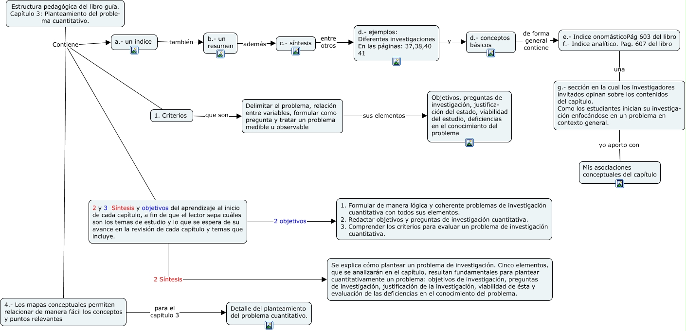 Este Cmap, tiene información relacionada con: Estructura pedagógica del capítulo 3, 2 y 3 Síntesis y objetivos del aprendizaje al inicio de cada capítulo, a fin de que el lector sepa cuáles son los temas de estudio y lo que se espera de su avance en la revisión de cada capítulo y temas que incluye. 2 objetivos 1. Formular de manera lógica y coherente problemas de investigación cuantitativa con todos sus elementos. 2. Redactar objetivos y preguntas de investigación cuantitativa. 3. Comprender los criterios para evaluar un problema de investigación cuantitativa., Delimitar el problema, relación entre variables, formular como pregunta y tratar un problema medible u observable sus elementos Objetivos, preguntas de investigación, justifica- ción del estado, viabilidad del estudio, deficiencias en el conocimiento del problema, e.- Indice onomásticoPág 603 del libro f.- Indice analítico. Pag. 607 del libro una g.- sección en la cual los investigadores invitados opinan sobre los contenidos del capítulo. Como los estudiantes inician su investiga- ción enfocándose en un problema en contexto general., g.- sección en la cual los investigadores invitados opinan sobre los contenidos del capítulo. Como los estudiantes inician su investiga- ción enfocándose en un problema en contexto general. yo aporto con Mis asociaciones conceptuales del capítulo, 4.- Los mapas conceptuales permiten relacionar de manera fácil los conceptos y puntos relevantes para el capitulo 3 Detalle del planteamiento del problema cuantitativo., a.- un índice también b.- un resumen, Estructura pedagógica del libro guía. Capítulo 3: Planteamiento del proble- ma cuantitativo. Contiene 2 y 3 Síntesis y objetivos del aprendizaje al inicio de cada capítulo, a fin de que el lector sepa cuáles son los temas de estudio y lo que se espera de su avance en la revisión de cada capítulo y temas que incluye., 2 y 3 Síntesis y objetivos del aprendizaje al inicio de cada capítulo, a fin de que el lector sepa cuáles son los temas de estudio y lo que se espera de su avance en la revisión de cada capítulo y temas que incluye. 2 Síntesis Se explica cómo plantear un problema de investigación. Cinco elementos, que se analizarán en el capítulo, resultan fundamentales para plantear cuantitativamente un problema: objetivos de investigación, preguntas de investigación, justificación de la investigación, viabilidad de ésta y evaluación de las deficiencias en el conocimiento del problema., d.- ejemplos: Diferentes investigaciones En las páginas: 37,38,40 41 y d.- conceptos básicos, Estructura pedagógica del libro guía. Capítulo 3: Planteamiento del proble- ma cuantitativo. Contiene a.- un índice, Estructura pedagógica del libro guía. Capítulo 3: Planteamiento del proble- ma cuantitativo. Contiene 1. Criterios, 1. Criterios que son Delimitar el problema, relación entre variables, formular como pregunta y tratar un problema medible u observable, b.- un resumen además c.- síntesis, Estructura pedagógica del libro guía. Capítulo 3: Planteamiento del proble- ma cuantitativo. Contiene 4.- Los mapas conceptuales permiten relacionar de manera fácil los conceptos y puntos relevantes, d.- conceptos básicos de forma general contiene e.- Indice onomásticoPág 603 del libro f.- Indice analítico. Pag. 607 del libro, c.- síntesis entre otros d.- ejemplos: Diferentes investigaciones En las páginas: 37,38,40 41