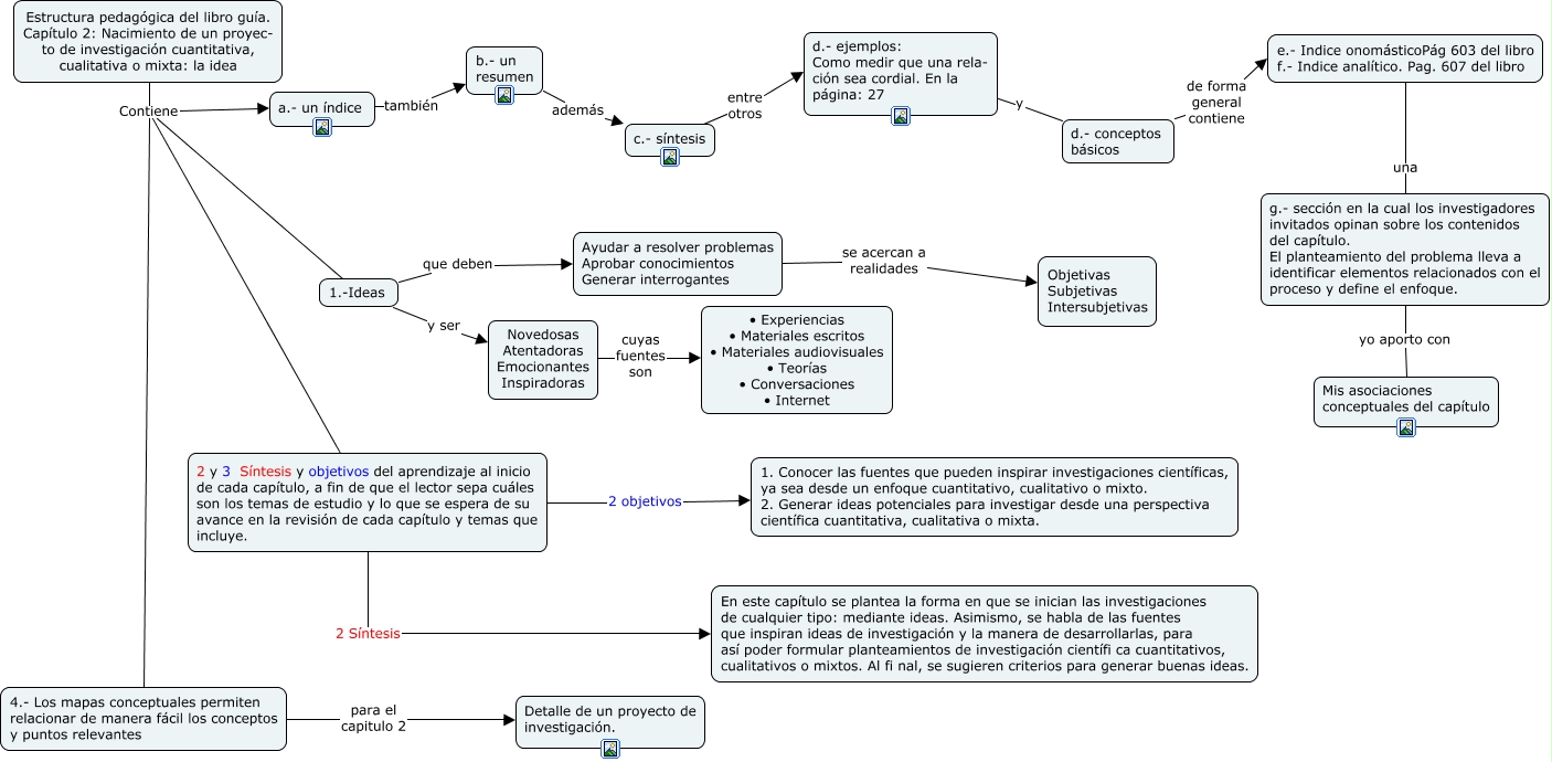 Este Cmap, tiene información relacionada con: Estructura pedagógica del capítulo 2, g.- sección en la cual los investigadores invitados opinan sobre los contenidos del capítulo. El planteamiento del problema lleva a identificar elementos relacionados con el proceso y define el enfoque. yo aporto con Mis asociaciones conceptuales del capítulo, Estructura pedagógica del libro guía. Capítulo 2: Nacimiento de un proyec- to de investigación cuantitativa, cualitativa o mixta: la idea Contiene 2 y 3 Síntesis y objetivos del aprendizaje al inicio de cada capítulo, a fin de que el lector sepa cuáles son los temas de estudio y lo que se espera de su avance en la revisión de cada capítulo y temas que incluye., 4.- Los mapas conceptuales permiten relacionar de manera fácil los conceptos y puntos relevantes para el capitulo 2 Detalle de un proyecto de investigación., Ayudar a resolver problemas Aprobar conocimientos Generar interrogantes se acercan a realidades Objetivas Subjetivas Intersubjetivas, c.- síntesis entre otros d.- ejemplos: Como medir que una rela- ción sea cordial. En la página: 27, a.- un índice también b.- un resumen, d.- conceptos básicos de forma general contiene e.- Indice onomásticoPág 603 del libro f.- Indice analítico. Pag. 607 del libro, 2 y 3 Síntesis y objetivos del aprendizaje al inicio de cada capítulo, a fin de que el lector sepa cuáles son los temas de estudio y lo que se espera de su avance en la revisión de cada capítulo y temas que incluye. 2 Síntesis En este capítulo se plantea la forma en que se inician las investigaciones de cualquier tipo: mediante ideas. Asimismo, se habla de las fuentes que inspiran ideas de investigación y la manera de desarrollarlas, para así poder formular planteamientos de investigación científi ca cuantitativos, cualitativos o mixtos. Al fi nal, se sugieren criterios para generar buenas ideas., Estructura pedagógica del libro guía. Capítulo 2: Nacimiento de un proyec- to de investigación cuantitativa, cualitativa o mixta: la idea Contiene 1.-Ideas, 1.-Ideas y ser Novedosas Atentadoras Emocionantes Inspiradoras, Novedosas Atentadoras Emocionantes Inspiradoras cuyas fuentes son • Experiencias • Materiales escritos • Materiales audiovisuales • Teorías • Conversaciones • Internet, 1.-Ideas que deben Ayudar a resolver problemas Aprobar conocimientos Generar interrogantes, b.- un resumen además c.- síntesis, 2 y 3 Síntesis y objetivos del aprendizaje al inicio de cada capítulo, a fin de que el lector sepa cuáles son los temas de estudio y lo que se espera de su avance en la revisión de cada capítulo y temas que incluye. 2 objetivos 1. Conocer las fuentes que pueden inspirar investigaciones científicas, ya sea desde un enfoque cuantitativo, cualitativo o mixto. 2. Generar ideas potenciales para investigar desde una perspectiva científica cuantitativa, cualitativa o mixta., Estructura pedagógica del libro guía. Capítulo 2: Nacimiento de un proyec- to de investigación cuantitativa, cualitativa o mixta: la idea Contiene 4.- Los mapas conceptuales permiten relacionar de manera fácil los conceptos y puntos relevantes, d.- ejemplos: Como medir que una rela- ción sea cordial. En la página: 27 y d.- conceptos básicos, e.- Indice onomásticoPág 603 del libro f.- Indice analítico. Pag. 607 del libro una g.- sección en la cual los investigadores invitados opinan sobre los contenidos del capítulo. El planteamiento del problema lleva a identificar elementos relacionados con el proceso y define el enfoque., Estructura pedagógica del libro guía. Capítulo 2: Nacimiento de un proyec- to de investigación cuantitativa, cualitativa o mixta: la idea Contiene a.- un índice