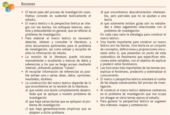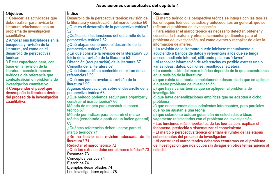 Este Cmap, tiene información relacionada con: Estructura pedagógica del capítulo 4, Estructura pedagógica del libro guía. CAPÍTULO 4 Contiene 2 y 3 Síntesis y objetivos del aprendizaje al inicio de cada capítulo, a fin de que el lector sepa cuáles son los temas de estudio y lo que se espera de su avance en la revisión del texto., Proceso de la investigación cuantitativa subtemas Desarrollo de la perspectiva teórica: • Revisar la literatura. • Detectar la literatura pendiente. • Obtener la literatura pendiente. • Consultar la literatura pertinente. • Extraer y recopilar la información de interés. • Construir el marco teórico., 1. Esquema del proceso que se está estudiando: Desarrollo de la perspectiva teórica: revisión de la literatura y construcción del marco teórico tema Proceso de la investigación cuantitativa, a. Un índice también b. Un resumen, e. Índice onomástico Pg. 603 Libro f. Índice analítico Pg. 607 Libro una g. Sección en la cual los investigadores invitados opinian sobre los contenidos del capítulo: Crear la costumbre de investigar es una obligación. Asimismo se deben fomentar el desarrollo de proyectos que tengan aplicaciones prácticas, ya que uno de los parámetros que caracterizan una buena investigación es que tenga cierta utilidad, que resuelva problemas en la sociedad o en las empresas, y no se quede sólo en el papel, aunque sea publicado., g. Sección en la cual los investigadores invitados opinian sobre los contenidos del capítulo: Crear la costumbre de investigar es una obligación. Asimismo se deben fomentar el desarrollo de proyectos que tengan aplicaciones prácticas, ya que uno de los parámetros que caracterizan una buena investigación es que tenga cierta utilidad, que resuelva problemas en la sociedad o en las empresas, y no se quede sólo en el papel, aunque sea publicado. Yo aporto con: Mis asociaciones conceptuales del capítulo, c. Ejemplos: 1.- (Pág. 53) Sobre una investigación sin sentido. 2.- (Pág. 55) Búsqueda en Internet. 3.- (Pág. 67) El clima organizacional. 4.- (Pág. 70) Ejemplo de un índice vertebrado. 5.- (Pág. 72) Redactar el marco teórico. 6.- (Pág. 74) Ejemplos desarrollados. conceptos Básicos d., d. y e. Índice onomástico Pg. 603 Libro f. Índice analítico Pg. 607 Libro, Estructura pedagógica del libro guía. CAPÍTULO 4 Contiene a. Un índice, Estructura pedagógica del libro guía. CAPÍTULO 4 Contiene 4. Los mapas conceptuales permiten relacionar de manera fácil los conceptos y puntos relevantes., 2 y 3 Síntesis y objetivos del aprendizaje al inicio de cada capítulo, a fin de que el lector sepa cuáles son los temas de estudio y lo que se espera de su avance en la revisión del texto. 3. Objetivos 1. Conocer las actividades que debe realizar para revisar la literatura relacionada con un problema de investigación cuantitativa. 2. Ampliar sus habilidades en la búsqueda y revisión de la literatura, así como en el desarrollo de perspectivas teóricas. 3. Estar capacitado para, con base en la revisión de la literatura, construir marcos teóricos o de referencia que contextualicen un problema de investigación cuantitativo. 4. Comprender el papel que desempeña la literatura dentro del proceso de la investigación cuantitativa., Estructura pedagógica del libro guía. CAPÍTULO 4 Contiene 1. Esquema del proceso que se está estudiando: Desarrollo de la perspectiva teórica: revisión de la literatura y construcción del marco teórico, 2 y 3 Síntesis y objetivos del aprendizaje al inicio de cada capítulo, a fin de que el lector sepa cuáles son los temas de estudio y lo que se espera de su avance en la revisión del texto. 2. Síntesis En el capítulo se comenta y profundiza la manera de contextualizar el problema de investigación planteado, mediante el desarrollo de una perspectiva teórica. Se detallan las actividades que un investigador lleva a cabo para tal efecto: detección, obtención y consulta de la literatura pertinente para el problema de investigación, extracción y recopilación de la información de interés y construcción del marco teórico., 4. Los mapas conceptuales permiten relacionar de manera fácil los conceptos y puntos relevantes. para el capítulo 4 Mapa Pág. 51, b. Un resumen algunos c. Ejemplos: 1.- (Pág. 53) Sobre una investigación sin sentido. 2.- (Pág. 55) Búsqueda en Internet. 3.- (Pág. 67) El clima organizacional. 4.- (Pág. 70) Ejemplo de un índice vertebrado. 5.- (Pág. 72) Redactar el marco teórico. 6.- (Pág. 74) Ejemplos desarrollados.
