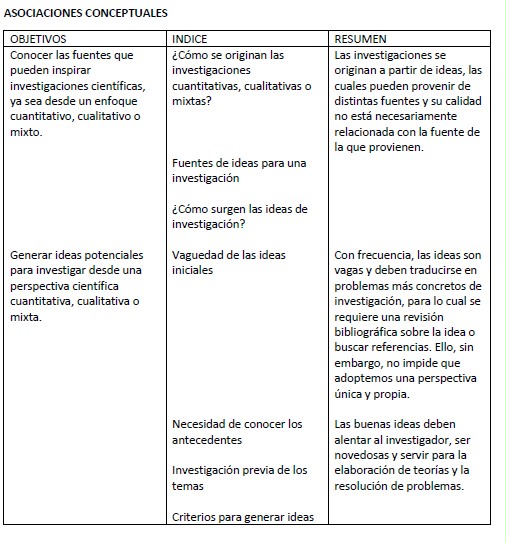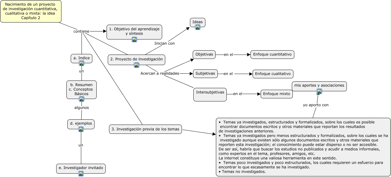 Este Cmap, tiene información relacionada con: Estructura pedagógica del capitulo 2, a. Indice un b. Resumen c. Conceptos Básicos, b. Resumen c. Conceptos Básicos algunos d. ejemplos, Objetivas en el Enfoque cuantitativo, Nacimiento de un proyecto de investigación cuantitativa, cualitativa o mixta: la idea Capítulo 2 contiene a. Indice, Nacimiento de un proyecto de investigación cuantitativa, cualitativa o mixta: la idea Capítulo 2 contiene 2. Proyecto de investigación, d. ejemplos un e. Investigador invitado, 2. Proyecto de investigación Acercan a realidades Objetivas, Nacimiento de un proyecto de investigación cuantitativa, cualitativa o mixta: la idea Capítulo 2 contiene 3. Investigación previa de los temas, Nacimiento de un proyecto de investigación cuantitativa, cualitativa o mixta: la idea Capítulo 2 contiene 1. Objetivo del aprendizaje y síntesis, • Temas ya investigados, estructurados y formalizados, sobre los cuales es posible encontrar documentos escritos y otros materiales que reportan los resultados de investigaciones anteriores. • Temas ya investigados pero menos estructurados y formalizados, sobre los cuales se ha investigado aunque existen sólo algunos documentos escritos y otros materiales que reporten esta investigación; el conocimiento puede estar disperso o no ser accesible. De ser así, habría que buscar los estudios no publicados y acudir a medios informales, como expertos en el tema, profesores, amigos, etc. La internet constituye una valiosa herramienta en este sentido. • Temas poco investigados y poco estructurados, los cuales requieren un esfuerzo para encontrar lo que escasamente se ha investigado. • Temas no investigados. yo aporto con mis aportes y asociaciones, Subjetivas en el Enfoque cualitativo, 2. Proyecto de investigación Acercan a realidades Intersubjetivas, 2. Proyecto de investigación Inician con Ideas, Intersubjetivas en el Enfoque mixto, 2. Proyecto de investigación Acercan a realidades Subjetivas, 3. Investigación previa de los temas ???? • Temas ya investigados, estructurados y formalizados, sobre los cuales es posible encontrar documentos escritos y otros materiales que reportan los resultados de investigaciones anteriores. • Temas ya investigados pero menos estructurados y formalizados, sobre los cuales se ha investigado aunque existen sólo algunos documentos escritos y otros materiales que reporten esta investigación; el conocimiento puede estar disperso o no ser accesible. De ser así, habría que buscar los estudios no publicados y acudir a medios informales, como expertos en el tema, profesores, amigos, etc. La internet constituye una valiosa herramienta en este sentido. • Temas poco investigados y poco estructurados, los cuales requieren un esfuerzo para encontrar lo que escasamente se ha investigado. • Temas no investigados.