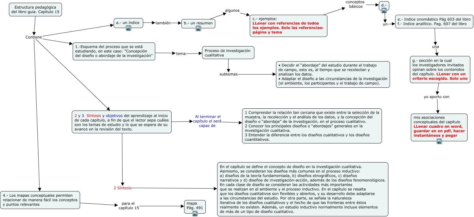 Este Cmap, tiene información relacionada con: Estructura pedagógica del capítulo 15, Proceso de investigación cualitativa subtemas • Decidir el “abordaje” del estudio durante el trabajo de campo, esto es, al tiempo que se recolectan y analizan los datos. • Adaptar el diseño a las circunstancias de la investigación (el ambiente, los participantes y el trabajo de campo)., c.- ejemplos: LLenar con referencias de todos los ejemplos. Solo las referencias: página y tema conceptos básicos d.-, b.- un resumen algunos c.- ejemplos: LLenar con referencias de todos los ejemplos. Solo las referencias: página y tema, 2 y 3 Síntesis y objetivos del aprendizaje al inicio de cada capítulo, a fin de que el lector sepa cuáles son los temas de estudio y lo que se espera de su avance en la revisión del texto. Al terminar el capítulo el será capaz de 1 Comprender la relación tan cercana que existe entre la selección de la muestra, la recolección y el análisis de los datos, y la concepción del diseño o “abordaje” de la investigación, en el proceso cualitativo. 2 Conocer los principales diseños o “abordajes” generales en la investigación cualitativa. 3 Entender la diferencia entre los diseños cualitativos y los diseños cuantitativos., Estructura pedagógica del libro guía. Capítulo 15 Contiene 4.- Los mapas conceptuales permiten relacionar de manera fácil los conceptos y puntos relevantes, Estructura pedagógica del libro guía. Capítulo 15 Contiene 2 y 3 Síntesis y objetivos del aprendizaje al inicio de cada capítulo, a fin de que el lector sepa cuáles son los temas de estudio y lo que se espera de su avance en la revisión del texto., a.- un índice también b.- un resumen, Estructura pedagógica del libro guía. Capítulo 15 Contiene 1.-Esquema del proceso que se está estudiando, en este caso: "Concepción del diseño o abordaje de la investigación", 1.-Esquema del proceso que se está estudiando, en este caso: "Concepción del diseño o abordaje de la investigación" tema Proceso de investigación cualitativa, g.- sección en la cual los investigadores invitados opinan sobre los contenidos del capítulo. LLenar con un criterio escogido. Solo uno yo aporto con mis asociaciones conceptuales del capítulo LLenar cuadro en word, guardar en en pdf, hacer instantáneos y pegar, 2 y 3 Síntesis y objetivos del aprendizaje al inicio de cada capítulo, a fin de que el lector sepa cuáles son los temas de estudio y lo que se espera de su avance en la revisión del texto. 2 Síntesis En el capítulo se define el concepto de diseño en la investigación cualitativa. Asimismo, se consideran los diseños más comunes en el proceso inductivo: a) diseños de la teoría fundamentada, b) diseños etnográficos, c) diseños narrativos y d) diseños de investigación-acción, además de los diseños fenomenológicos. En cada clase de diseño se consideran las actividades más importantes que se realizan en el ambiente y el proceso inductivo. En el capítulo se resalta que los diseños cualitativos son flexibles y abiertos, y su desarrollo debe adaptarse a las circunstancias del estudio. Por otra parte, se señala la naturaleza iterativa de los diseños cualitativos y el hecho de que las fronteras entre éstos realmente no existen. Además, un estudio inductivo normalmente incluye elementos de más de un tipo de diseño cualitativo., Estructura pedagógica del libro guía. Capítulo 15 Contiene a.- un índice, 4.- Los mapas conceptuales permiten relacionar de manera fácil los conceptos y puntos relevantes para el capítulo 15 mapa Pág. 491, d.- un e.- Indice onomástico Pág 603 del libro f.- Indice analítico. Pag. 607 del libro, e.- Indice onomástico Pág 603 del libro f.- Indice analítico. Pag. 607 del libro una g.- sección en la cual los investigadores invitados opinan sobre los contenidos del capítulo. LLenar con un criterio escogido. Solo uno