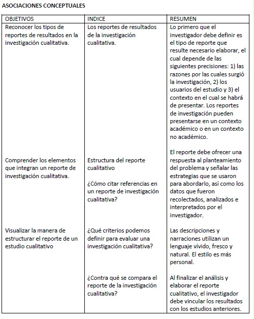 Este Cmap, tiene información relacionada con: Estructura pedagógica del capítulo 16, Proceso de investigación cualitativa subtemas • Definición del usuario. • Selección del tipo de reporte a presentar de acuerdo con el usuario: contexto académico o no académico, formato y narrativa. • Elaboración del reporte y del material adicional correspondiente. • Presentación del reporte., c.- ejemplos: LLenar con referencias de todos los ejemplos. Solo las referencias: página y tema conceptos básicos d.-, b.- un resumen algunos c.- ejemplos: LLenar con referencias de todos los ejemplos. Solo las referencias: página y tema, 2 y 3 Síntesis y objetivos del aprendizaje al inicio de cada capítulo, a fin de que el lector sepa cuáles son los temas de estudio y lo que se espera de su avance en la revisión del texto. Al terminar el capítulo el será capaz de 1 Reconocer los tipos de reportes de resultados en la investigación cualitativa. 2 Comprender los elementos que integran un reporte de investigación cualitativa. 3 Visualizar la manera de estructurar el reporte de un estudio cualitativo., Estructura pedagógica del libro guía. Capítulo 16 Contiene 4.- Los mapas conceptuales permiten relacionar de manera fácil los conceptos y puntos relevantes, Estructura pedagógica del libro guía. Capítulo 16 Contiene 2 y 3 Síntesis y objetivos del aprendizaje al inicio de cada capítulo, a fin de que el lector sepa cuáles son los temas de estudio y lo que se espera de su avance en la revisión del texto., a.- un índice también b.- un resumen, Estructura pedagógica del libro guía. Capítulo 16 Contiene 1.-Esquema del proceso que se está estudiando, en este caso: "Elaborar el reporte de resultados cualitativos", 1.-Esquema del proceso que se está estudiando, en este caso: "Elaborar el reporte de resultados cualitativos" tema Proceso de investigación cualitativa, g.- sección en la cual los investigadores invitados opinan sobre los contenidos del capítulo. LLenar con un criterio escogido. Solo uno yo aporto con mis asociaciones conceptuales del capítulo LLenar cuadro en word, guardar en en pdf, hacer instantáneos y pegar, 2 y 3 Síntesis y objetivos del aprendizaje al inicio de cada capítulo, a fin de que el lector sepa cuáles son los temas de estudio y lo que se espera de su avance en la revisión del texto. 2 Síntesis En el capítulo se comenta sobre la estructura común de un reporte cualitativo y los elementos que la integran. Por otra parte, se señala que los reportes cualitativos pueden ser, al igual que los cuantitativos, académicos y no académicos. Además, se sugieren diversas recomendaciones para su elaboración. También, se destacan tres aspectos que son importantes en la presentación de los resultados por medio del reporte: la narrativa, el soporte de las categorías (con ejemplos) y los elementos gráficos. Asimismo, se insiste en que el reporte debe ofrecer una respuesta al planteamiento del problema y señalar las estrategias que se usaron para abordarlo, así como los datos que fueron recolectados, analizados e interpretados por el investigador., Estructura pedagógica del libro guía. Capítulo 16 Contiene a.- un índice, 4.- Los mapas conceptuales permiten relacionar de manera fácil los conceptos y puntos relevantes para el capítulo 16 mapa Pág. 523, d.- un e.- Indice onomástico Pág 603 del libro f.- Indice analítico. Pag. 607 del libro, e.- Indice onomástico Pág 603 del libro f.- Indice analítico. Pag. 607 del libro una g.- sección en la cual los investigadores invitados opinan sobre los contenidos del capítulo. LLenar con un criterio escogido. Solo uno