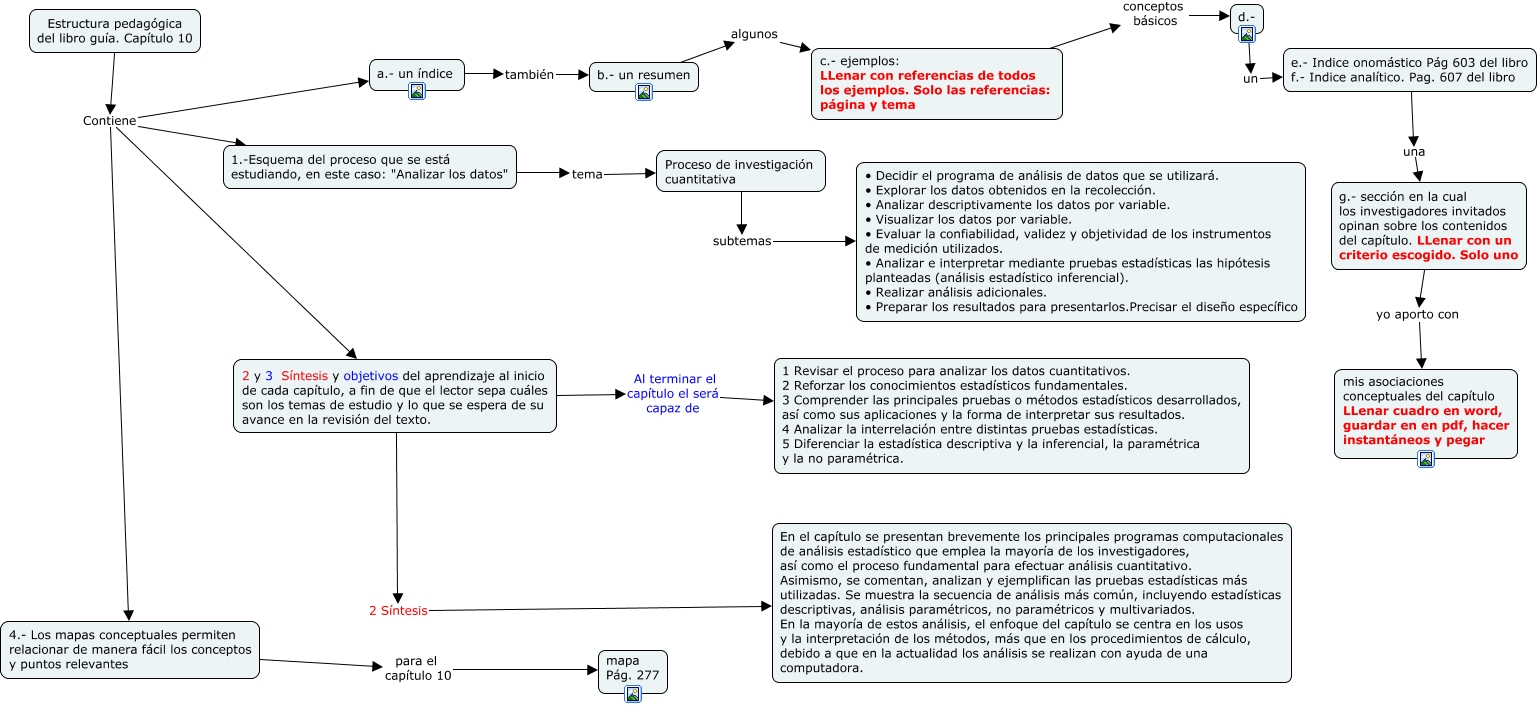 Este Cmap, tiene información relacionada con: Estructura pedagógica del capítulo 10, Proceso de investigación cuantitativa subtemas • Decidir el programa de análisis de datos que se utilizará. • Explorar los datos obtenidos en la recolección. • Analizar descriptivamente los datos por variable. • Visualizar los datos por variable. • Evaluar la confiabilidad, validez y objetividad de los instrumentos de medición utilizados. • Analizar e interpretar mediante pruebas estadísticas las hipótesis planteadas (análisis estadístico inferencial). • Realizar análisis adicionales. • Preparar los resultados para presentarlos.Precisar el diseño específico, c.- ejemplos: LLenar con referencias de todos los ejemplos. Solo las referencias: página y tema conceptos básicos d.-, b.- un resumen algunos c.- ejemplos: LLenar con referencias de todos los ejemplos. Solo las referencias: página y tema, 2 y 3 Síntesis y objetivos del aprendizaje al inicio de cada capítulo, a fin de que el lector sepa cuáles son los temas de estudio y lo que se espera de su avance en la revisión del texto. Al terminar el capítulo el será capaz de 1 Revisar el proceso para analizar los datos cuantitativos. 2 Reforzar los conocimientos estadísticos fundamentales. 3 Comprender las principales pruebas o métodos estadísticos desarrollados, así como sus aplicaciones y la forma de interpretar sus resultados. 4 Analizar la interrelación entre distintas pruebas estadísticas. 5 Diferenciar la estadística descriptiva y la inferencial, la paramétrica y la no paramétrica., Estructura pedagógica del libro guía. Capítulo 10 Contiene 4.- Los mapas conceptuales permiten relacionar de manera fácil los conceptos y puntos relevantes, Estructura pedagógica del libro guía. Capítulo 10 Contiene 2 y 3 Síntesis y objetivos del aprendizaje al inicio de cada capítulo, a fin de que el lector sepa cuáles son los temas de estudio y lo que se espera de su avance en la revisión del texto., a.- un índice también b.- un resumen, Estructura pedagógica del libro guía. Capítulo 10 Contiene 1.-Esquema del proceso que se está estudiando, en este caso: "Analizar los datos", 1.-Esquema del proceso que se está estudiando, en este caso: "Analizar los datos" tema Proceso de investigación cuantitativa, g.- sección en la cual los investigadores invitados opinan sobre los contenidos del capítulo. LLenar con un criterio escogido. Solo uno yo aporto con mis asociaciones conceptuales del capítulo LLenar cuadro en word, guardar en en pdf, hacer instantáneos y pegar, 2 y 3 Síntesis y objetivos del aprendizaje al inicio de cada capítulo, a fin de que el lector sepa cuáles son los temas de estudio y lo que se espera de su avance en la revisión del texto. 2 Síntesis En el capítulo se presentan brevemente los principales programas computacionales de análisis estadístico que emplea la mayoría de los investigadores, así como el proceso fundamental para efectuar análisis cuantitativo. Asimismo, se comentan, analizan y ejemplifican las pruebas estadísticas más utilizadas. Se muestra la secuencia de análisis más común, incluyendo estadísticas descriptivas, análisis paramétricos, no paramétricos y multivariados. En la mayoría de estos análisis, el enfoque del capítulo se centra en los usos y la interpretación de los métodos, más que en los procedimientos de cálculo, debido a que en la actualidad los análisis se realizan con ayuda de una computadora., Estructura pedagógica del libro guía. Capítulo 10 Contiene a.- un índice, 4.- Los mapas conceptuales permiten relacionar de manera fácil los conceptos y puntos relevantes para el capítulo 10 mapa Pág. 277, d.- un e.- Indice onomástico Pág 603 del libro f.- Indice analítico. Pag. 607 del libro, e.- Indice onomástico Pág 603 del libro f.- Indice analítico. Pag. 607 del libro una g.- sección en la cual los investigadores invitados opinan sobre los contenidos del capítulo. LLenar con un criterio escogido. Solo uno