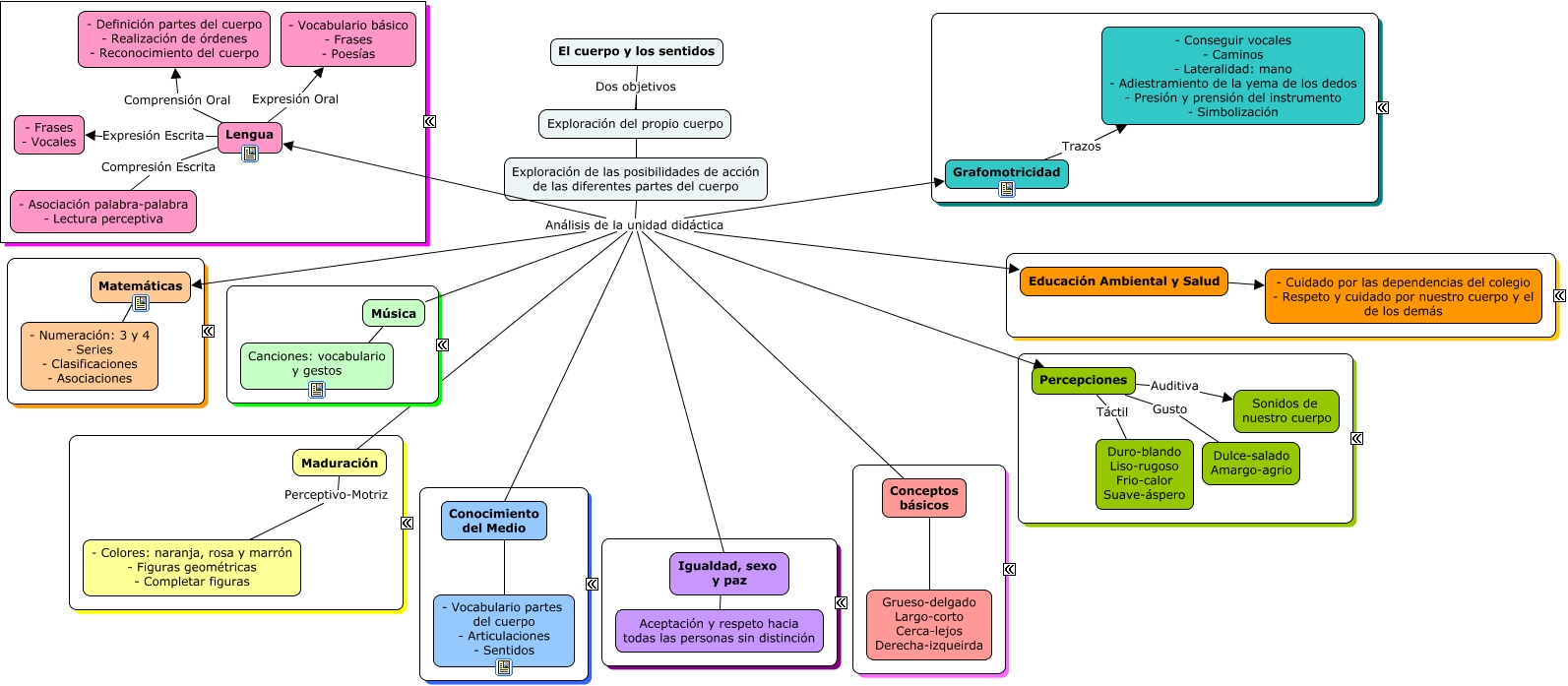 Este Cmap, tiene información relacionada con: El cuerpo y los sentidos, Grafomotricidad Trazos - Conseguir vocales - Caminos - Lateralidad: mano - Adiestramiento de la yema de los dedos - Presión y prensión del instrumento - Simbolización, Lengua Compresión Escrita - Asociación palabra-palabra - Lectura perceptiva, Lengua Expresión Escrita - Frases - Vocales, Exploración de las posibilidades de acción de las diferentes partes del cuerpo Análisis de la unidad didáctica Educación Ambiental y Salud, Percepciones Táctil Duro-blando Liso-rugoso Frio-calor Suave-áspero, Exploración de las posibilidades de acción de las diferentes partes del cuerpo Análisis de la unidad didáctica Lengua, Conocimiento del Medio ???? - Vocabulario partes del cuerpo - Articulaciones - Sentidos, Educación Ambiental y Salud ???? - Cuidado por las dependencias del colegio - Respeto y cuidado por nuestro cuerpo y el de los demás, Percepciones Gusto Dulce-salado Amargo-agrio, Exploración de las posibilidades de acción de las diferentes partes del cuerpo Análisis de la unidad didáctica Música, El cuerpo y los sentidos Dos objetivos Exploración del propio cuerpo, Exploración de las posibilidades de acción de las diferentes partes del cuerpo Análisis de la unidad didáctica Percepciones, Exploración de las posibilidades de acción de las diferentes partes del cuerpo Dos objetivos Exploración del propio cuerpo, Exploración de las posibilidades de acción de las diferentes partes del cuerpo Análisis de la unidad didáctica Grafomotricidad, Exploración de las posibilidades de acción de las diferentes partes del cuerpo Análisis de la unidad didáctica Maduración, Igualdad, sexo y paz ???? Aceptación y respeto hacia todas las personas sin distinción, Exploración de las posibilidades de acción de las diferentes partes del cuerpo Análisis de la unidad didáctica Conceptos básicos, Exploración de las posibilidades de acción de las diferentes partes del cuerpo Análisis de la unidad didáctica Conocimiento del Medio, Lengua Comprensión Oral - Definición partes del cuerpo - Realización de órdenes - Reconocimiento del cuerpo, Conceptos básicos ???? Grueso-delgado Largo-corto Cerca-lejos Derecha-izqueirda