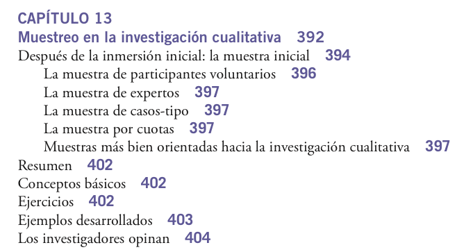 Recursos para Estructura pedagógica del capítulo 13 Asociaciones conceptuales del Capítulo 13.docx conceptos cap 13.jpg Figura 13.1 Esencia muestreo cualitativo.jpg Figura 13.2 Muestras confirmativas.jpg Figura 13.3 Esencia de la toma de decisiones para la muestra inicial en estudios cualitativos.jpg indice cap13.png mapa conceptual cap 13.jpg opinion cap 13.jpg Resumen cap 13.jpg tabla 13.1.png