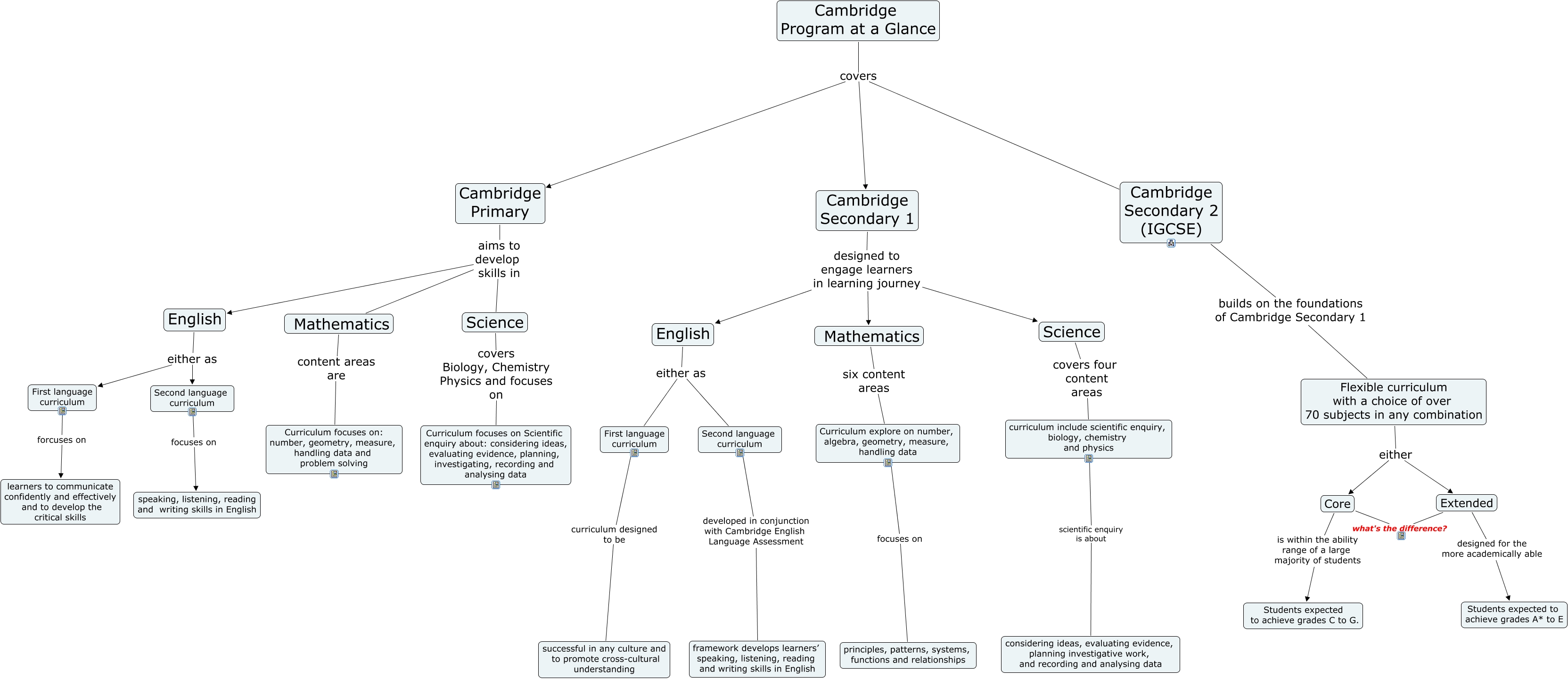 This Concept Map, created with IHMC CmapTools, has information related to: Cambridge Program at a glance, Second language curriculum focuses on speaking, listening, reading and writing skills in English, Cambridge Secondary 2 (IGCSE) builds on the foundations of Cambridge Secondary 1 Flexible curriculum with a choice of over 70 subjects in any combination, English either as First language curriculum, Cambridge Program at a Glance covers Cambridge Secondary 1, Cambridge Program at a Glance covers Cambridge Secondary 2 (IGCSE), Second language curriculum developed in conjunction with Cambridge English Language Assessment framework develops learners’ speaking, listening, reading and writing skills in English, Cambridge Secondary 1 designed to engage learners in learning journey English, Cambridge Secondary 1 designed to engage learners in learning journey Mathematics, Cambridge Program at a Glance covers Cambridge Primary, Core what's the difference? Extended, Cambridge Primary aims to develop skills in Mathematics, curriculum include scientific enquiry, biology, chemistry and physics scientific enquiry is about considering ideas, evaluating evidence, planning investigative work, and recording and analysing data, Extended designed for the more academically able Students expected to achieve grades A* to E, Core is within the ability range of a large majority of students Students expected to achieve grades C to G., First language curriculum curriculum designed to be successful in any culture and to promote cross-cultural understanding, Mathematics content areas are Curriculum focuses on: number, geometry, measure, handling data and problem solving, English either as First language curriculum, Science covers four content areas curriculum include scientific enquiry, biology, chemistry and physics, Curriculum explore on number, algebra, geometry, measure, handling data focuses on principles, patterns, systems, functions and relationships, Flexible curriculum with a choice of over 70 subjects in any combination either Core