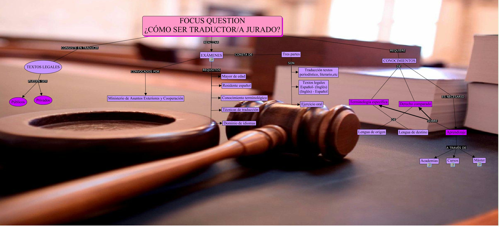 Este Cmap, tiene información relacionada con: CmapTool Focus Question, TEXTOS LEGALES PUEDEN SER Públicos, Terminología específica DE Derecho comparado, FOCUS QUESTION ¿CÓMO SER TRADUCTOR/A JURADO? REALIZAR EXÁMENES, TEXTOS LEGALES PUEDEN SER Privados, Aprendizaje A TRAVÉS DE Cursos, EXÁMENES CONSTA DE Tres partes, Aprendizaje A TRAVÉS DE Máster, EXÁMENES REQUSITOS Residente español, Aprendizaje SOBRE Terminología específica, EXÁMENES REQUSITOS Dominio de idiomas, CONOCIMIENTOS ES NECESARIO Aprendizaje, EXÁMENES REQUSITOS Mayor de edad, Terminología específica DE Lengua de destino, EXÁMENES REQUSITOS Conocimiento terminológico, CONOCIMIENTOS DE Terminología específica, EXÁMENES CONVOCADOS POR Ministerio de Asuntos Exteriores y Cooperación, EXÁMENES REQUSITOS Técnicas de traducción, Terminología específica DE Lengua de origen, FOCUS QUESTION ¿CÓMO SER TRADUCTOR/A JURADO? CONSISTE EN TRADUCIR TEXTOS LEGALES, Tres partes SON Traducción textos periodístico, literario,etc