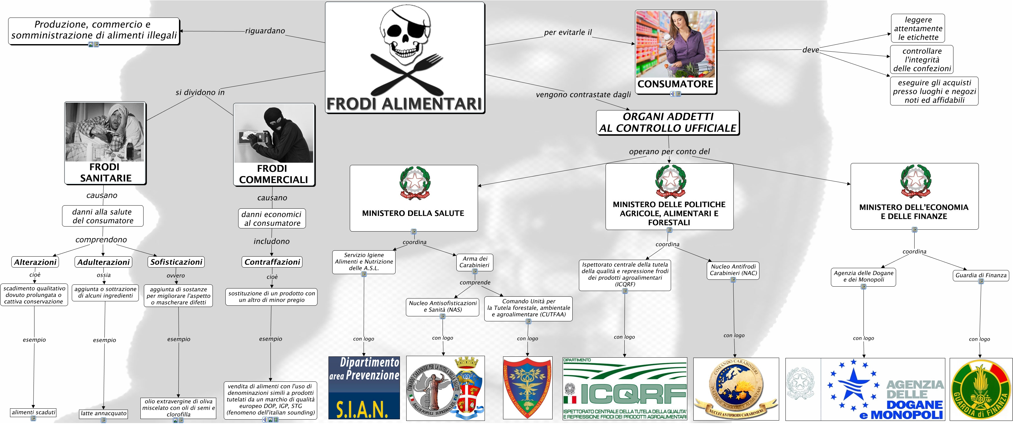 Questa Cmap, creata con IHMC CmapTools, contiene informazioni relative a: MAPPA FRODI ALIMENTARI, ORGANI ADDETTI AL CONTROLLO UFFICIALE operano per conto del, coordina Arma dei Carabinieri, danni alla salute del consumatore comprendono Adulterazioni, deve eseguire gli acquisti presso luoghi e negozi noti ed affidabili, Alterazioni cioè scadimento qualitativo dovuto prolungata o cattiva conservazione, Arma dei Carabinieri comprende Nucleo Antisofisticazioni e Sanità (NAS), Servizio Igiene Alimenti e Nutrizione delle A.S.L. con logo, deve leggere attentamente le etichette, causano danni economici al consumatore, danni alla salute del consumatore comprendono Alterazioni, scadimento qualitativo dovuto prolungata o cattiva conservazione esempio alimenti scaduti, Sofisticazioni ovvero aggiunta di sostanze per migliorare l'aspetto o mascherare difetti, deve controllare l'integrità delle confezioni, coordina Guardia di Finanza, aggiunta di sostanze per migliorare l'aspetto o mascherare difetti esempio olio extravergine di oliva miscelato con oli di semi e clorofilla, Comando Unità per la Tutela forestale, ambientale e agroalimentare (CUTFAA) con logo, causano danni alla salute del consumatore, vengono contrastate dagli ORGANI ADDETTI AL CONTROLLO UFFICIALE, Nucleo Antifrodi Carabinieri (NAC) con logo, danni alla salute del consumatore comprendono Sofisticazioni