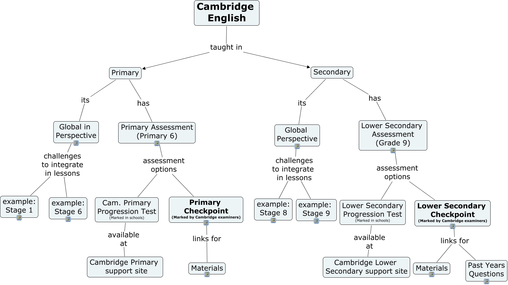 This Concept Map, created with IHMC CmapTools, has information related to: Cambridge Pri & Sec English, Global in Perspective challenges to integrate in lessons example: Stage 1, Lower Secondary Checkpoint (Marked by Cambridge examiners) links for Materials, Primary its Global in Perspective, Cambridge English taught in Primary, Lower Secondary Progression Test (Marked in schools) available at Cambridge Lower Secondary support site, Lower Secondary Assessment (Grade 9) assessment options Lower Secondary Progression Test (Marked in schools), Secondary its Global Perspective, Secondary has Lower Secondary Assessment (Grade 9), Cambridge English taught in Secondary, Primary Assessment (Primary 6) assessment options Primary Checkpoint (Marked by Cambridge examiners), Global Perspective challenges to integrate in lessons example: Stage 9, Primary Assessment (Primary 6) assessment options Cam. Primary Progression Test (Marked in schools), Cam. Primary Progression Test (Marked in schools) available at Cambridge Primary support site, Primary Checkpoint (Marked by Cambridge examiners) links for Materials, Global Perspective challenges to integrate in lessons example: Stage 8, Global in Perspective challenges to integrate in lessons example: Stage 6, Primary has Primary Assessment (Primary 6), Lower Secondary Checkpoint (Marked by Cambridge examiners) links for Past Years Questions, Lower Secondary Assessment (Grade 9) assessment options Lower Secondary Checkpoint (Marked by Cambridge examiners)