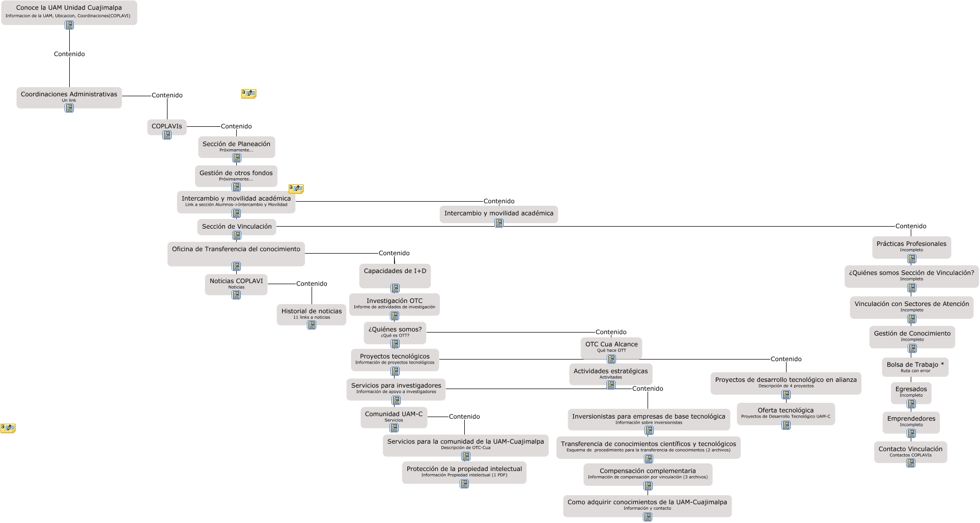 Este Cmap, tiene información relacionada con: COPLAVI, Servicios para investigadores Información de apoyo a investigadores Contenido Como adquirir conocimientos de la UAM-Cuajimalpa Información y contacto, Coordinaciones Administrativas Un link Contenido COPLAVIs, Conoce la UAM Unidad Cuajimalpa Informacion de la UAM, Ubicacion, Coordinaciones(COPLAVI) Contenido Coordinaciones Administrativas Un link, ¿Quiénes somos? ¿Qué es OTT? Contenido Actividades estratégicas Activitades, COPLAVIs Contenido Noticias COPLAVI Noticias, Comunidad UAM-C Servicios Contenido Protección de la propiedad intelectual Información Propiedad intelectual (1 PDF), Intercambio y movilidad académica Link a sección Alumnos->Intercambio y Movilidad Contenido Intercambio y movilidad académica, Noticias COPLAVI Noticias Contenido Historial de noticias 11 links a noticias, Oficina de Transferencia del conocimiento Contenido Comunidad UAM-C Servicios, Proyectos tecnológicos Información de proyectos tecnológicos Contenido Oferta tecnológica Proyectos de Desarrollo Tecnológico UAM-C, Sección de Vinculación Contenido Contacto Vinculación Contactos COPLAVIs, Oficina de Transferencia del conocimiento Contenido Capacidades de I+D