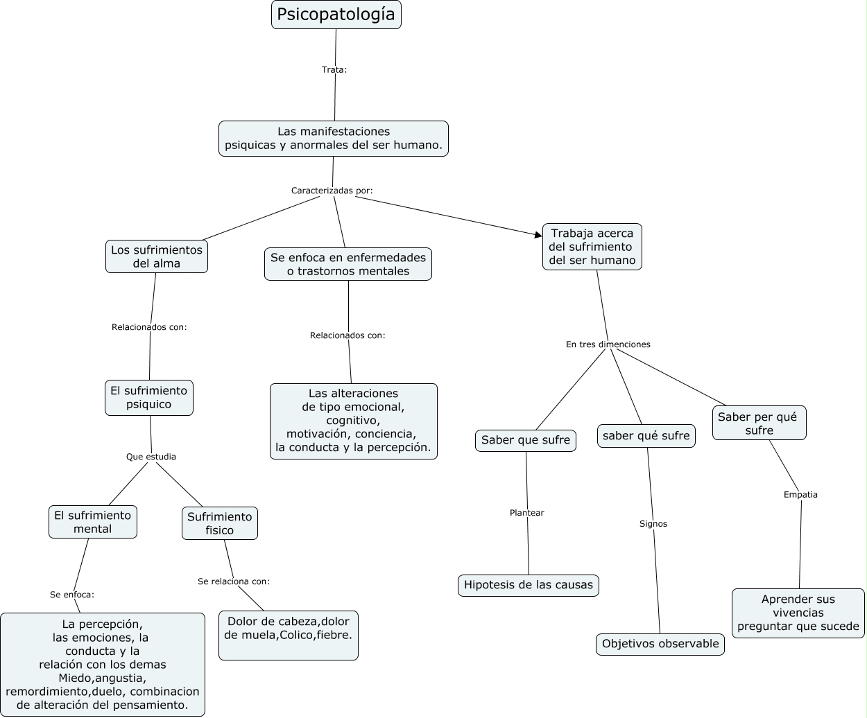 Este Cmap, tiene información relacionada con: psicopatologia, Saber que sufre Plantear Hipotesis de las causas, Trabaja acerca del sufrimiento del ser humano En tres dimenciones Saber per qué sufre, Se enfoca en enfermedades o trastornos mentales Relacionados con: Las alteraciones de tipo emocional, cognitivo, motivación, conciencia, la conducta y la percepción., Las manifestaciones psiquicas y anormales del ser humano. Caracterizadas por: Trabaja acerca del sufrimiento del ser humano, Saber per qué sufre Empatia Aprender sus vivencias preguntar que sucede, Psicopatología Trata: Las manifestaciones psiquicas y anormales del ser humano., El sufrimiento psiquico Que estudia El sufrimiento mental, El sufrimiento mental Se enfoca: La percepción, las emociones, la conducta y la relación con los demas Miedo,angustia, remordimiento,duelo, combinacion de alteración del pensamiento., Trabaja acerca del sufrimiento del ser humano En tres dimenciones Saber que sufre, saber qué sufre Signos Objetivos observable, Las manifestaciones psiquicas y anormales del ser humano. Caracterizadas por: Los sufrimientos del alma, Los sufrimientos del alma Relacionados con: El sufrimiento psiquico, El sufrimiento psiquico Que estudia Sufrimiento fisico, Las manifestaciones psiquicas y anormales del ser humano. Caracterizadas por: Se enfoca en enfermedades o trastornos mentales, Trabaja acerca del sufrimiento del ser humano En tres dimenciones saber qué sufre, Sufrimiento fisico Se relaciona con: Dolor de cabeza,dolor de muela,Colico,fiebre.