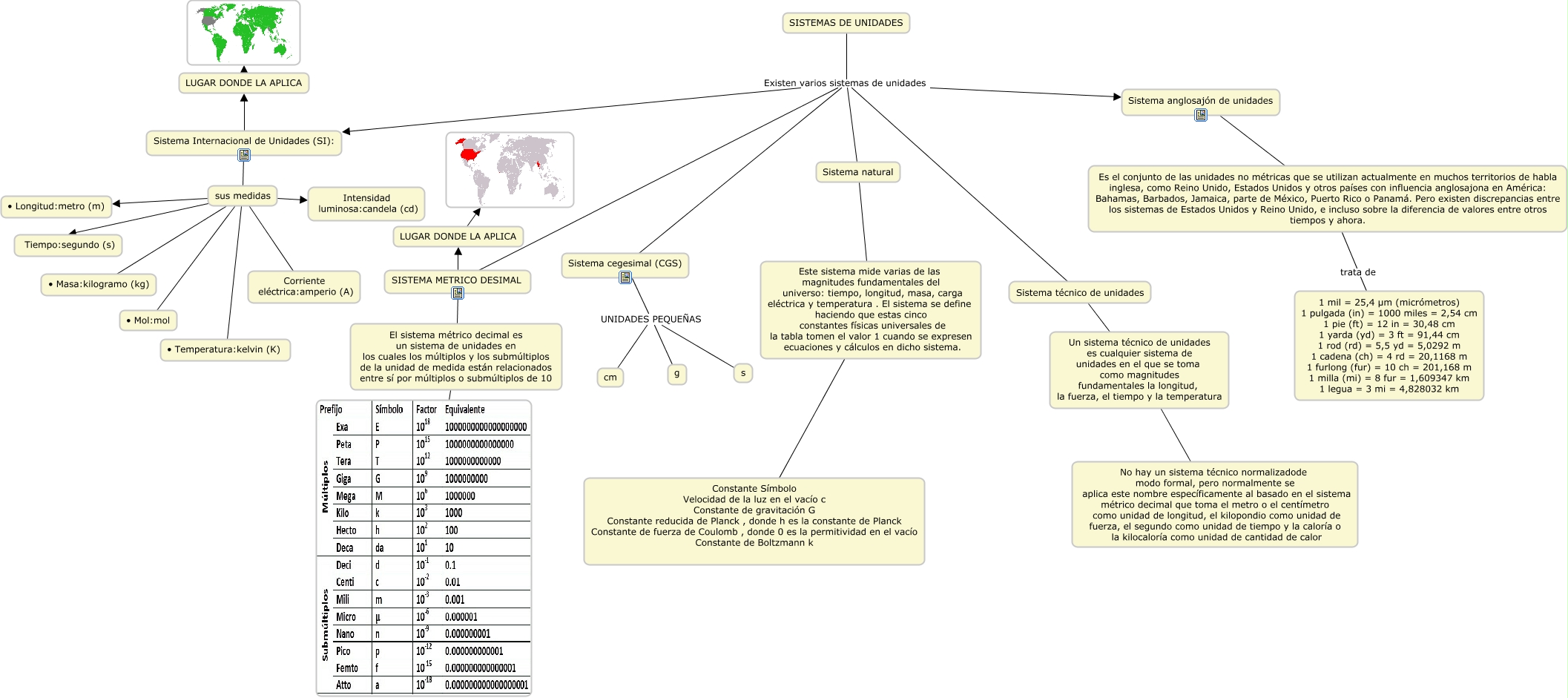 Este Cmap, tiene información relacionada con: sistema de unidades, SISTEMAS DE UNIDADES Existen varios sistemas de unidades Sistema natural, sus medidas Corriente eléctrica:amperio (A), Es el conjunto de las unidades no métricas que se utilizan actualmente en muchos territorios de habla inglesa, como Reino Unido, Estados Unidos y otros países con influencia anglosajona en América: Bahamas, Barbados, Jamaica, parte de México, Puerto Rico o Panamá. Pero existen discrepancias entre los sistemas de Estados Unidos y Reino Unido, e incluso sobre la diferencia de valores entre otros tiempos y ahora. trata de 1 mil = 25,4 µm (micrómetros) 1 pulgada (in) = 1000 miles = 2,54 cm 1 pie (ft) = 12 in = 30,48 cm 1 yarda (yd) = 3 ft = 91,44 cm 1 rod (rd) = 5,5 yd = 5,0292 m 1 cadena (ch) = 4 rd = 20,1168 m 1 furlong (fur) = 10 ch = 201,168 m 1 milla (mi) = 8 fur = 1,609347 km 1 legua = 3 mi = 4,828032 km, Sistema cegesimal (CGS) UNIDADES PEQUEÑAS s, sus medidas Tiempo:segundo (s), El sistema métrico decimal es un sistema de unidades en los cuales los múltiplos y los submúltiplos de la unidad de medida están relacionados entre sí por múltiplos o submúltiplos de 10, sus medidas • Mol:mol, Sistema natural Este sistema mide varias de las magnitudes fundamentales del universo: tiempo, longitud, masa, carga eléctrica y temperatura . El sistema se define haciendo que estas cinco constantes físicas universales de la tabla tomen el valor 1 cuando se expresen ecuaciones y cálculos en dicho sistema., Sistema cegesimal (CGS) UNIDADES PEQUEÑAS cm, sus medidas Intensidad luminosa:candela (cd), Un sistema técnico de unidades es cualquier sistema de unidades en el que se toma como magnitudes fundamentales la longitud, la fuerza, el tiempo y la temperatura No hay un sistema técnico normalizadode modo formal, pero normalmente se aplica este nombre específicamente al basado en el sistema métrico decimal que toma el metro o el centímetro como unidad de longitud, el kilopondio como unidad de fuerza, el segundo como unidad de tiempo y la caloría o la kilocaloría como unidad de cantidad de calor, sus medidas • Longitud:metro (m), Sistema cegesimal (CGS) UNIDADES PEQUEÑAS g, LUGAR DONDE LA APLICA, Sistema Internacional de Unidades (SI): LUGAR DONDE LA APLICA, sus medidas • Masa:kilogramo (kg), SISTEMAS DE UNIDADES Existen varios sistemas de unidades Sistema Internacional de Unidades (SI):, LUGAR DONDE LA APLICA, SISTEMAS DE UNIDADES Existen varios sistemas de unidades Sistema cegesimal (CGS), Sistema técnico de unidades Un sistema técnico de unidades es cualquier sistema de unidades en el que se toma como magnitudes fundamentales la longitud, la fuerza, el tiempo y la temperatura