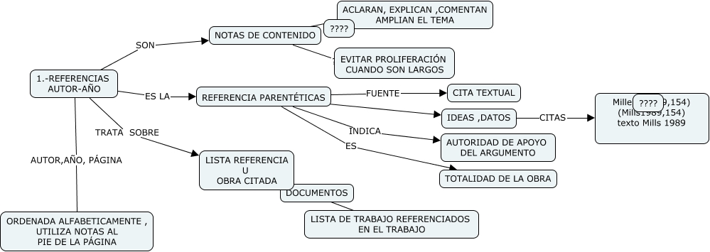 Este Cmap, tiene información relacionada con: refenencias autor año, 1.-REFERENCIAS AUTOR-AÑO TRATA SOBRE LISTA REFERENCIA U OBRA CITADA, 1.-REFERENCIAS AUTOR-AÑO SON NOTAS DE CONTENIDO, REFERENCIA PARENTÉTICAS INDICA AUTORIDAD DE APOYO DEL ARGUMENTO, REFERENCIA PARENTÉTICAS FUENTE CITA TEXTUAL, NOTAS DE CONTENIDO ???? ACLARAN, EXPLICAN ,COMENTAN AMPLIAN EL TEMA, NOTAS DE CONTENIDO ???? EVITAR PROLIFERACIÓN CUANDO SON LARGOS, 1.-REFERENCIAS AUTOR-AÑO AUTOR,AÑO, PÁGINA ORDENADA ALFABETICAMENTE , UTILIZA NOTAS AL PIE DE LA PÁGINA, IDEAS ,DATOS CITAS Miller ( 1989,154) (Mills1989,154) texto Mills 1989, LISTA REFERENCIA U OBRA CITADA ???? LISTA DE TRABAJO REFERENCIADOS EN EL TRABAJO, REFERENCIA PARENTÉTICAS ???? IDEAS ,DATOS, REFERENCIA PARENTÉTICAS ES TOTALIDAD DE LA OBRA, Miller ( 1989,154) (Mills1989,154) texto Mills 1989 ???? ????, 1.-REFERENCIAS AUTOR-AÑO ES LA REFERENCIA PARENTÉTICAS