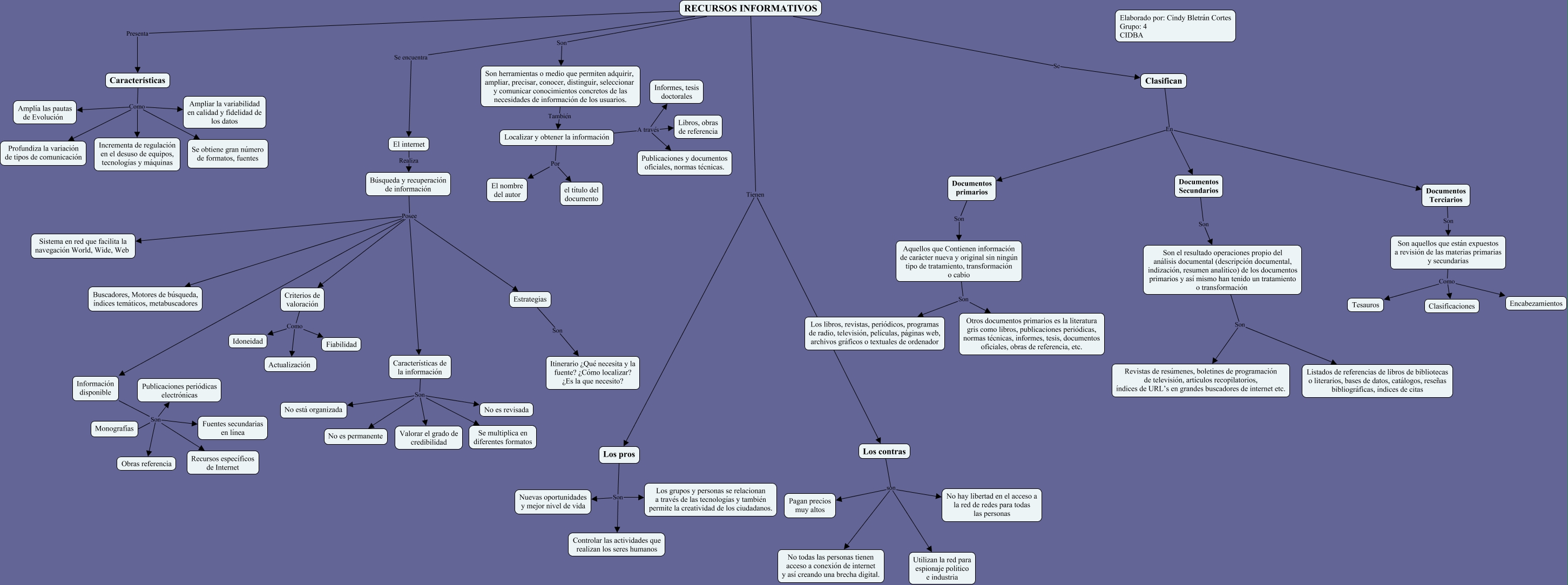 Este Cmap, tiene información relacionada con: Recursos informativos, Localizar y obtener la información Por El nombre del autor, Aquellos que Contienen información de carácter nueva y original sin ningún tipo de tratamiento, transformación o cabio Son Otros documentos primarios es la literatura gris como libros, publicaciones periódicas, normas técnicas, informes, tesis, documentos oficiales, obras de referencia, etc., Búsqueda y recuperación de información Posee Sistema en red que facilita la navegación World, Wide, Web, Características de la información Son No es permanente, RECURSOS INFORMATIVOS Se encuentra El internet, Los contras son Pagan precios muy altos, Son aquellos que están expuestos a revisión de las materias primarias y secundarias Como Encabezamientos, Búsqueda y recuperación de información Posee Criterios de valoración, Características de la información Son No es revisada, Información disponible Son Monografías, Los contras son No hay libertad en el acceso a la red de redes para todas las personas, Documentos primarios Son Aquellos que Contienen información de carácter nueva y original sin ningún tipo de tratamiento, transformación o cabio, Clasifican En Documentos Secundarios, Los contras son No todas las personas tienen acceso a conexión de internet y así creando una brecha digital., Estrategias Son Itinerario ¿Qué necesita y la fuente? ¿Cómo localizar? ¿Es la que necesito?, El internet Realiza Búsqueda y recuperación de información, Son aquellos que están expuestos a revisión de las materias primarias y secundarias Como Clasificaciones, Aquellos que Contienen información de carácter nueva y original sin ningún tipo de tratamiento, transformación o cabio Son Los libros, revistas, periódicos, programas de radio, televisión, películas, páginas web, archivos gráficos o textuales de ordenador, Los pros Son Controlar las actividades que realizan los seres humanos, RECURSOS INFORMATIVOS Tienen Los pros