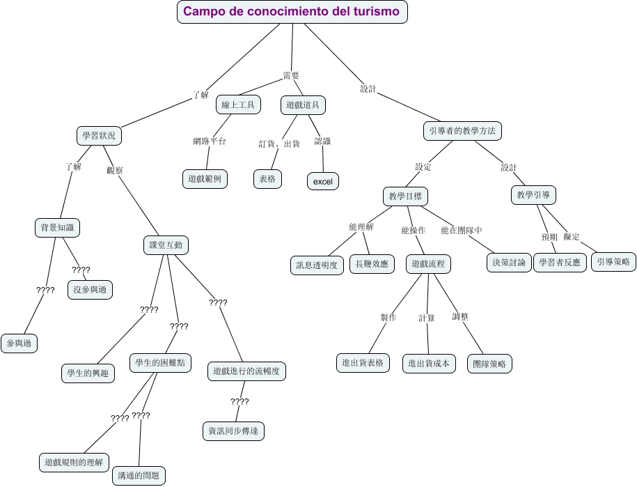 Este Cmap, tiene información relacionada con: turismo, 學生的困難點 ???? 溝通的問題, 課堂互動 ???? 學生的困難點, 引導者的教學方法 設計 教學引導, 教學目標 能理解 訊息透明度, Campo de conocimiento del turismo 需要 遊戲道具, 教學引導 預期 學習者反應, 遊戲進行的流暢度 ???? 資訊同步傳達, 線上工具 網路平台 遊戲範例, 引導者的教學方法 設定 教學目標, 學習狀況 了解 背景知識, 遊戲流程 製作 進出貨表格, Campo de conocimiento del turismo 了解 學習狀況, 遊戲道具 認識 excel, 教學目標 能操作 遊戲流程, 教學目標 能理解 長鞭效應, Campo de conocimiento del turismo 需要 線上工具, 遊戲流程 調整 團隊策略, 教學目標 能在團隊中 決策討論, 遊戲流程 計算 進出貨成本, 學生的困難點 ???? 遊戲規則的理解