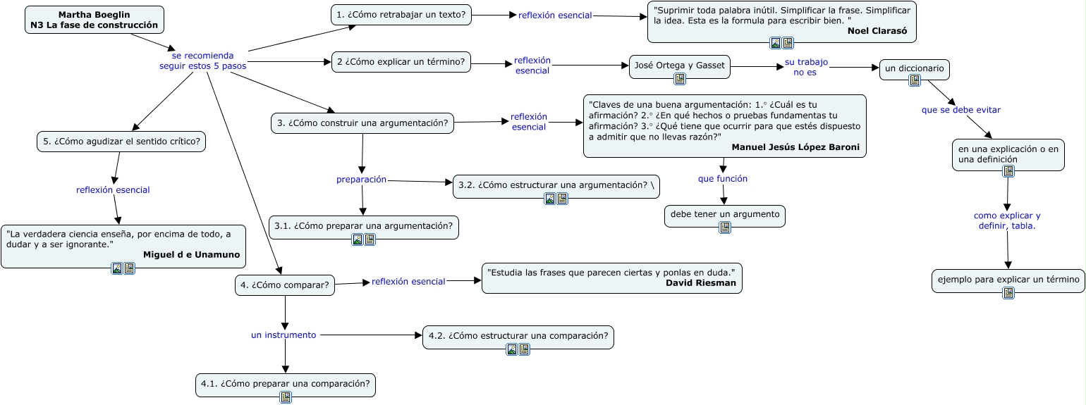 Este Cmap, tiene información relacionada con: La fase de construcción, en una explicación o en una definición como explicar y definir, tabla. ejemplo para explicar un término, "Claves de una buena argumentación: 1.° ¿Cuál es tu afirmación? 2.° ¿En qué hechos o pruebas fundamentas tu afirmación? 3.° ¿Qué tiene que ocurrir para que estés dispuesto a admitir que no llevas razón?" Manuel Jesús López Baroni que función debe tener un argumento, 2 ¿Cómo explicar un término? reflexión esencial José Ortega y Gasset, 4. ¿Cómo comparar? un instrumento 4.1. ¿Cómo preparar una comparación?, Martha Boeglin N3 La fase de construcción se recomienda seguir estos 5 pasos 1. ¿Cómo retrabajar un texto?, un diccionario que se debe evitar en una explicación o en una definición, 1. ¿Cómo retrabajar un texto? reflexión esencial "Suprimir toda palabra inútil. Simplificar la frase. Simplificar la idea. Esta es la formula para escribir bien. " Noel Clarasó, 3. ¿Cómo construir una argumentación? preparación 3.1. ¿Cómo preparar una argumentación?, 5. ¿Cómo agudizar el sentido crítico? reflexión esencial "La verdadera ciencia enseña, por encima de todo, a dudar y a ser ignorante." Miguel d e Unamuno, 4. ¿Cómo comparar? un instrumento 4.2. ¿Cómo estructurar una comparación?, Martha Boeglin N3 La fase de construcción se recomienda seguir estos 5 pasos 5. ¿Cómo agudizar el sentido crítico?, 4. ¿Cómo comparar? reflexión esencial "Estudia las frases que parecen ciertas y ponlas en duda." David Riesman, Martha Boeglin N3 La fase de construcción se recomienda seguir estos 5 pasos 3. ¿Cómo construir una argumentación?, José Ortega y Gasset su trabajo no es un diccionario, 3. ¿Cómo construir una argumentación? preparación 3.2. ¿Cómo estructurar una argumentación? \, 3. ¿Cómo construir una argumentación? reflexión esencial "Claves de una buena argumentación: 1.° ¿Cuál es tu afirmación? 2.° ¿En qué hechos o pruebas fundamentas tu afirmación? 3.° ¿Qué tiene que ocurrir para que estés dispuesto a admitir que no llevas razón?" Manuel Jesús López Baroni, Martha Boeglin N3 La fase de construcción se recomienda seguir estos 5 pasos 4. ¿Cómo comparar?, Martha Boeglin N3 La fase de construcción se recomienda seguir estos 5 pasos 2 ¿Cómo explicar un término?